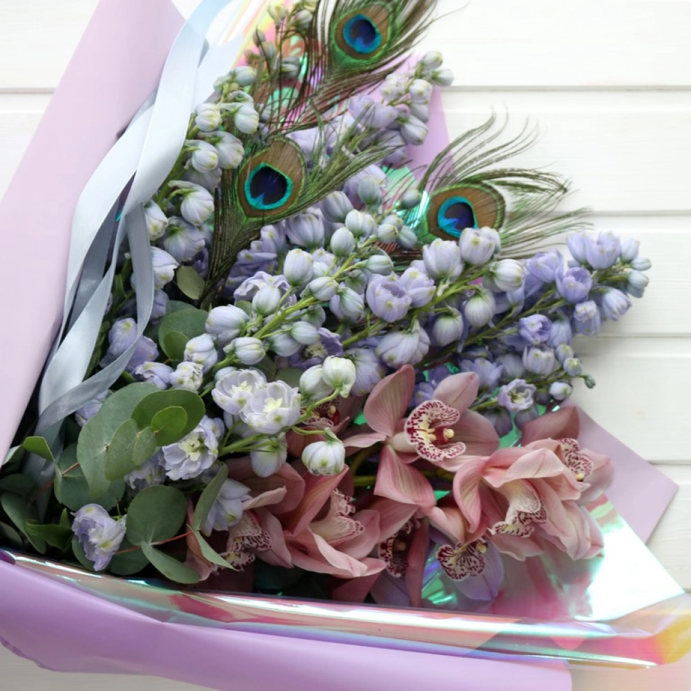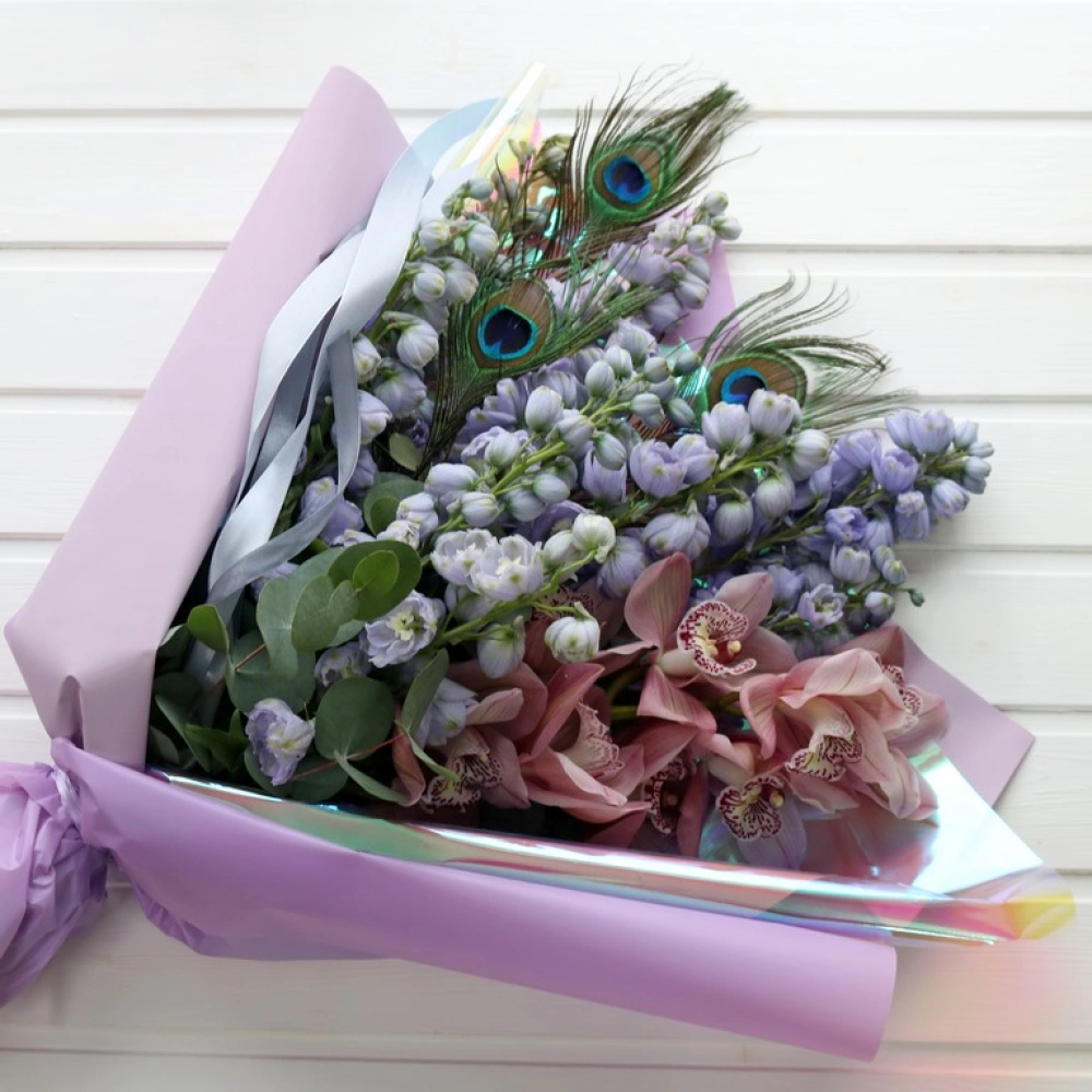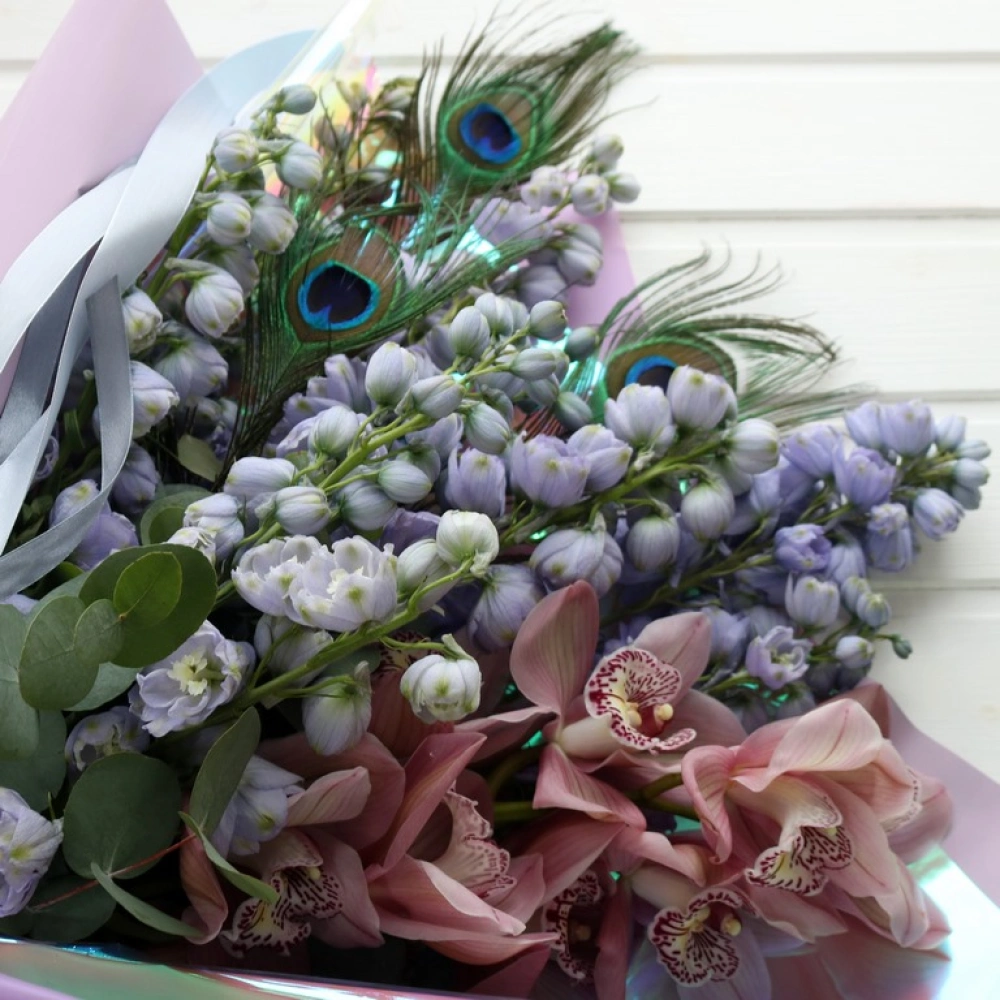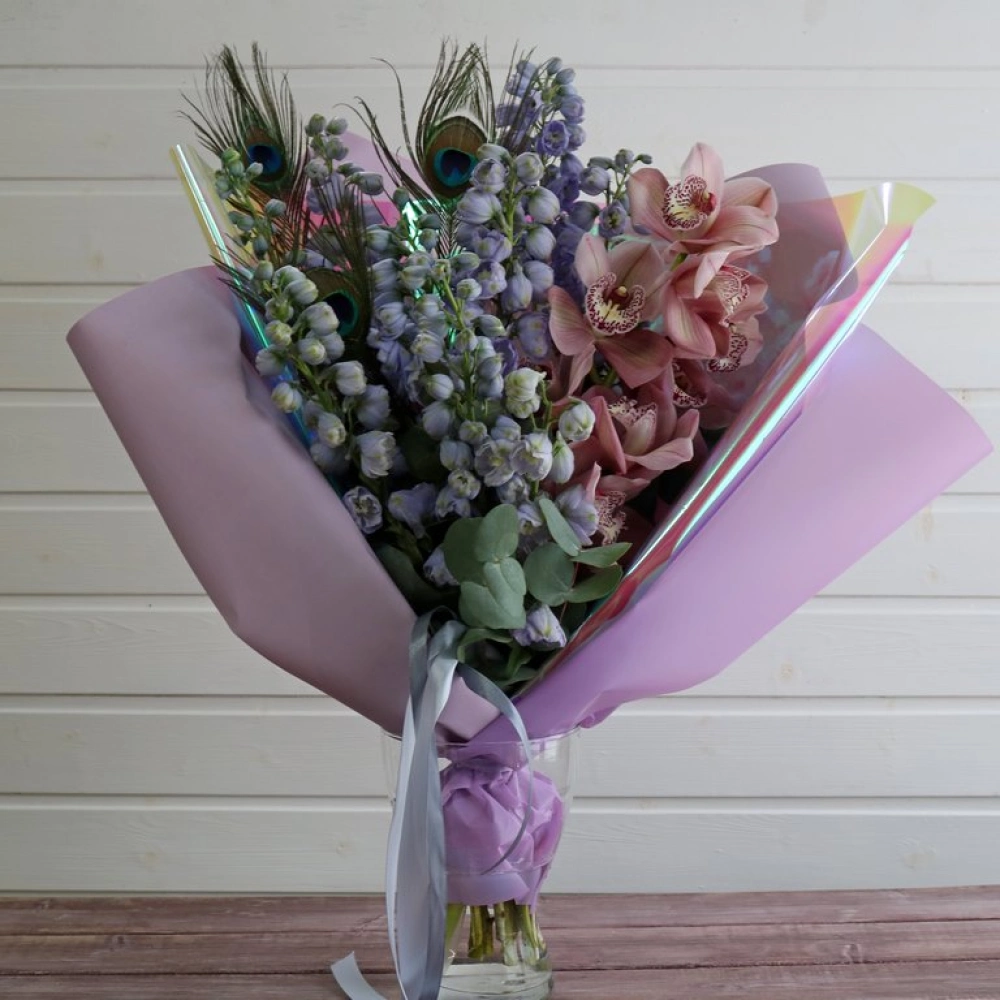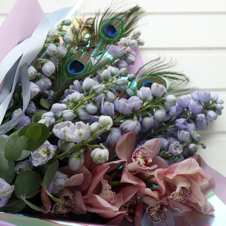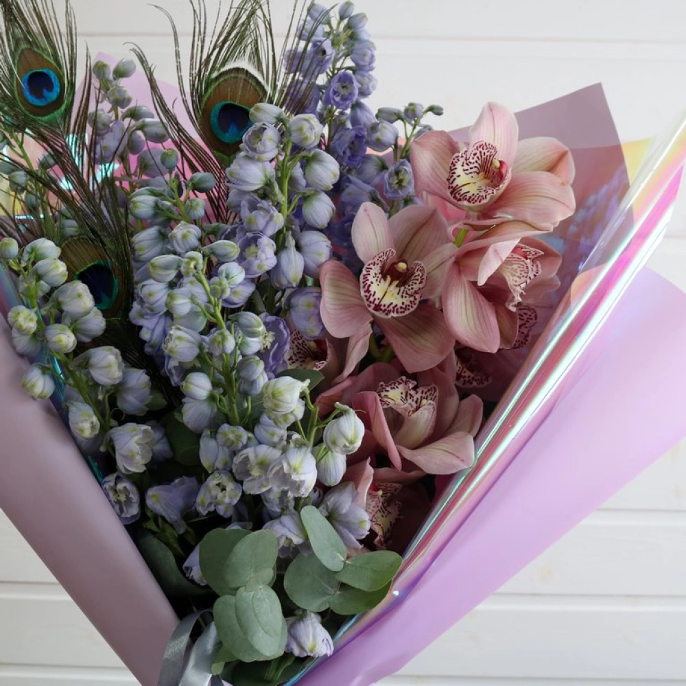 Дельфиниум и орхидея букет