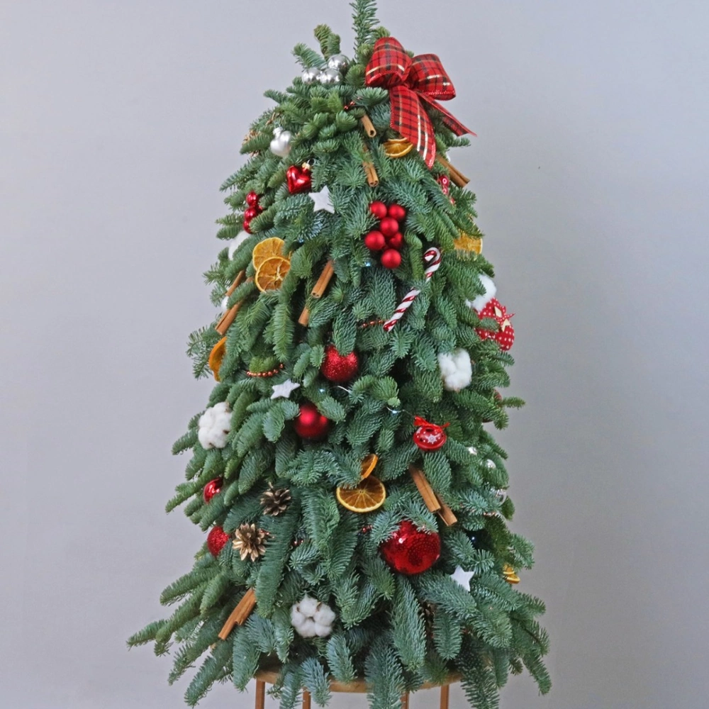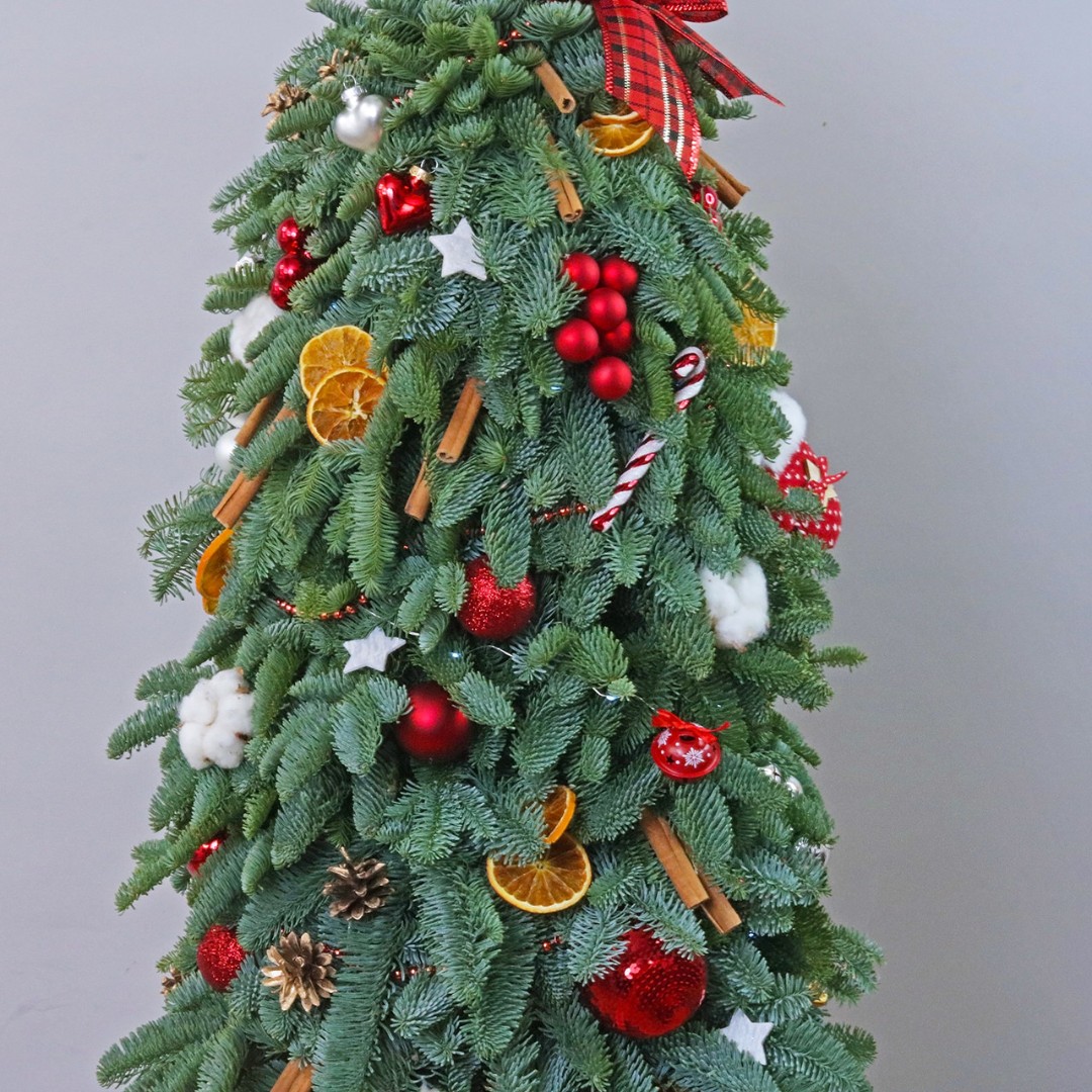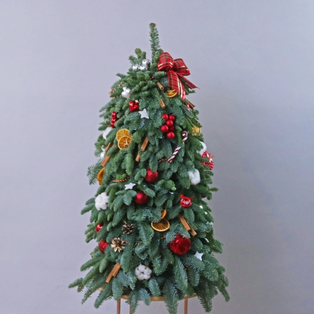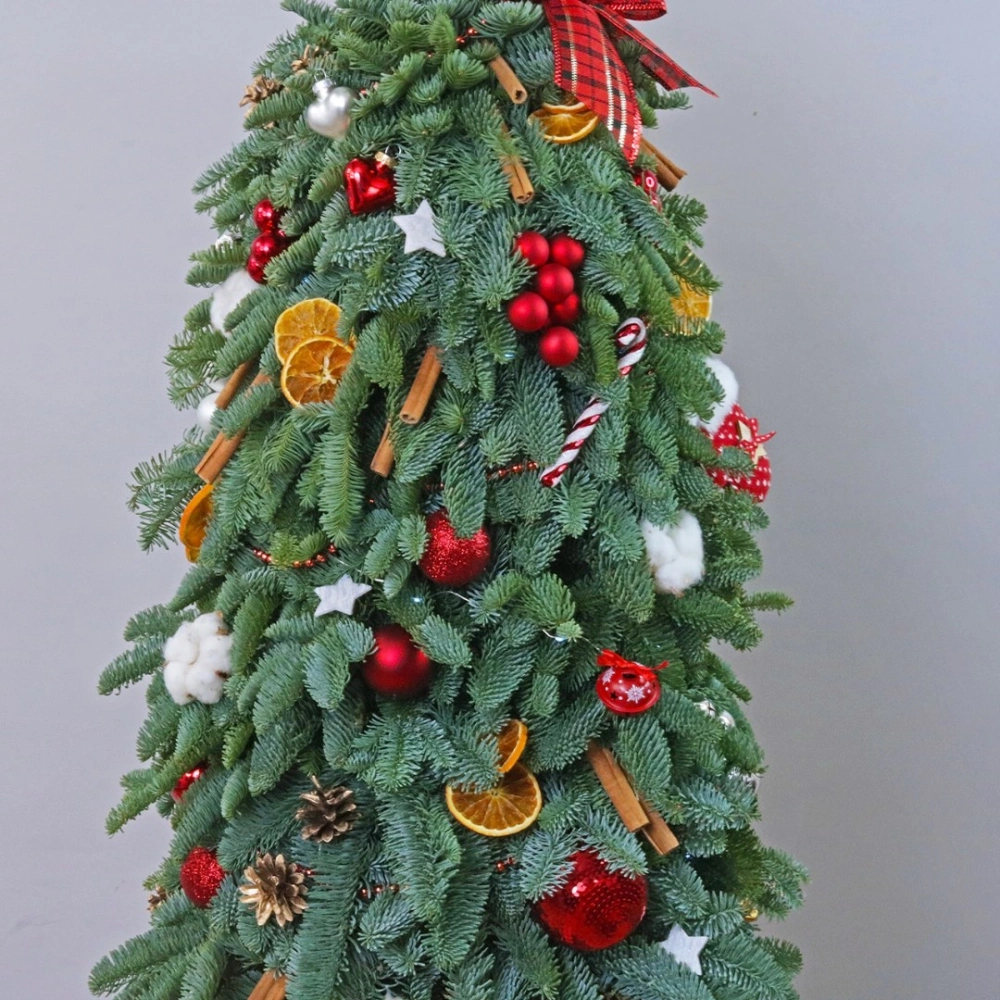 Добавьте волшебство и уют в свой дом с этой изысканной елочкой из натурального нобилтса. Ее густая зеленая хвоя идеально подходит для украшения, не осыпается и сохраняет свою красоту на протяжении всего праздничного сезона. Красные шары, сушеные апельсины, корица и золотистые шишки и хлопок, придают елочке особый шарм и создают неповторимый праздничный вид. Эта елочка станет прекрасным украшением вашего интерьера и создаст уютную атмосферу праздника. Позвольте себе насладиться красотой и долговечностью этой натуральной елочки, которая станет прекрасным символом праздничного настроения в вашем доме