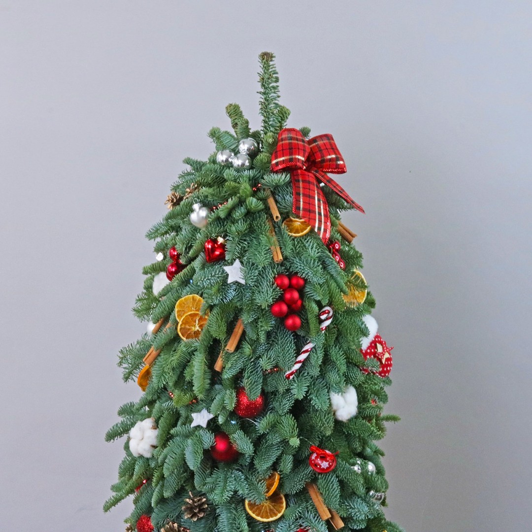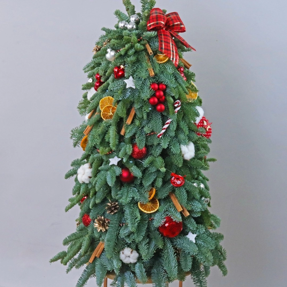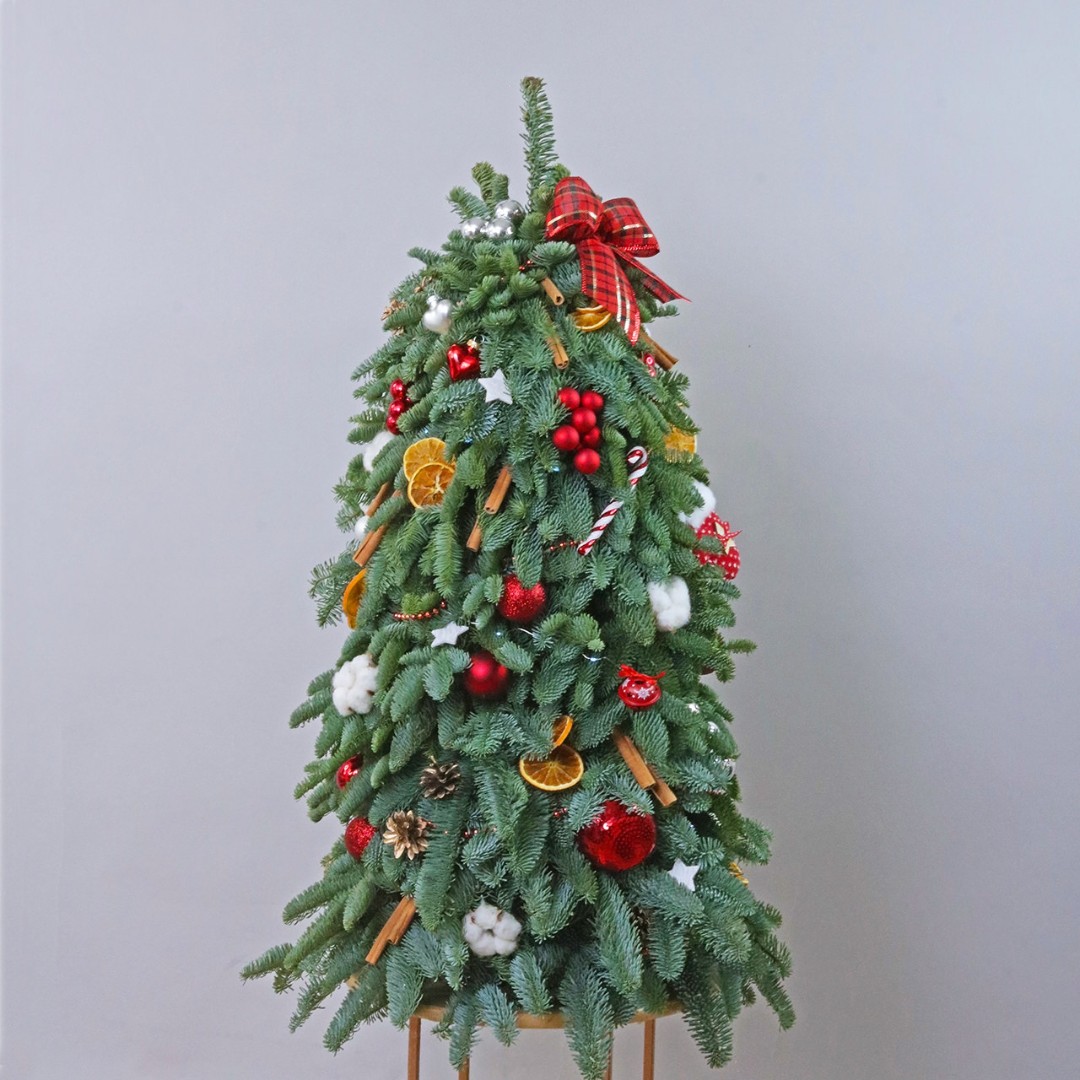 Добавьте волшебство и уют в свой дом с этой изысканной елочкой из натурального нобилтса. Ее густая зеленая хвоя идеально подходит для украшения, не осыпается и сохраняет свою красоту на протяжении всего праздничного сезона. Красные шары, сушеные апельсины, корица и золотистые шишки и хлопок, придают елочке особый шарм и создают неповторимый праздничный вид. Эта елочка станет прекрасным украшением вашего интерьера и создаст уютную атмосферу праздника. Позвольте себе насладиться красотой и долговечностью этой натуральной елочки, которая станет прекрасным символом праздничного настроения в вашем доме