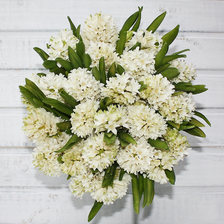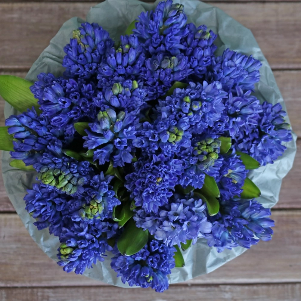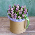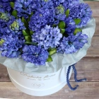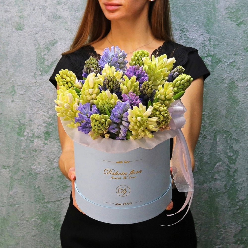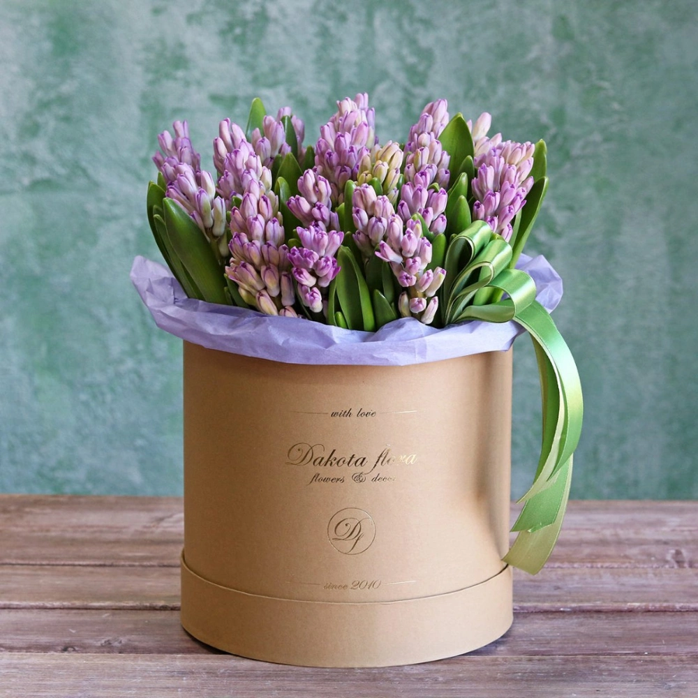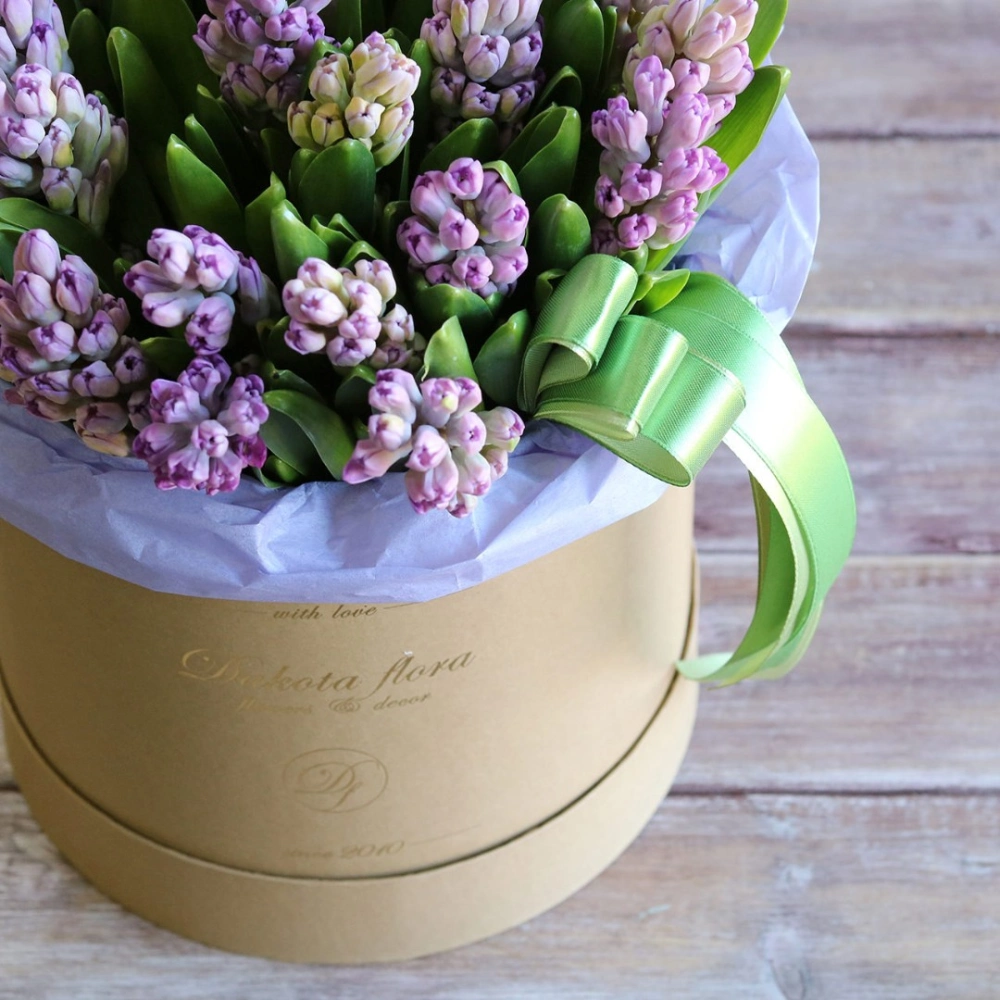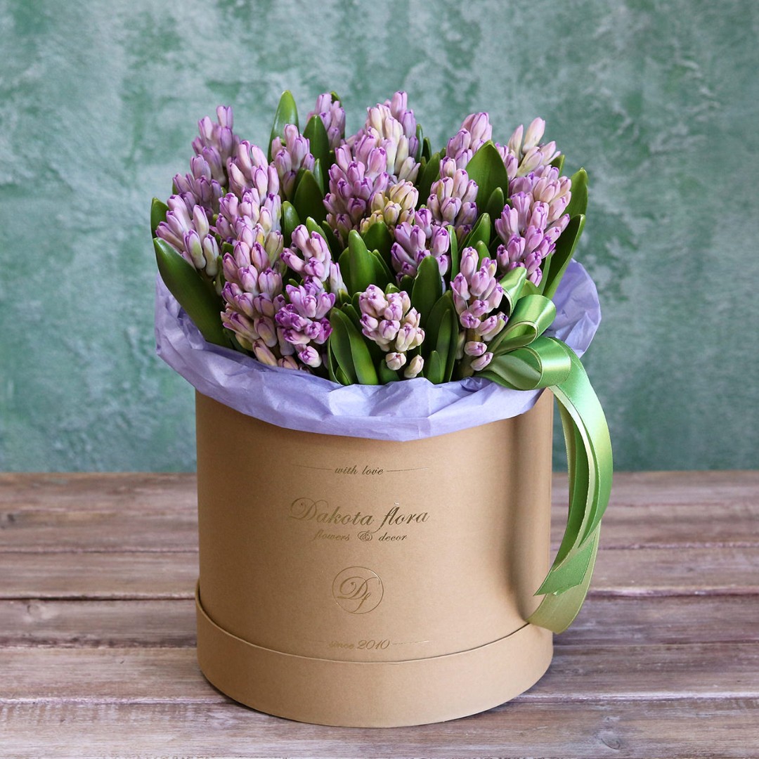 Фиолетовые гиацинты в коробке. На фотографии 25 шт. Цветы гиацинта очень стойки и ароматные. Вы можете выбрать любое количество цветов представленное в перечне к данному букету.