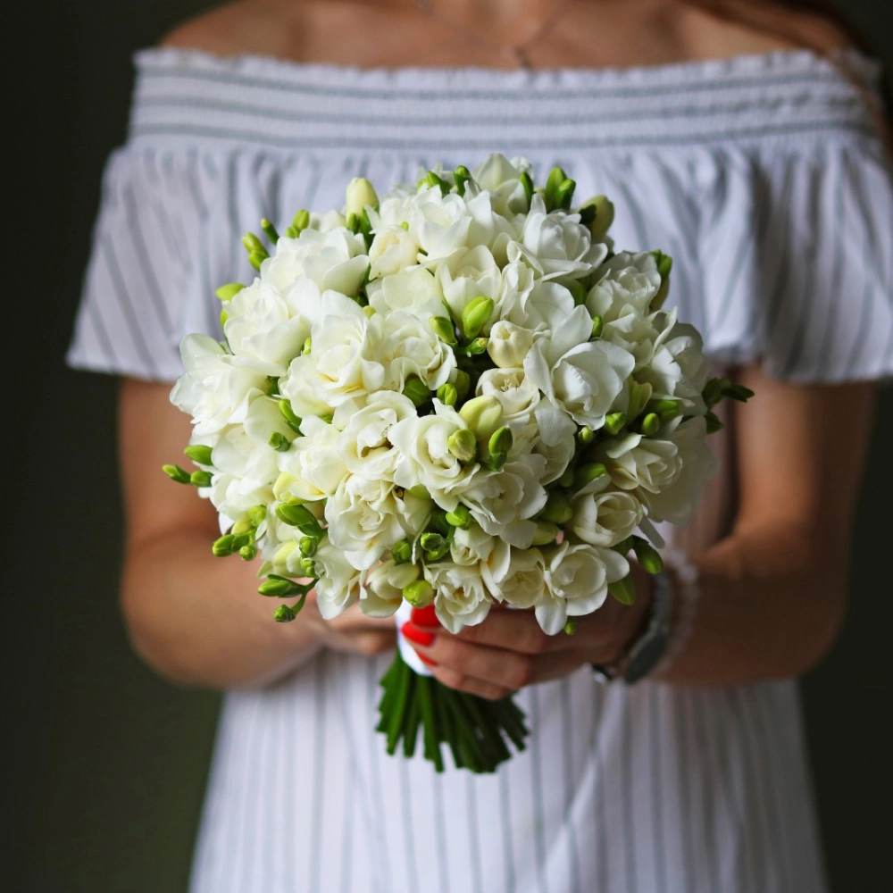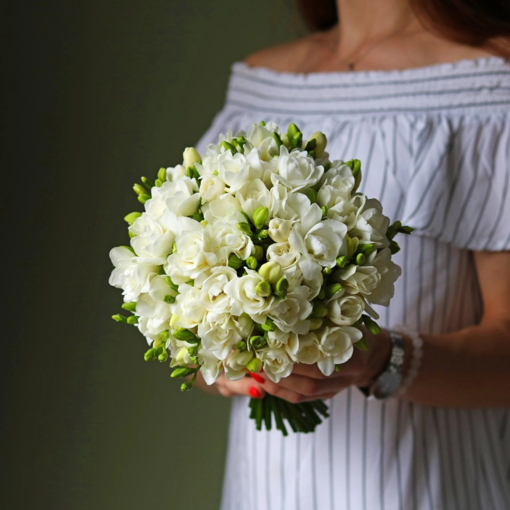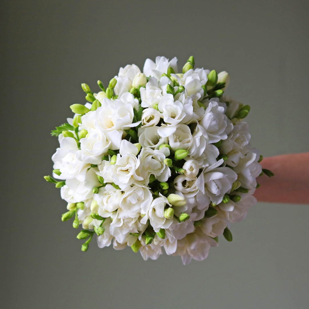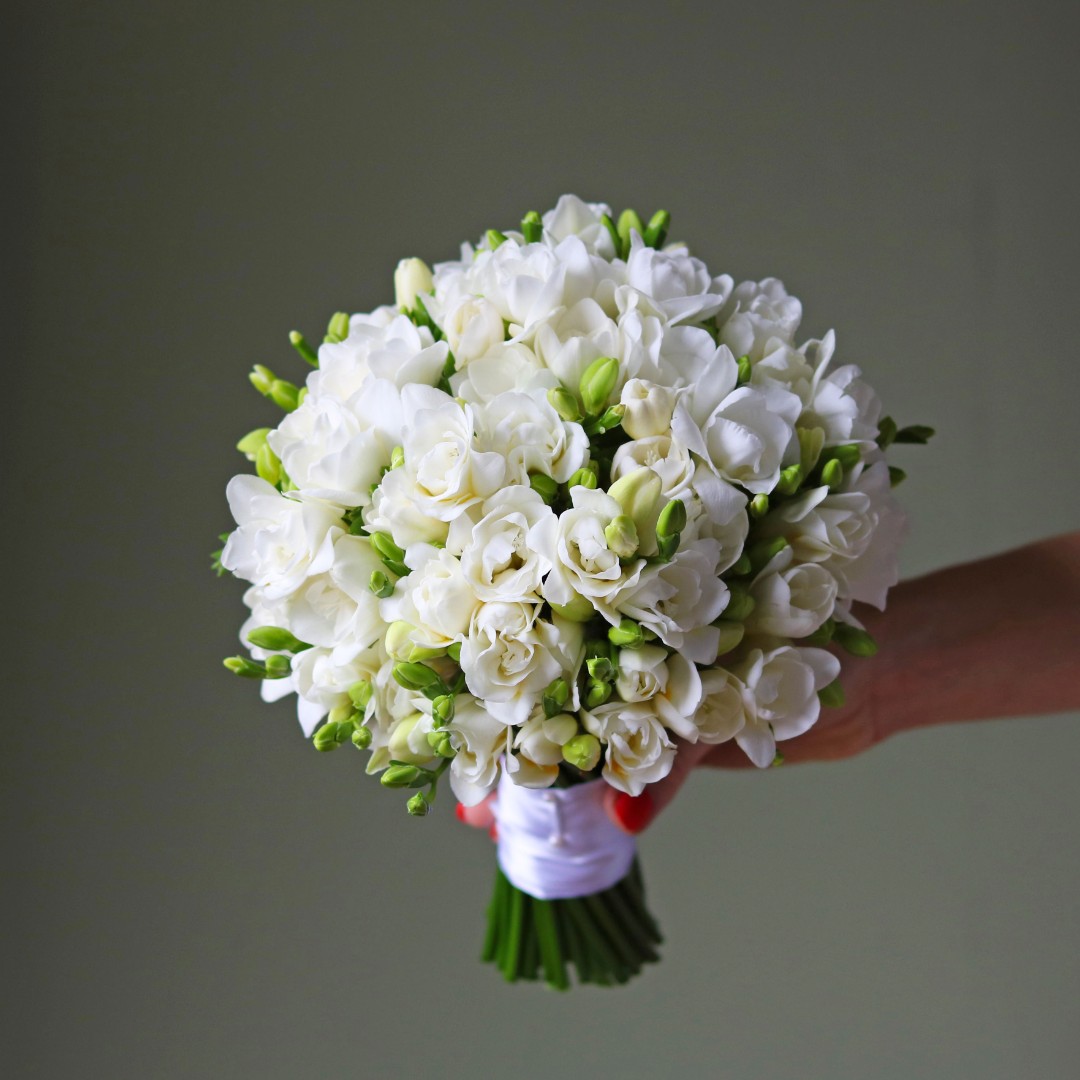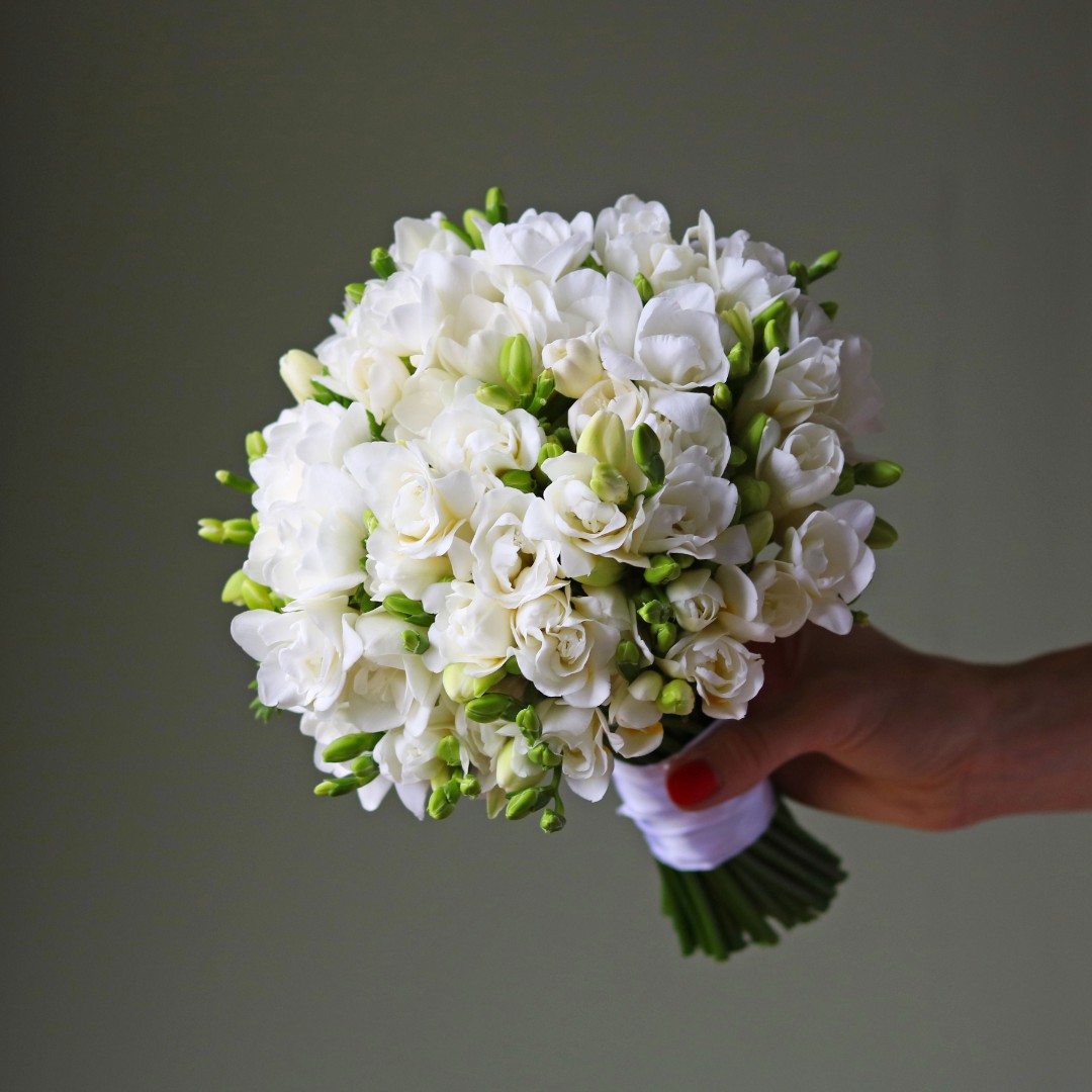 Букет невесты из фрезий. Бутоньерка для жениха в подарок. Белая ароматная фрезия в свадебном букете, нежная и стойкая, букет сохранит свой внешний вид в течении дня. Свадебный букет классической круглой формы белого цвета. Ножка букета декорирована атласными лентами.