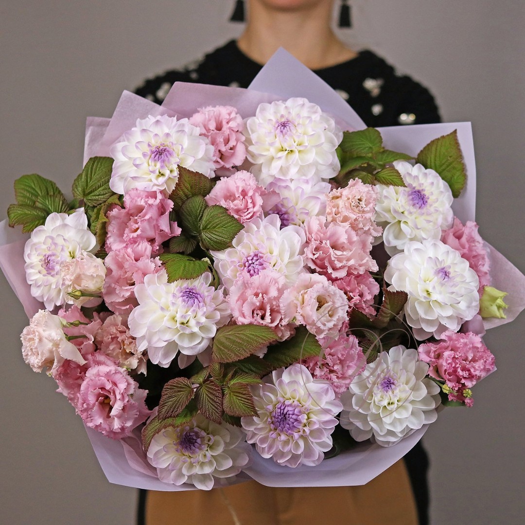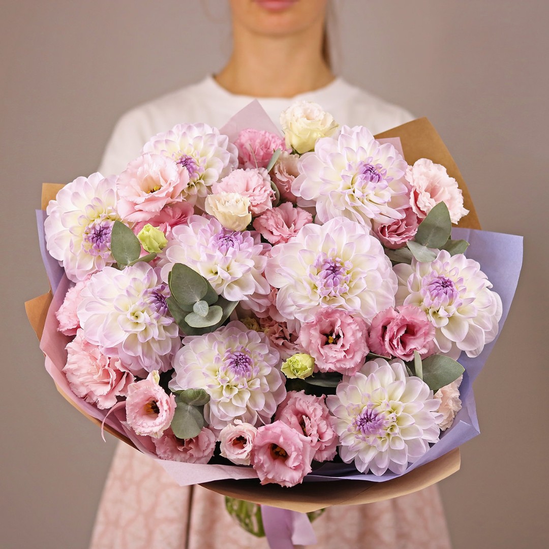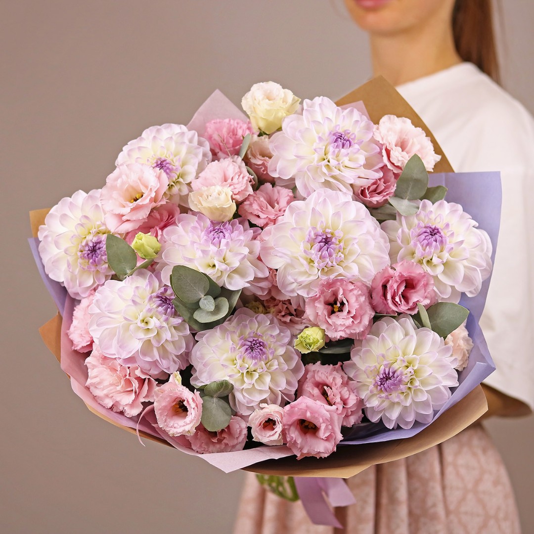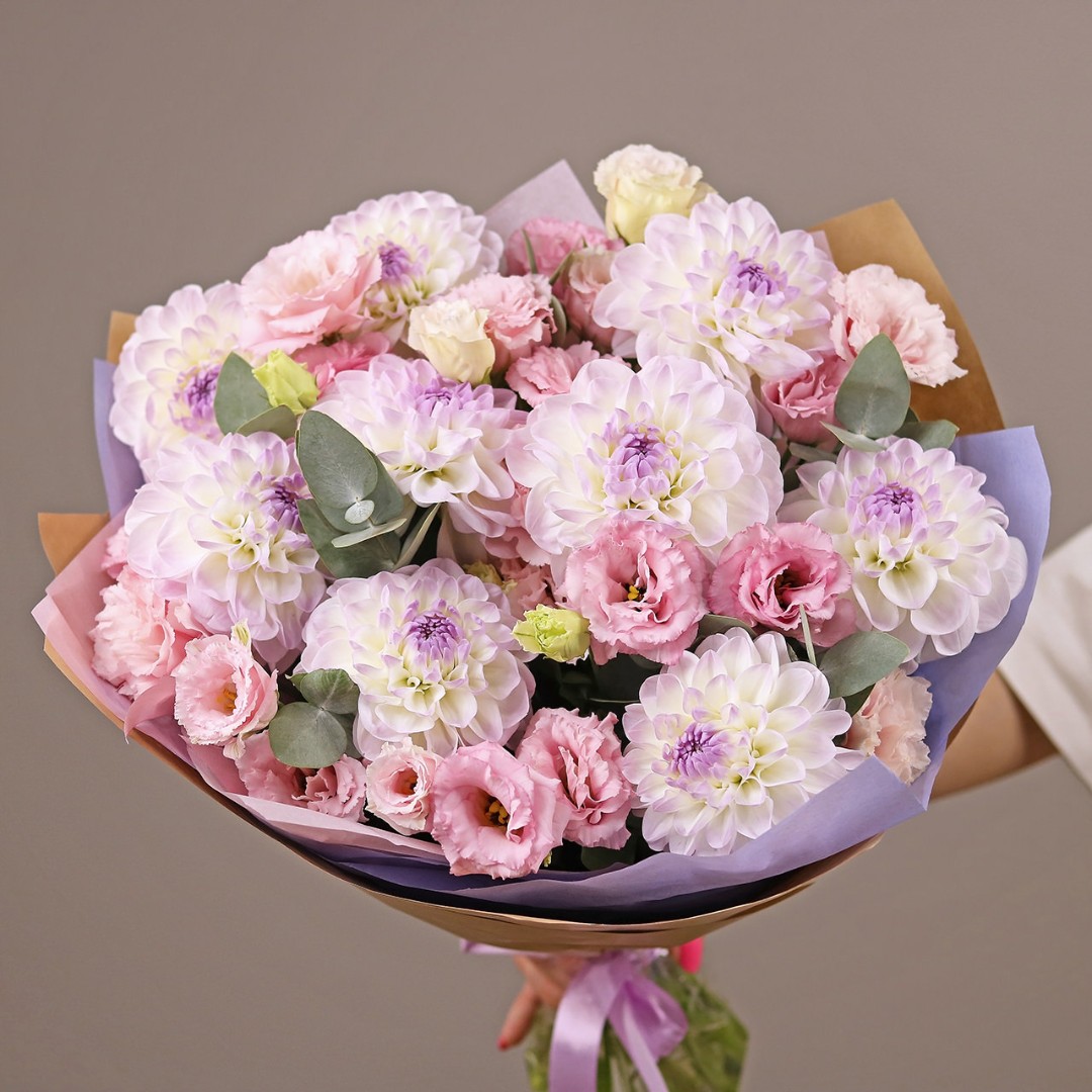 Букет из Георгин и эустомы. Вы можете выбрать любое количество цветов указанное в перечне к данному букету.