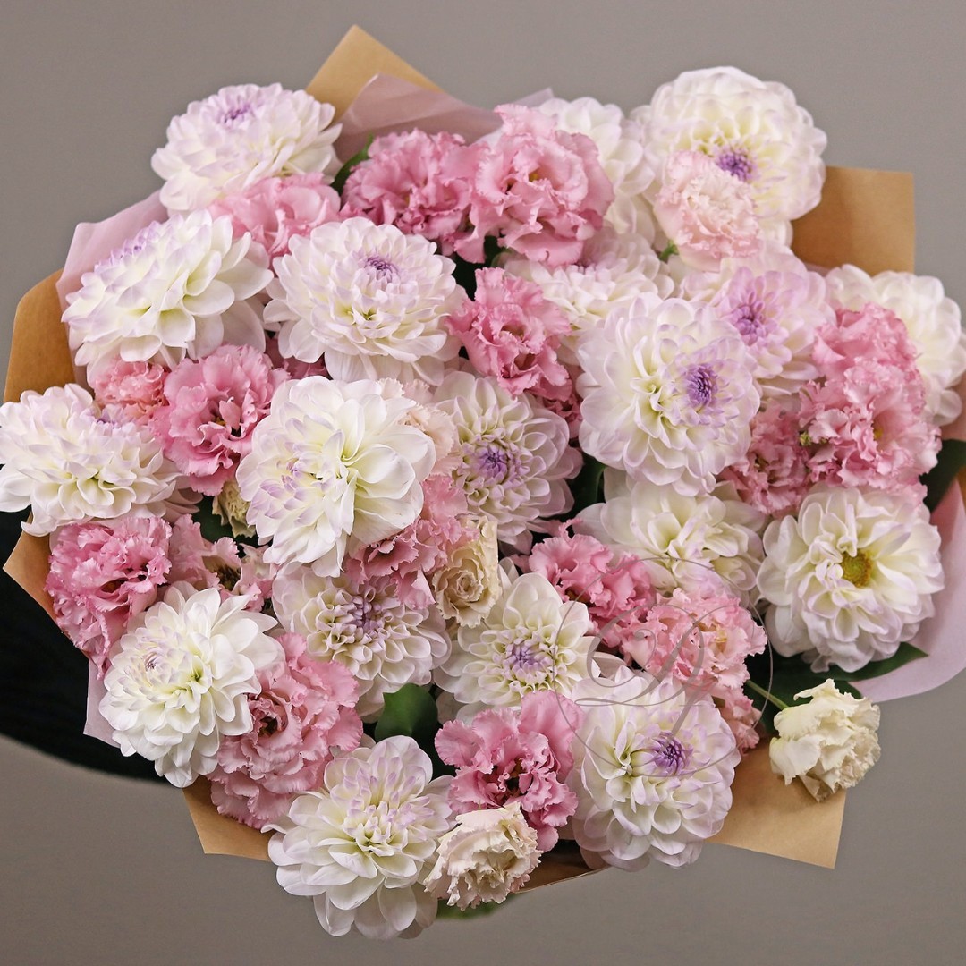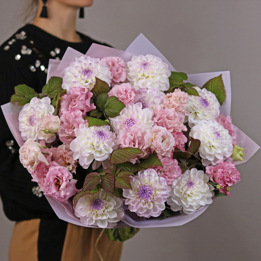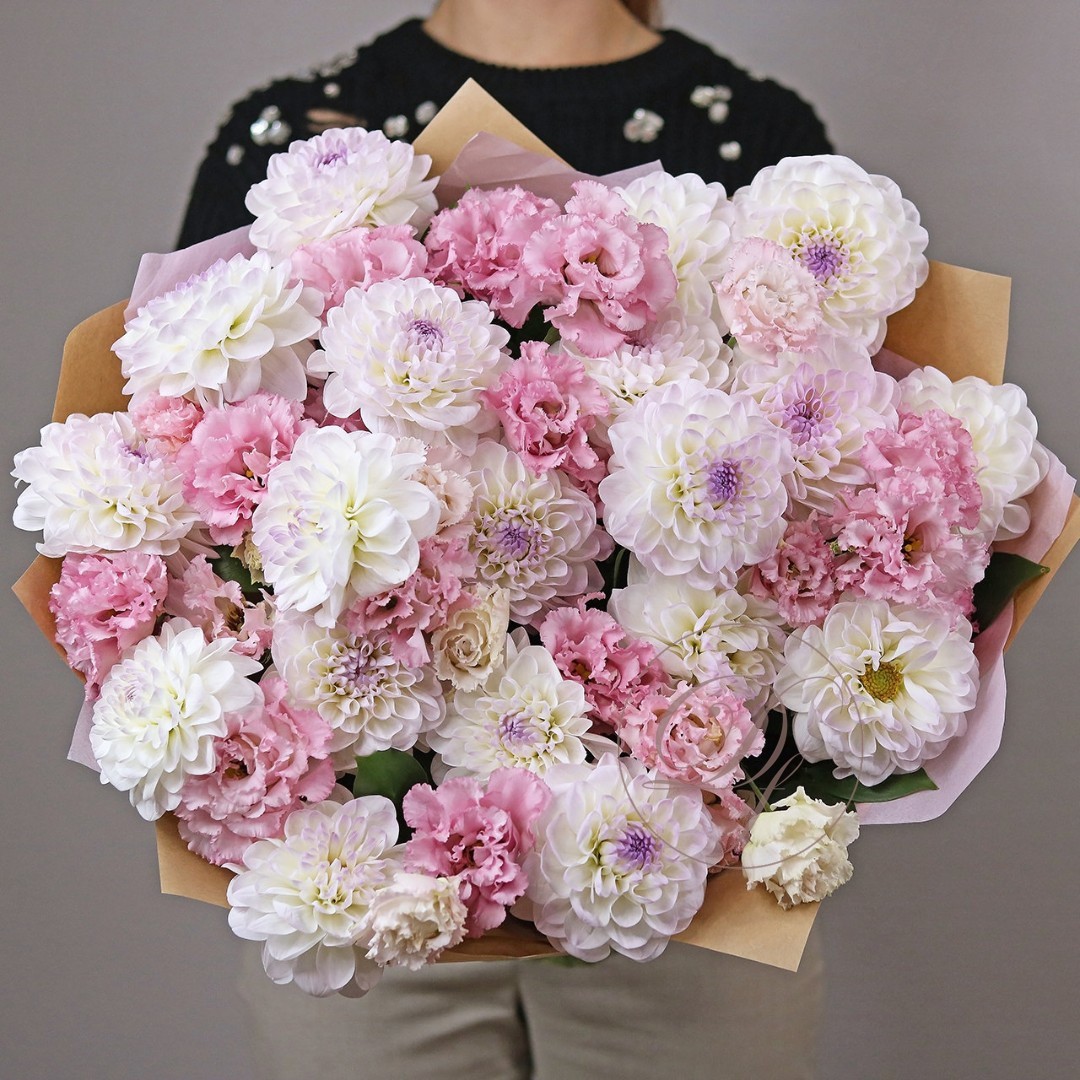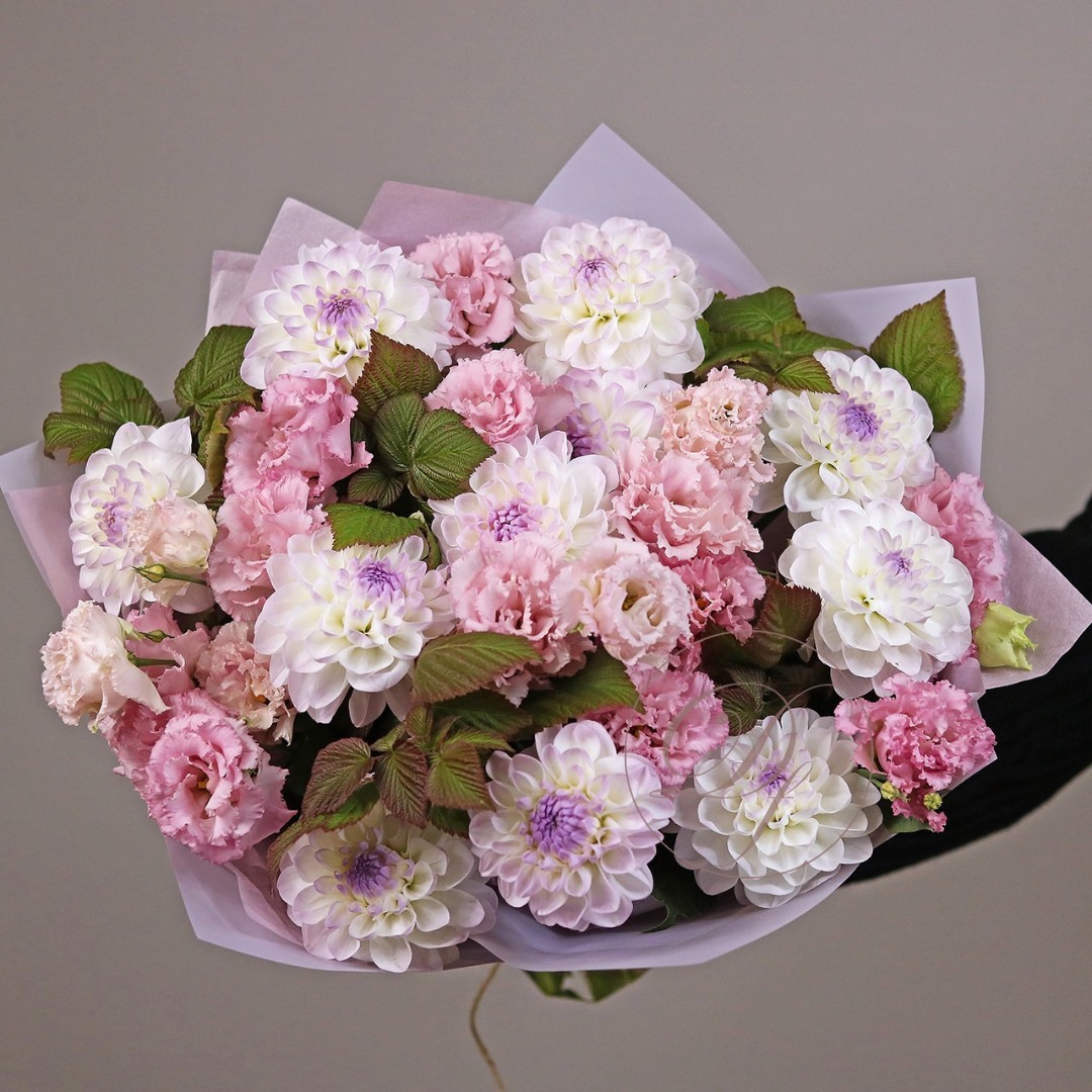 Букет из Георгин и эустомы. Вы можете выбрать любое количество цветов указанное в перечне к данному букету.