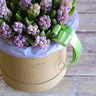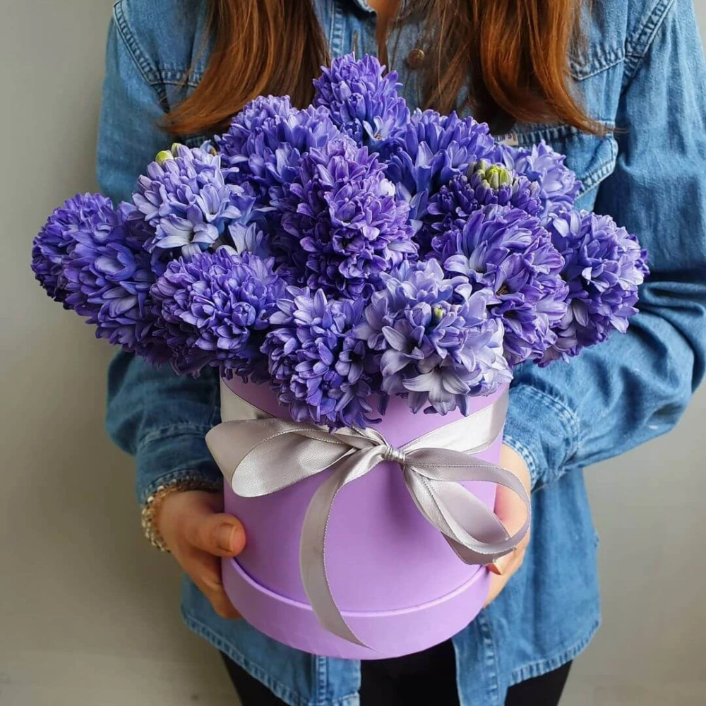 Фиолетовые гиацинты в коробке. На фотографии 25 шт. Цветы гиацинта очень стойки и ароматные. Вы можете выбрать любое количество цветов представленное в перечне к данному букету.