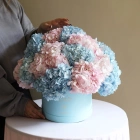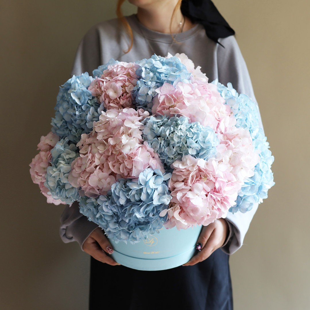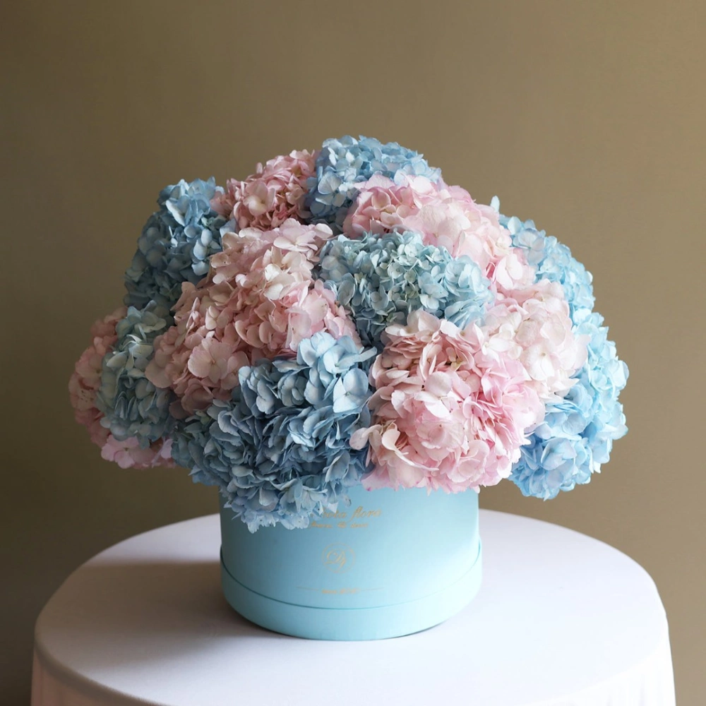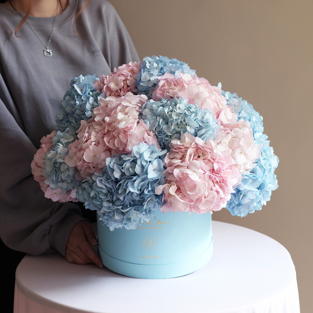 Голубая и розовая гортензия в коробке