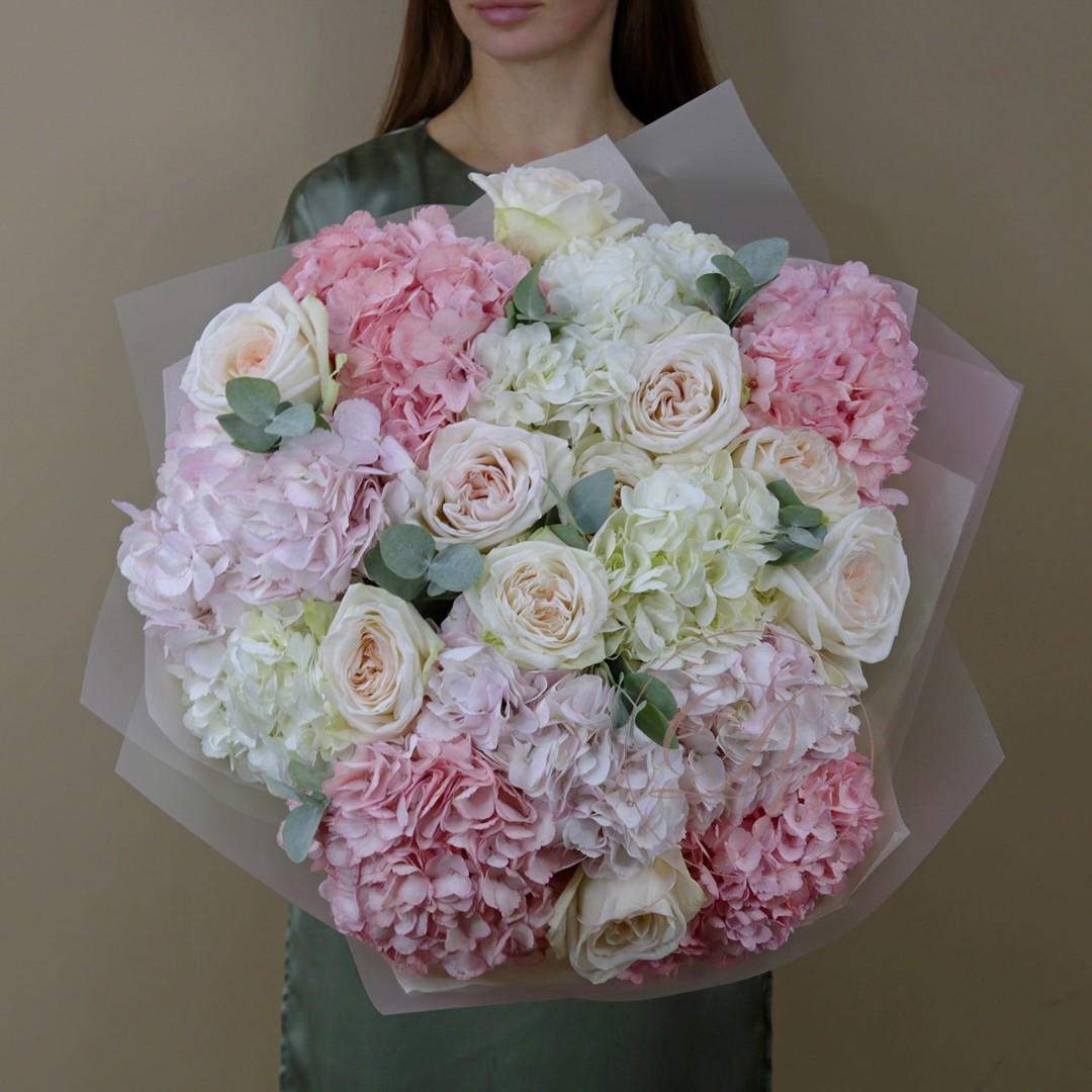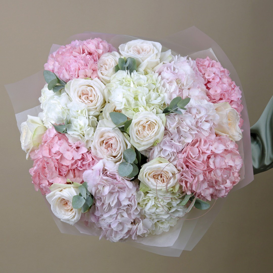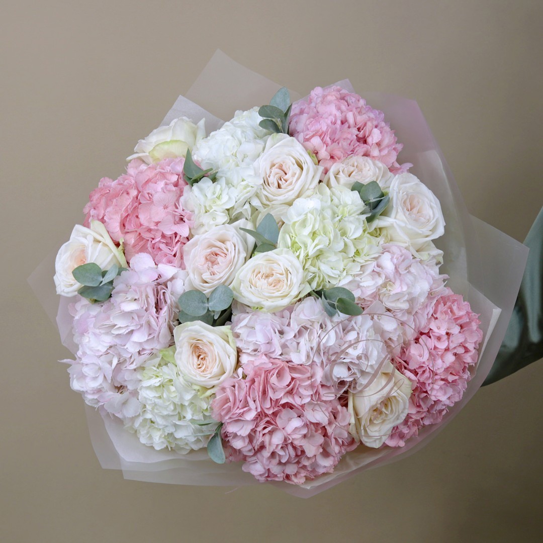 Букет из розовых и белых шапочек гортензии с ароматными розами Вайт Охара. Вы можете выбрать любой из представленных размеров в перечне к этому букету.
