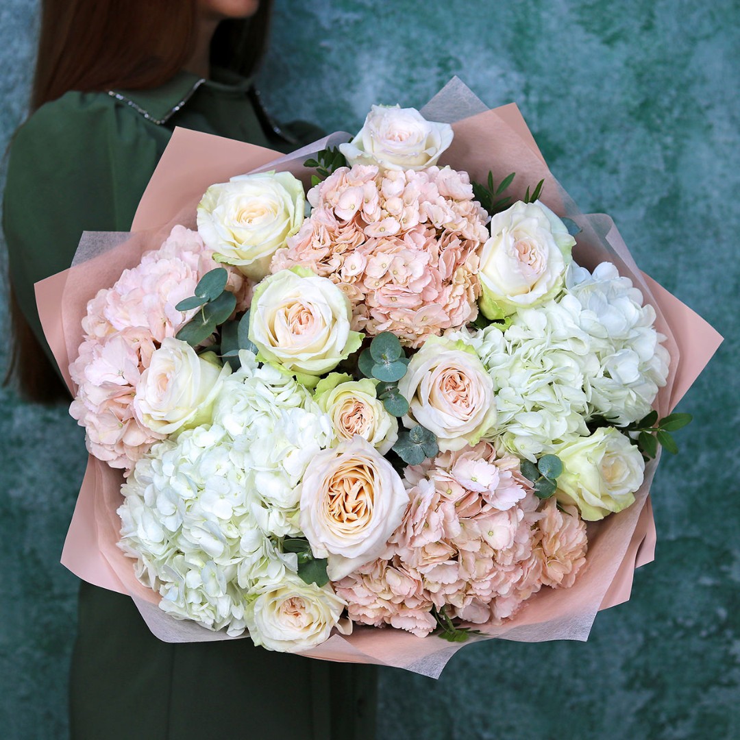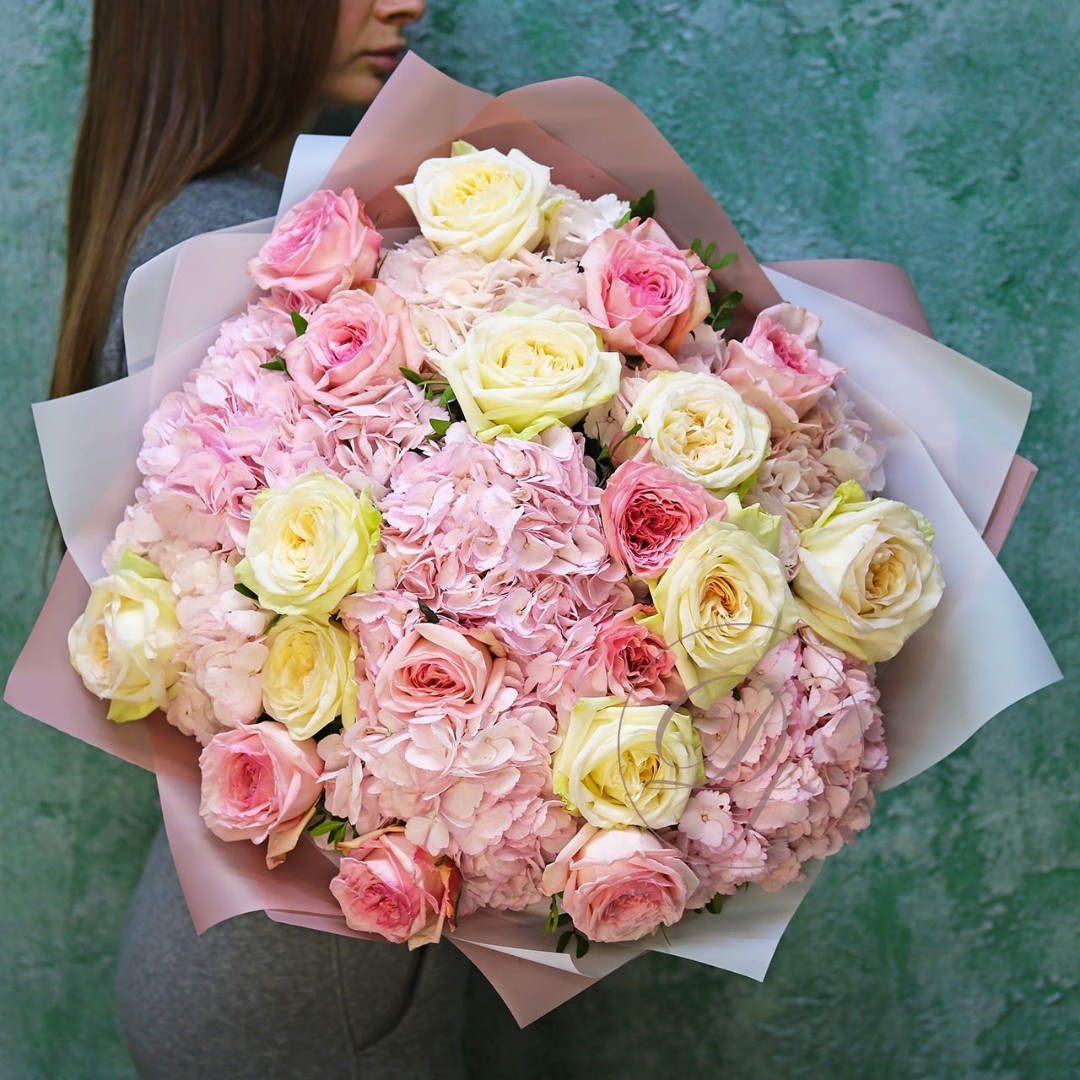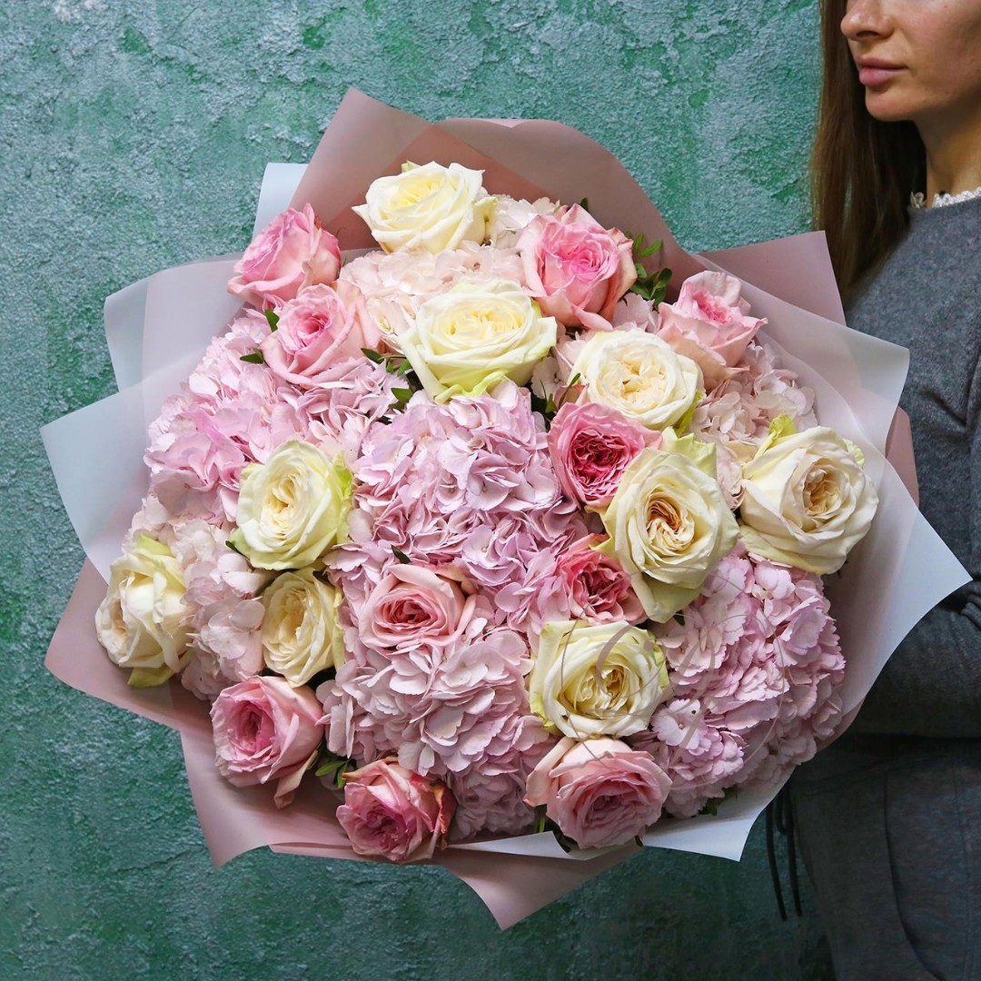 Букет из розовых и белых шапочек гортензии с ароматными розами Вайт Охара. Вы можете выбрать любой из представленных размеров в перечне к этому букету.