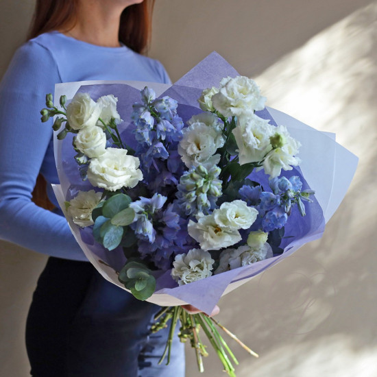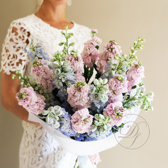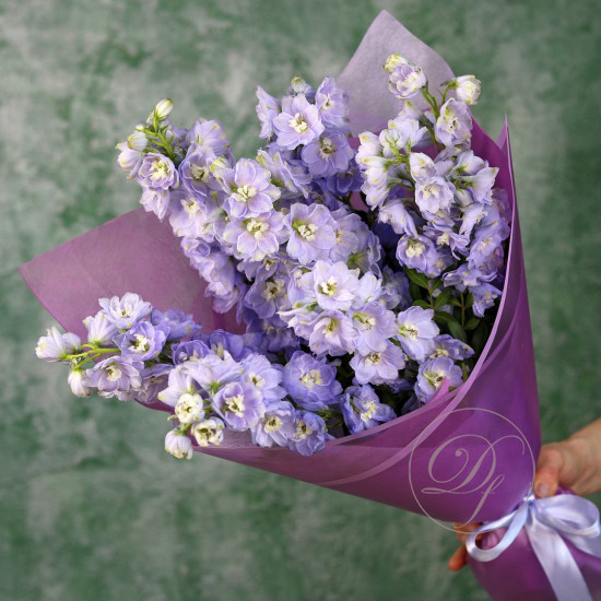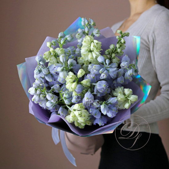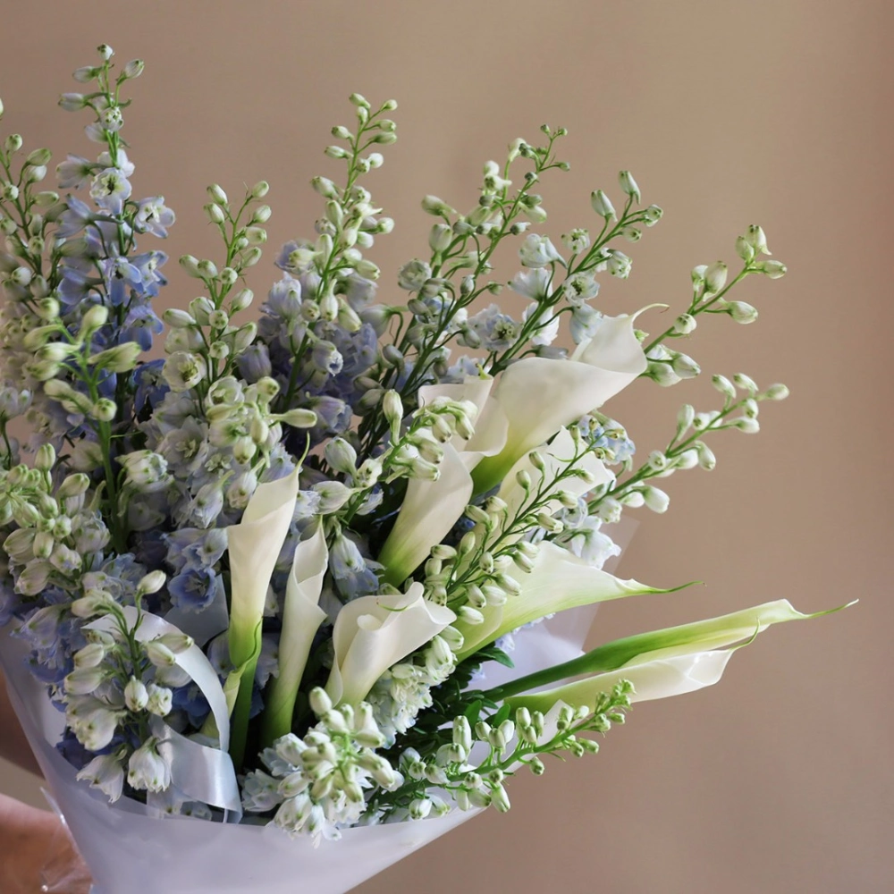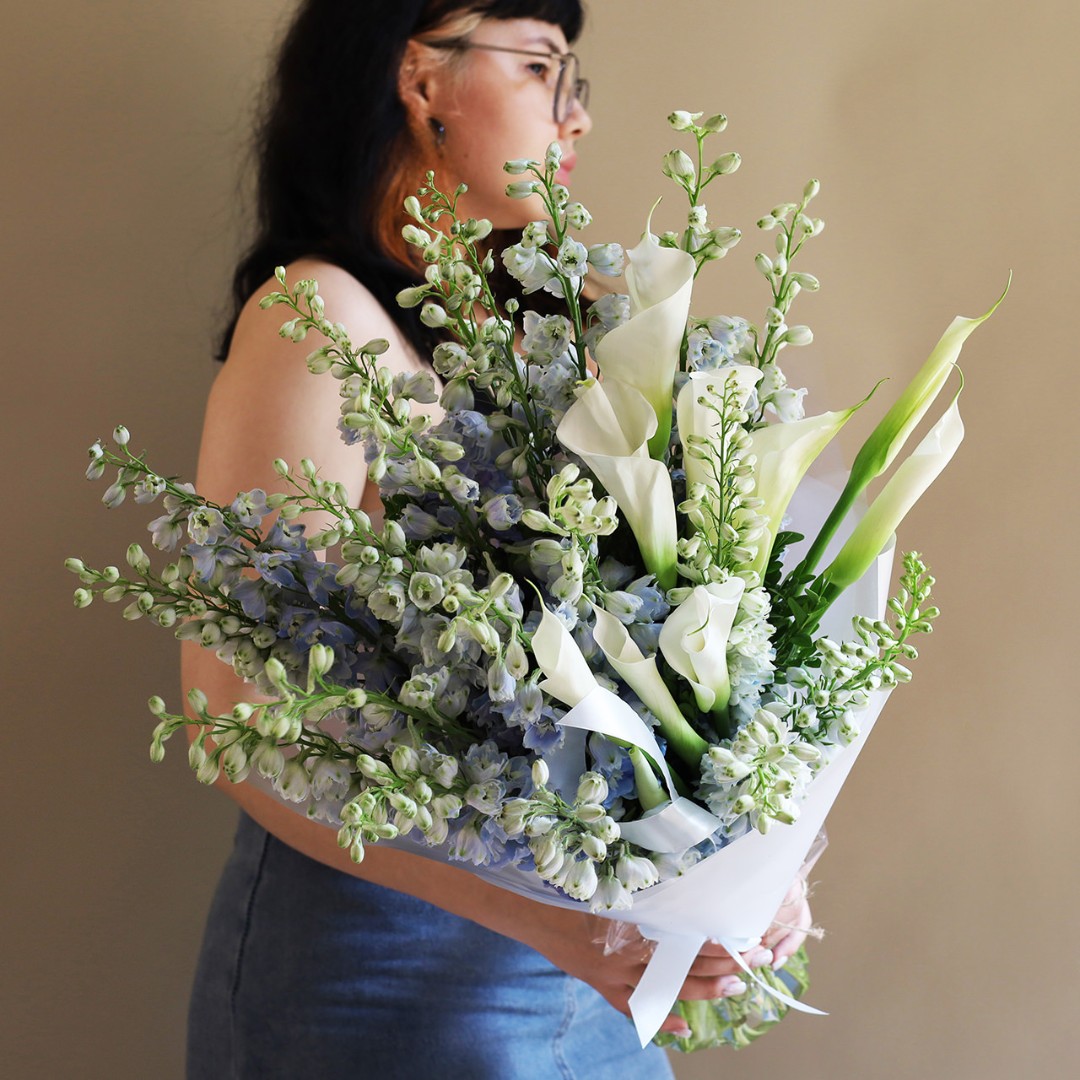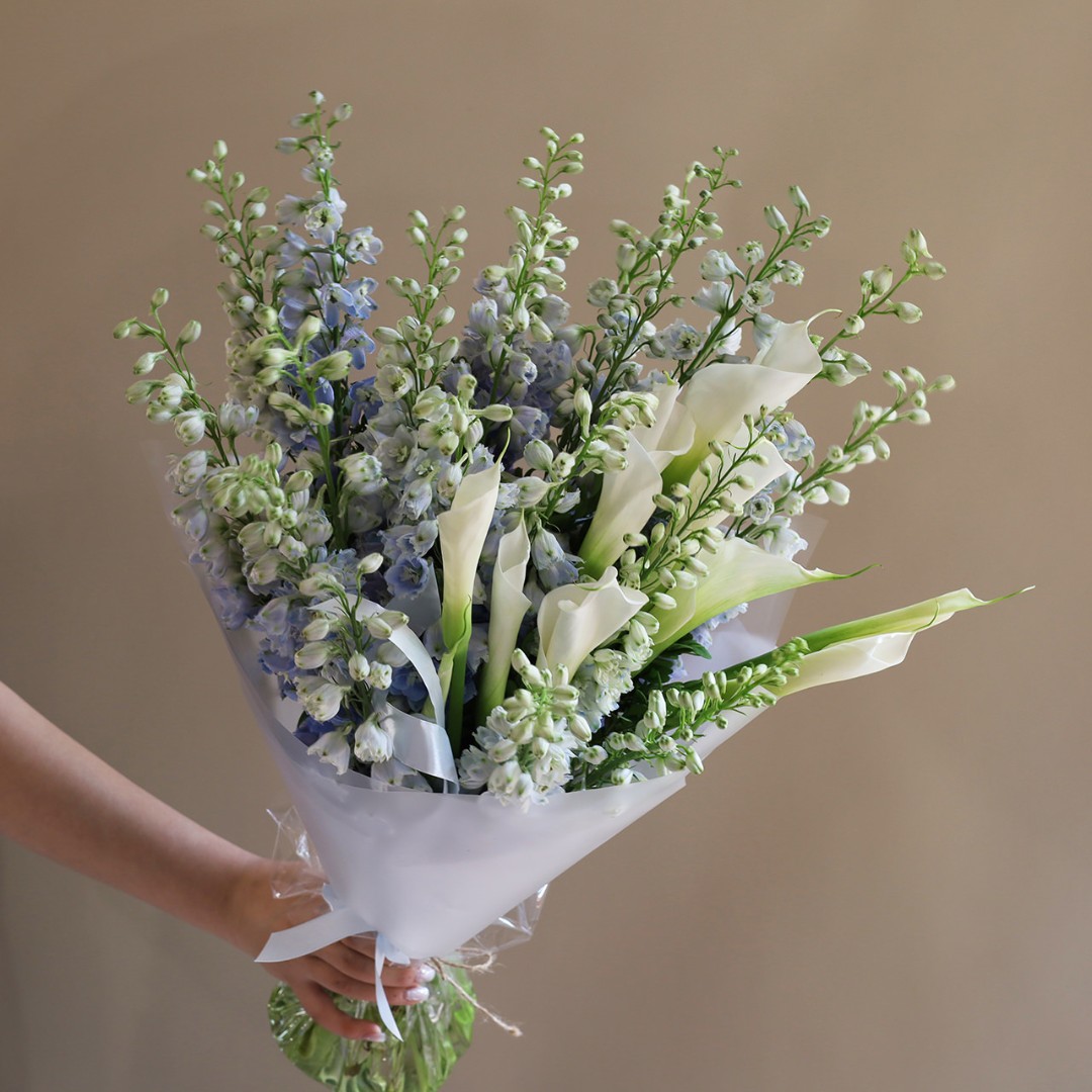 Полевой букет из калл и дельфиниума. Букет может быть собран в другой цветовой гамме. Количество цветов в букете вы можете выбрать в параметрах. Вы можете выбрать любое количество цветов указанное в перечне к данному букету.