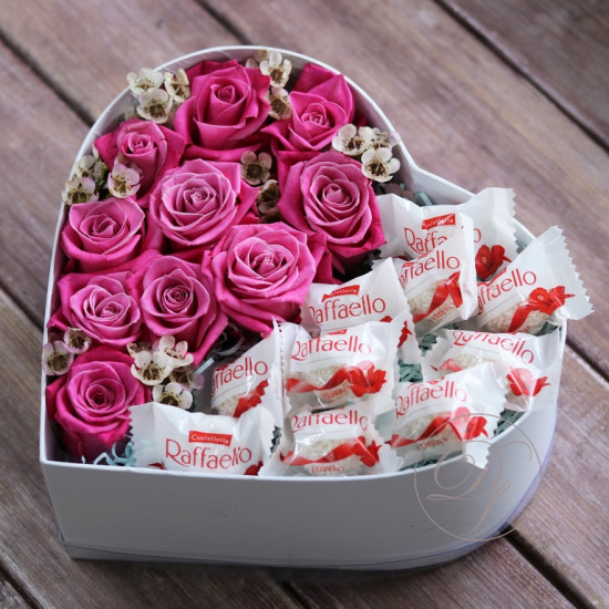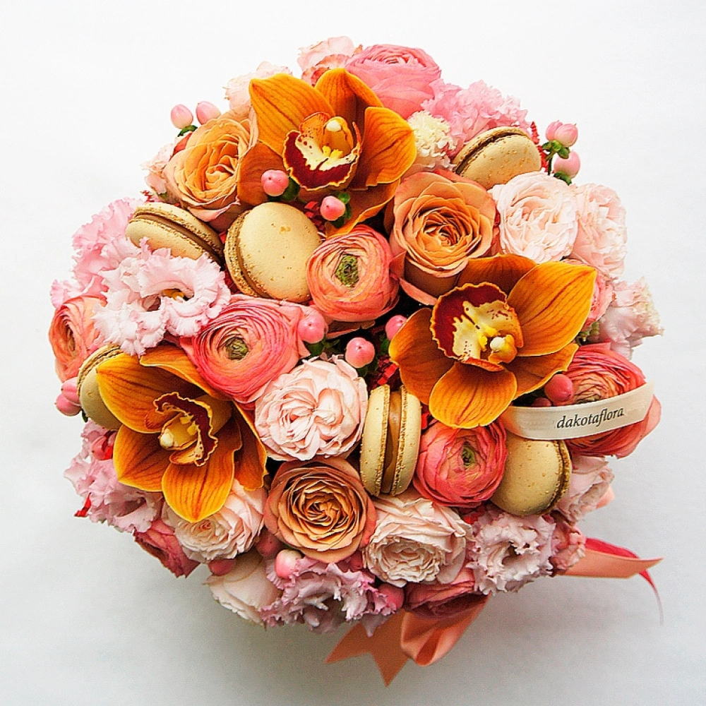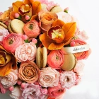 Авторские цветочные композиции в элегантных коробках различных форм, цветов, размеров, с добавлением сладостей в виде: французских пирожных macarons.