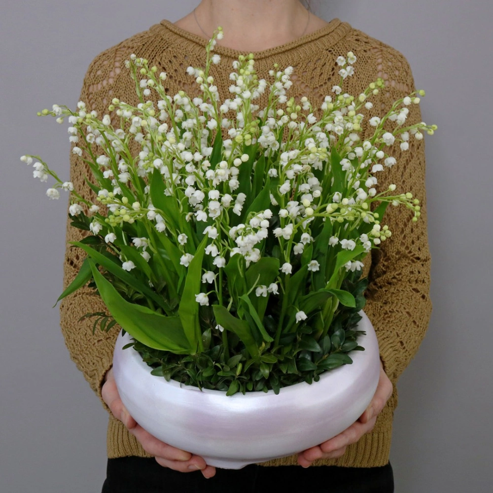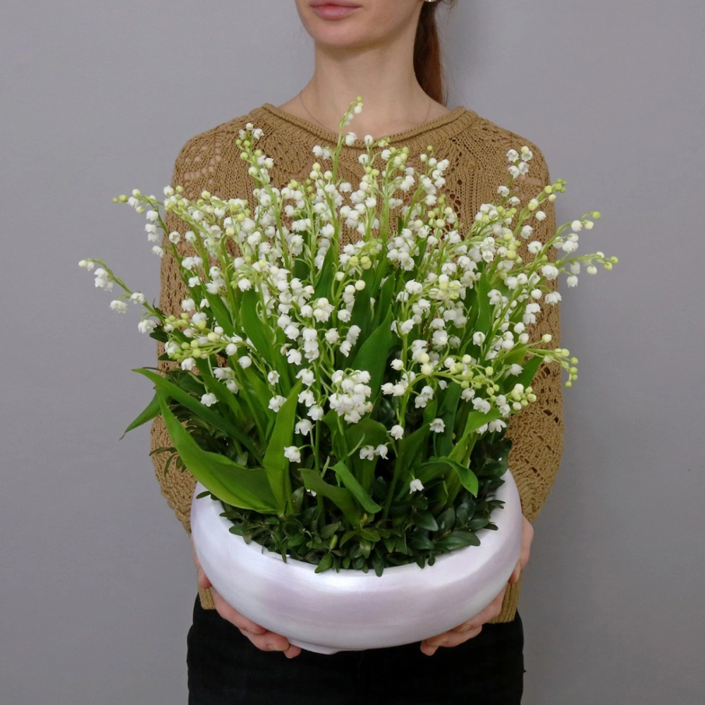 Ландыши Dakota flora. Купить ландыши в Москве. Ландыши в кашпо. Цветы в коробке это композиции, составленные с использованием специальной губки Oasis (пиафлор) которая пропитана водой. Для того чтобы цветы дольше оставались свежими, добавляйте в нее немного воды каждый день.