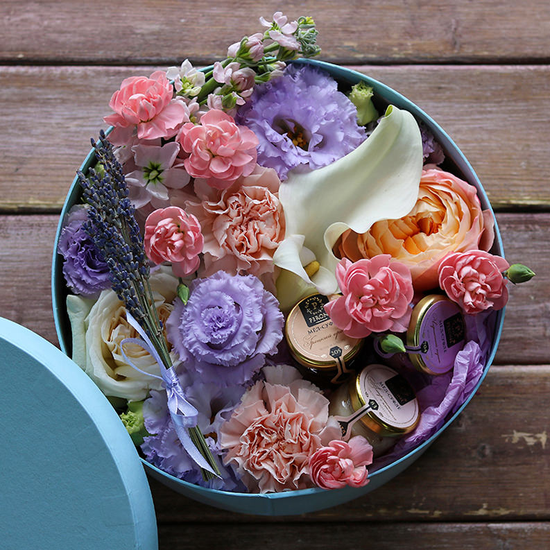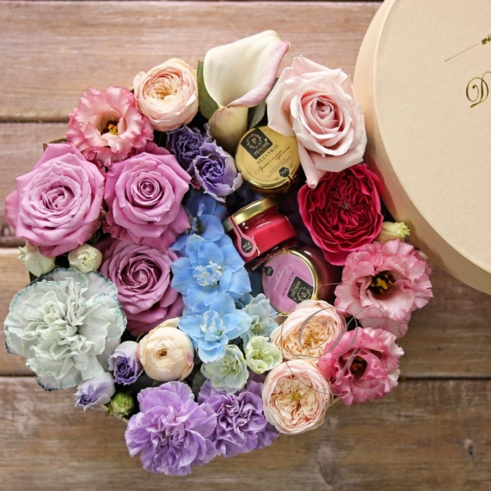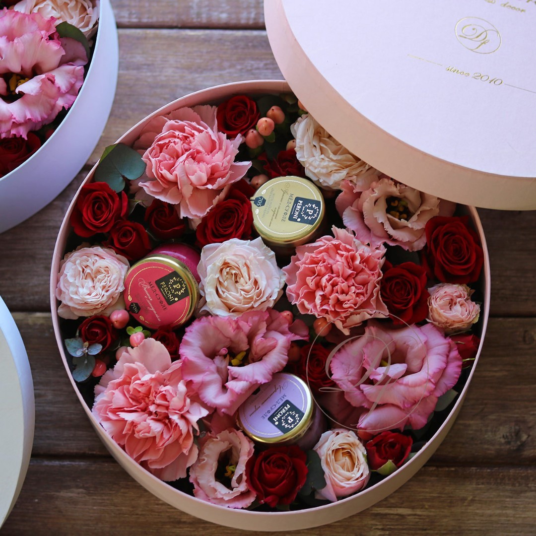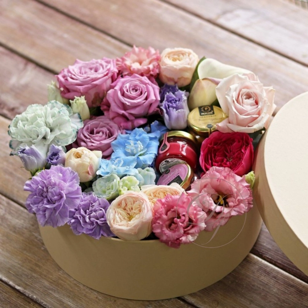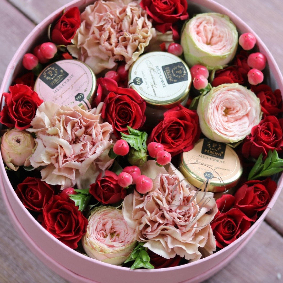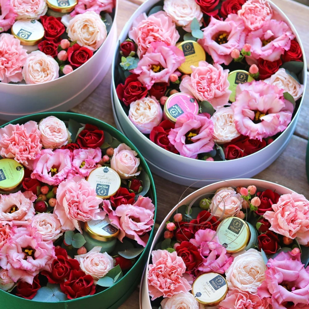 Авторские цветочные композиции в элегантных коробках различных форм, цветов, размеров, с добавлением сладостей в виде: французских пирожных macarons.