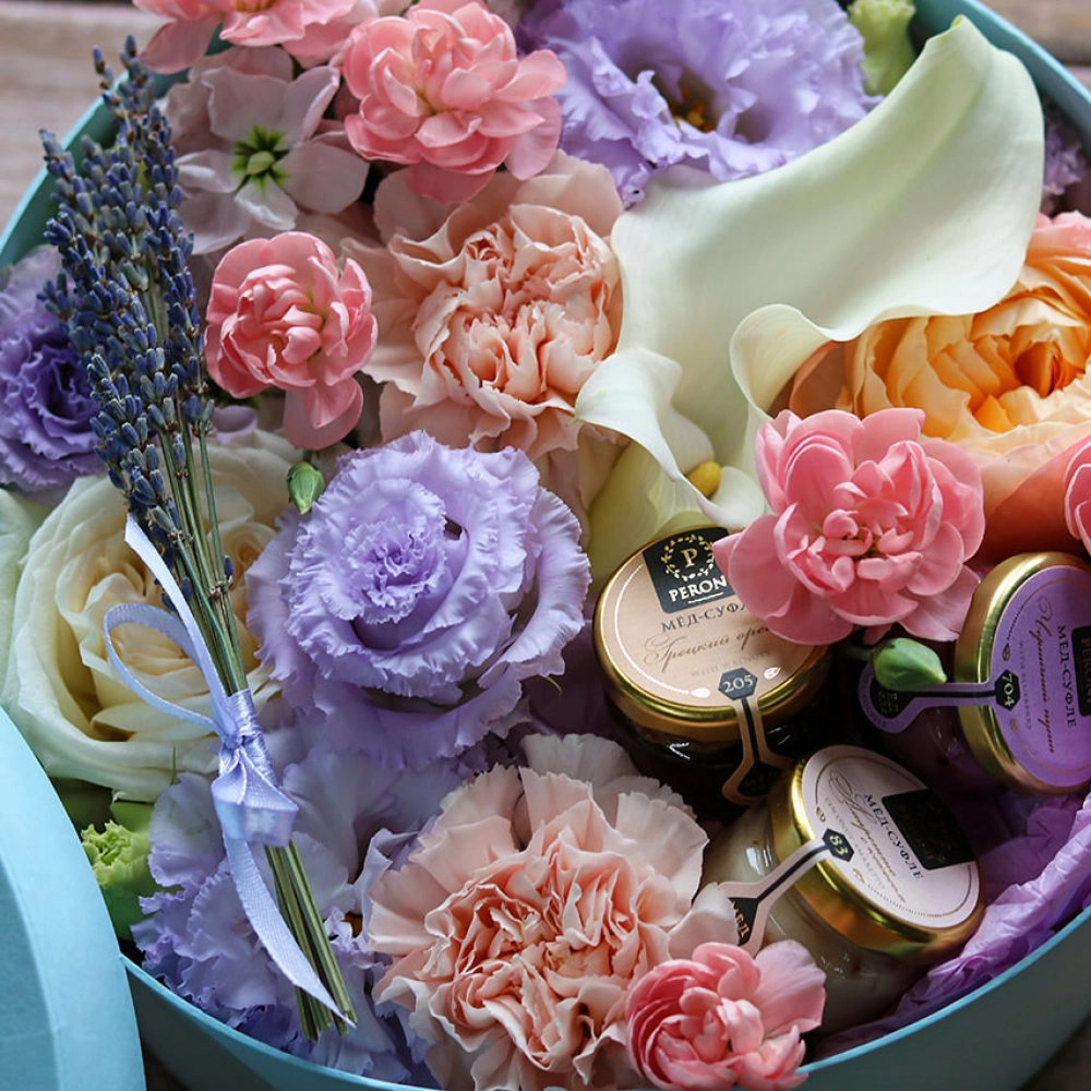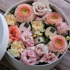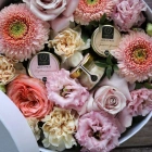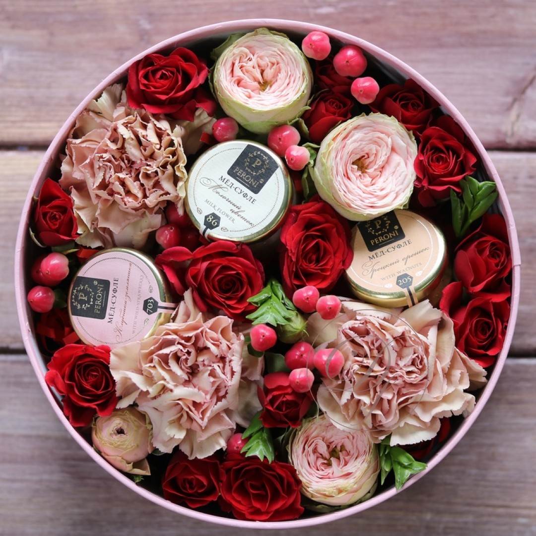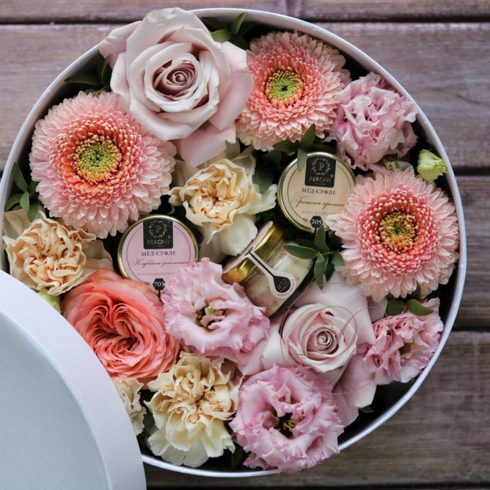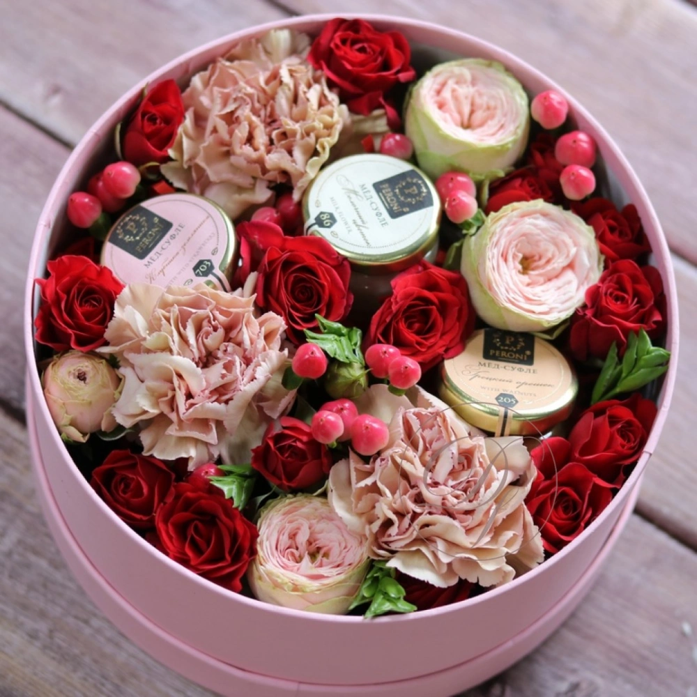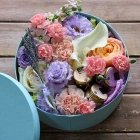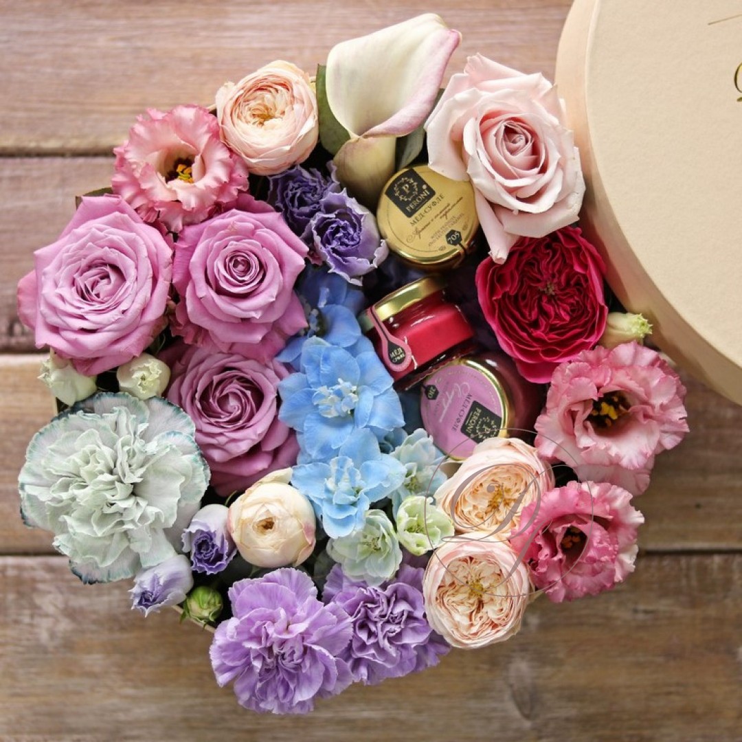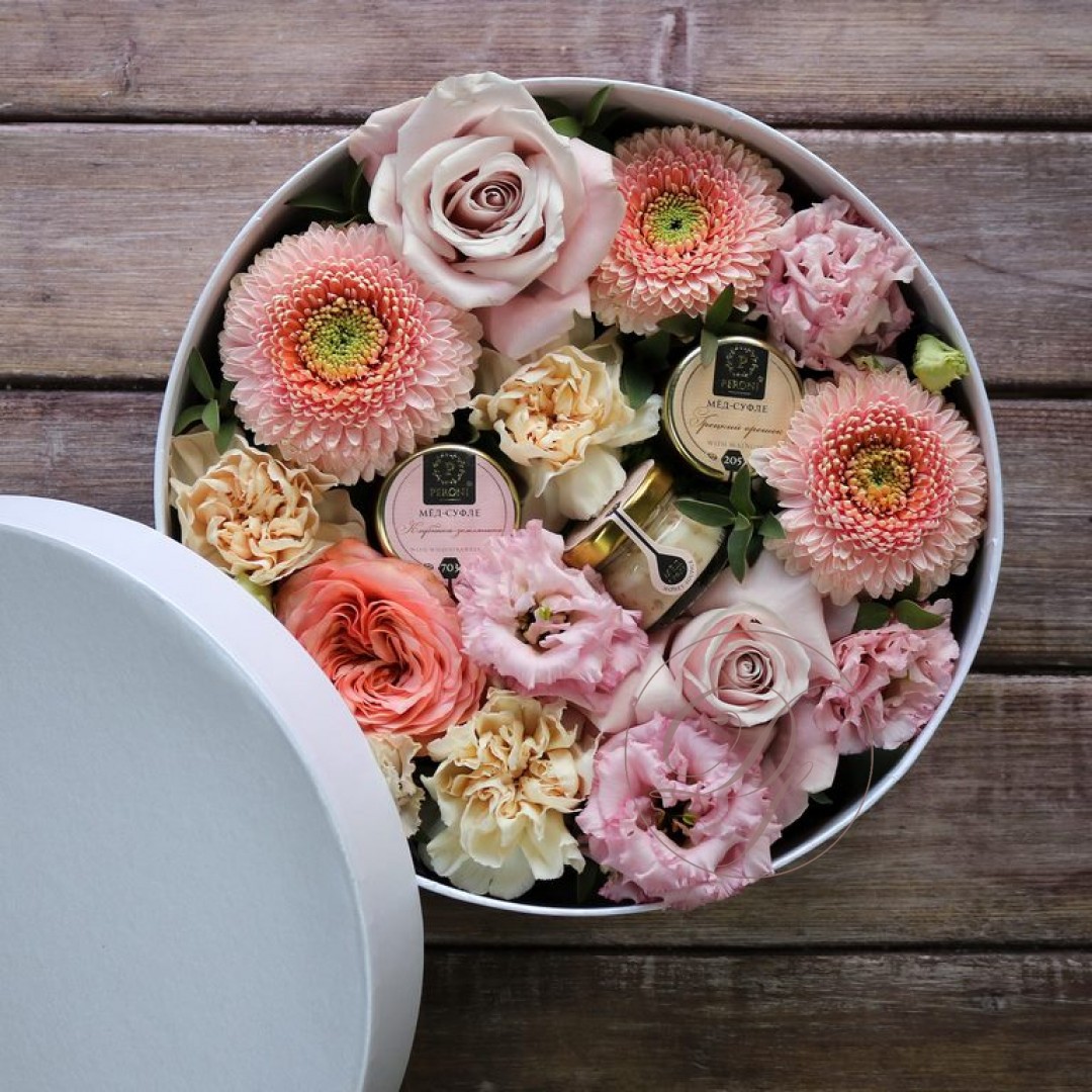 Авторские цветочные композиции в элегантных коробках различных форм, цветов, размеров, с добавлением сладостей в виде: французских пирожных macarons.
