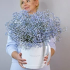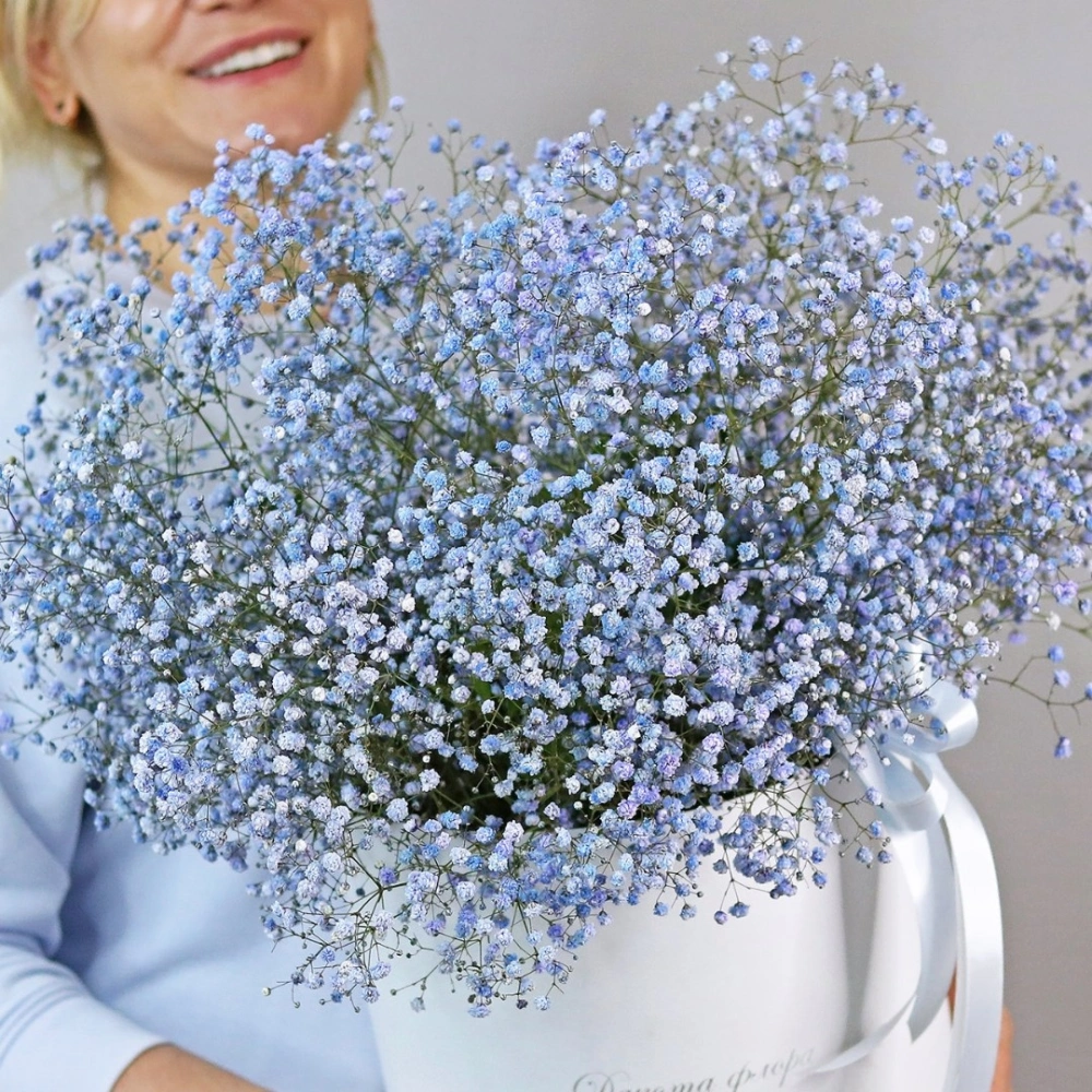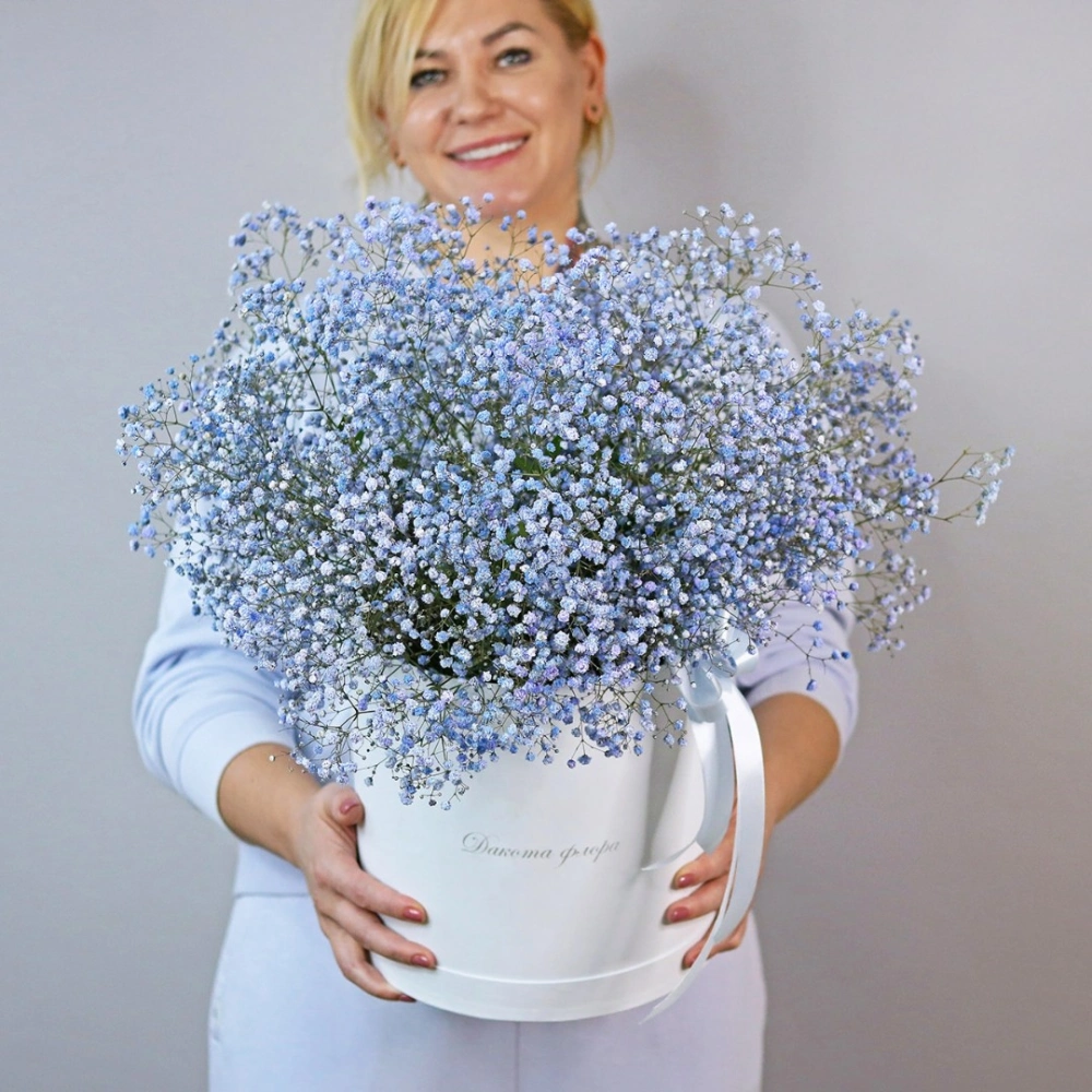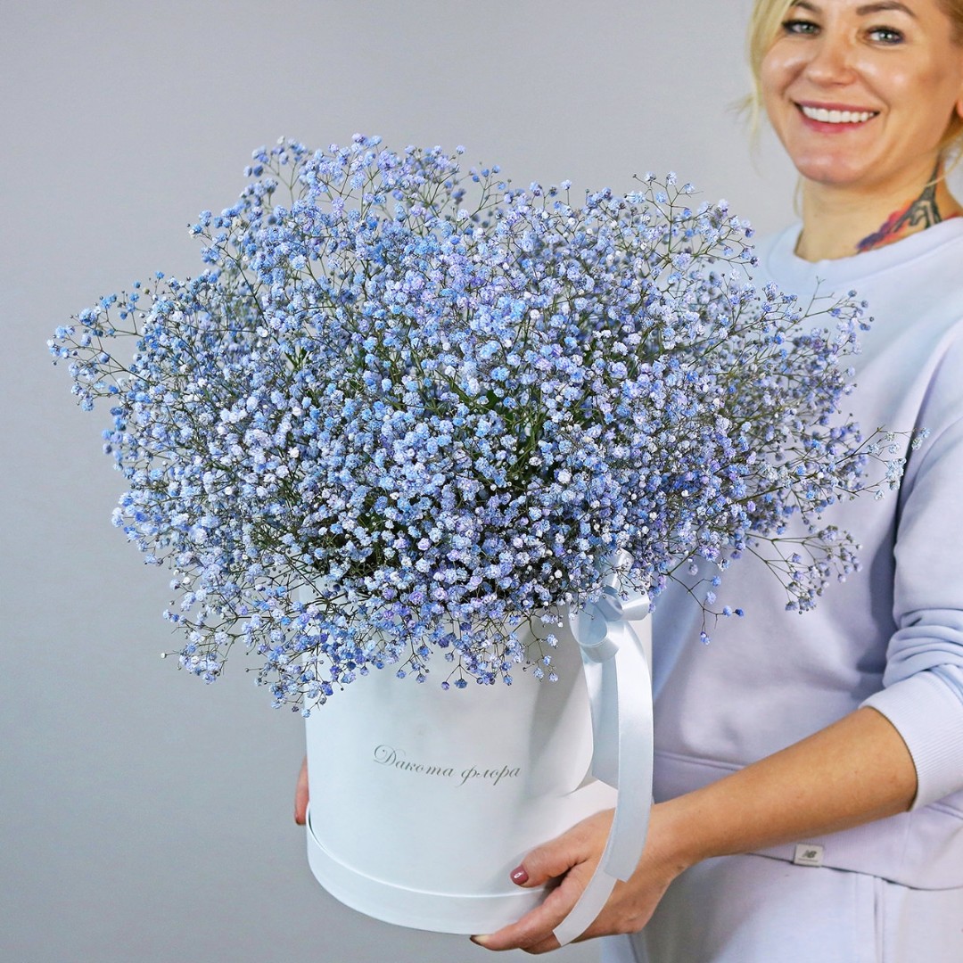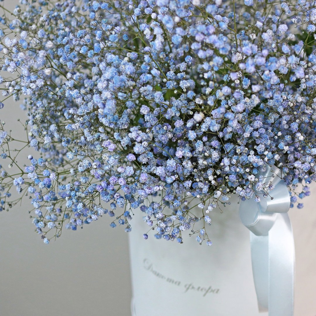 Голубая гипсофила в коробке. На фотографии 25 гипсофил в коробке. Цветы в коробках это композиции, составленные с использованием специальной губки Oasis (пиафлор) которая пропитана водой. Для того чтобы цветы дольше оставались свежими, добавляйте в нее немного воды каждый день.