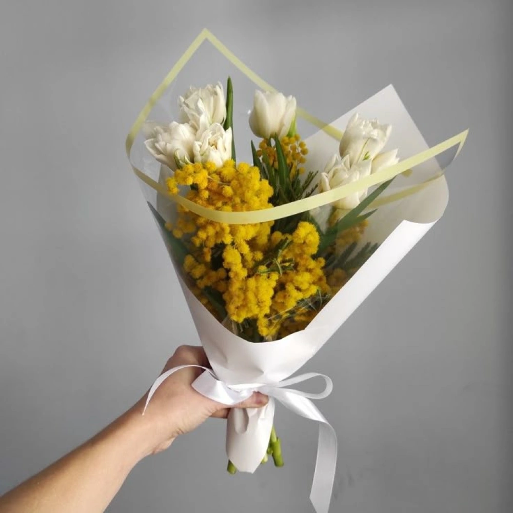 Корпоративный букет тюльпаны с мимозой