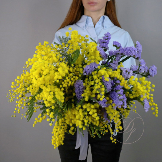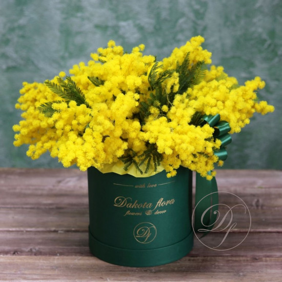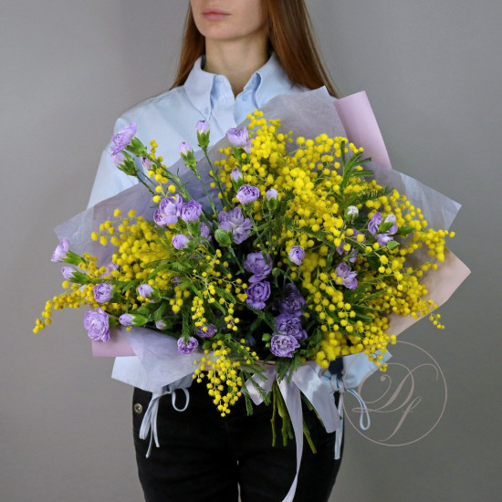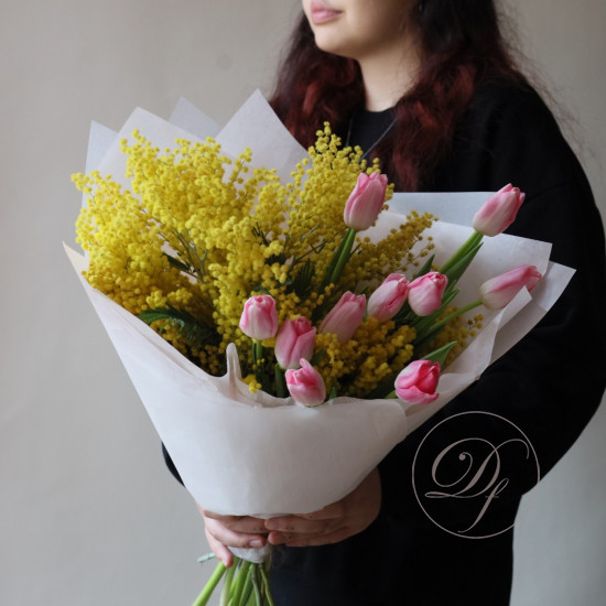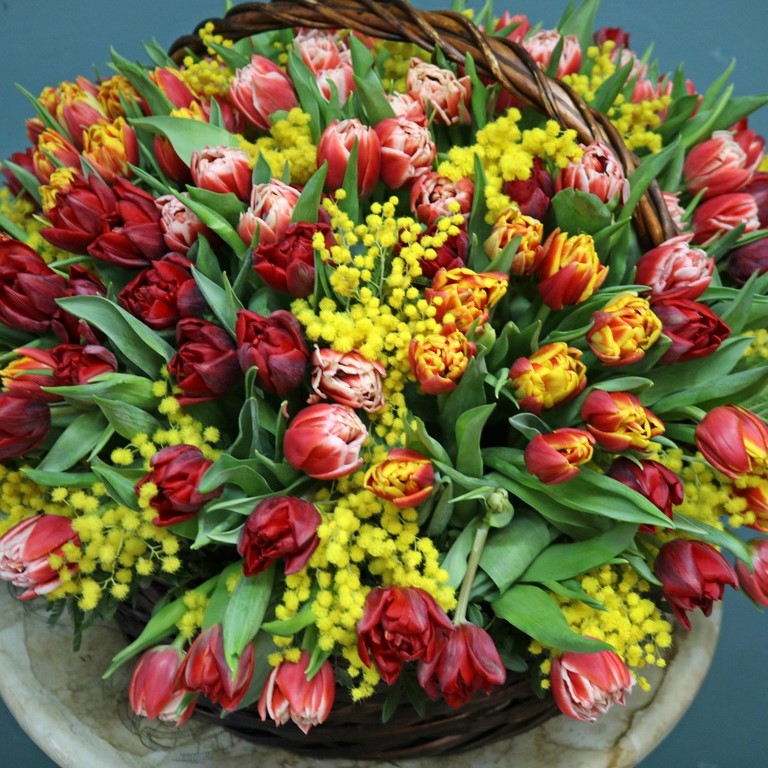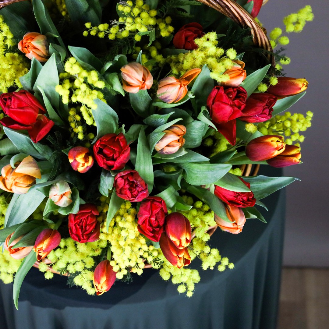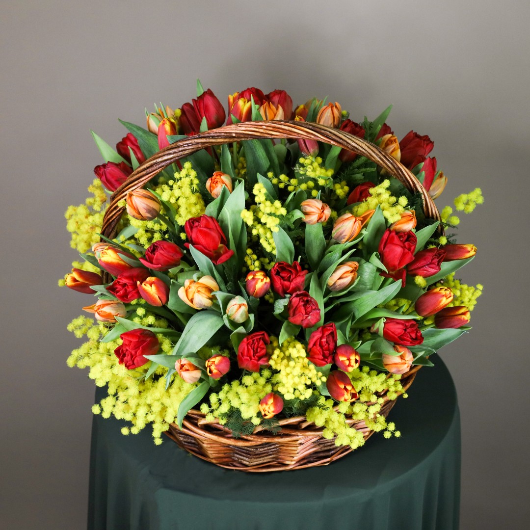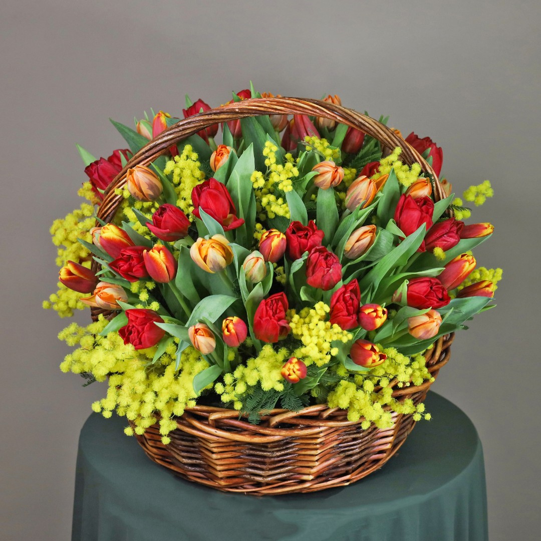 Корзина с тюльпанами и мимозой