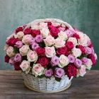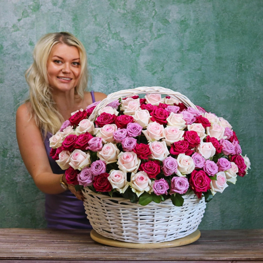 На фотографии 151 роза в корзине.