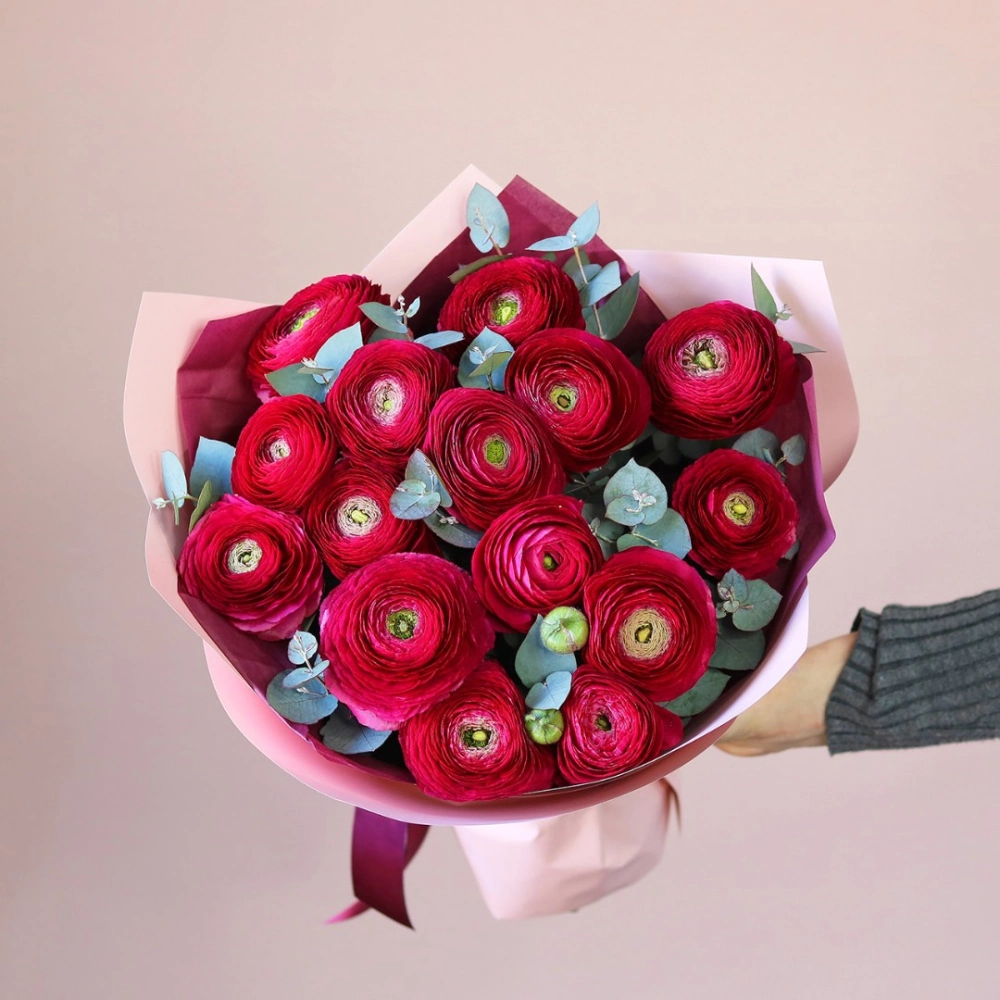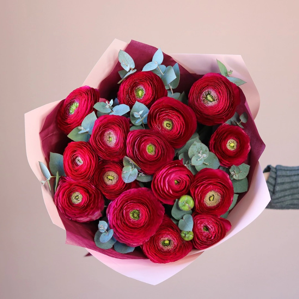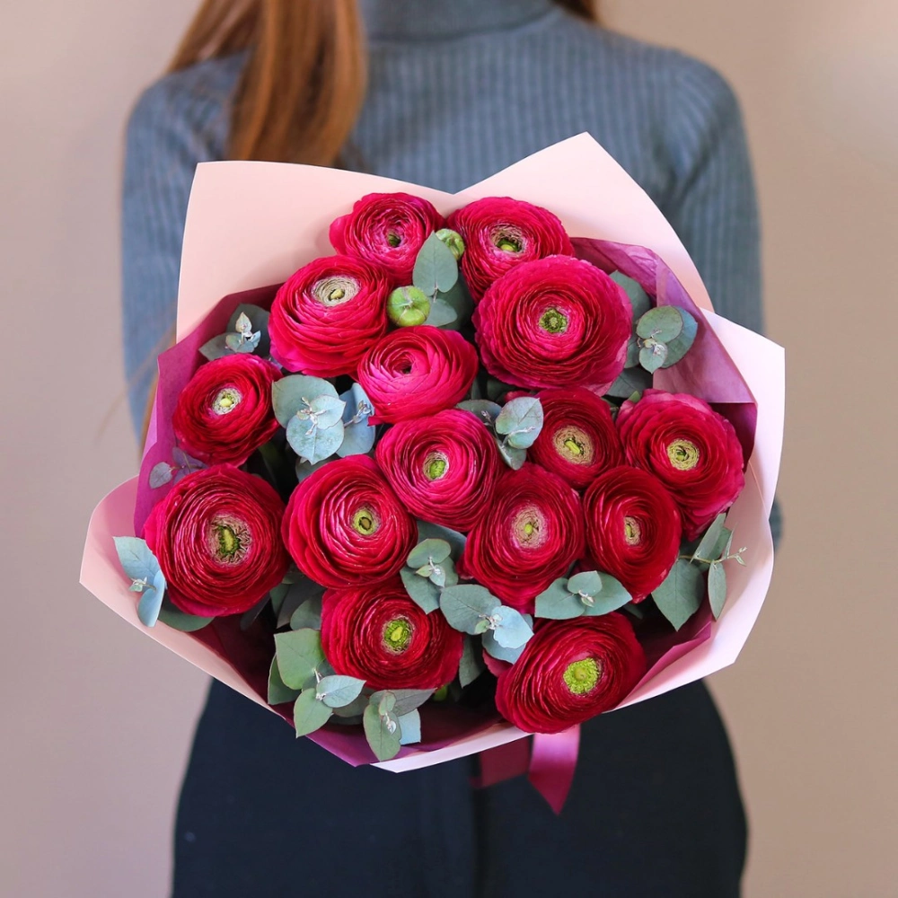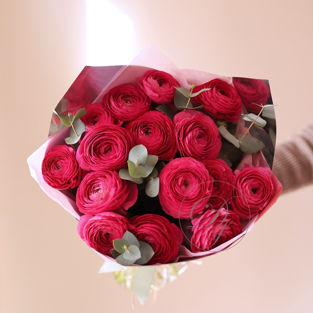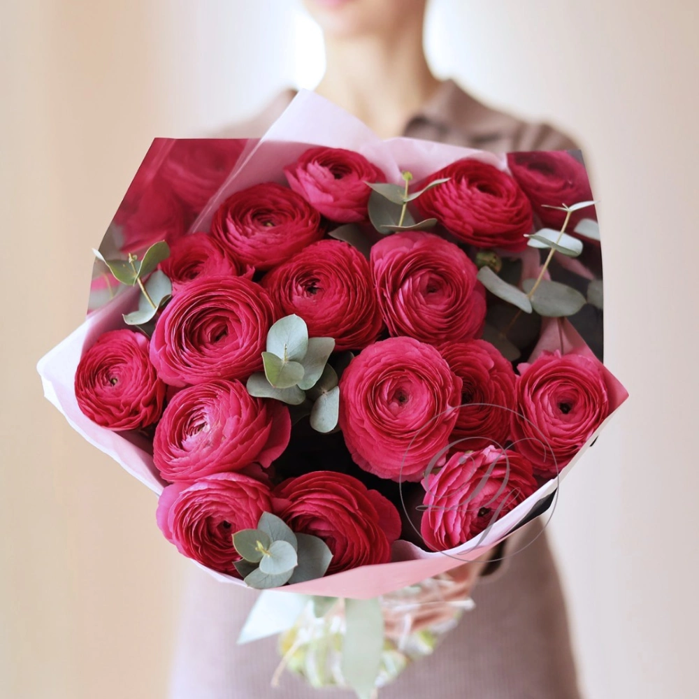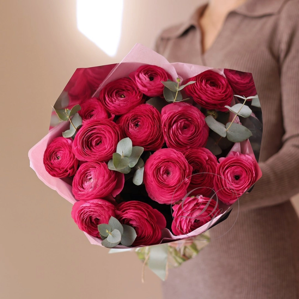 Букет из ярко-розовых ранункулюсов. На фотографии 15 ранункулюсов в букете. Малиновые ранункулюсы ханой в букете. Вы можете выбрать любое количество цветов указанное в перечне к данному букету.