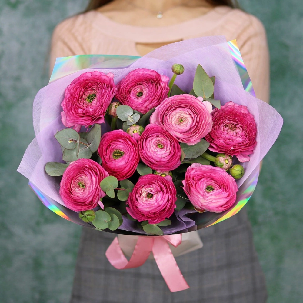 Букет ранункулюсов ханой. На фотографии 9 ранункулюсов в букете. Малиновые ранункулюсы ханой в букете. Вы можете выбрать любое количество цветов указанное в перечне к данному букету.