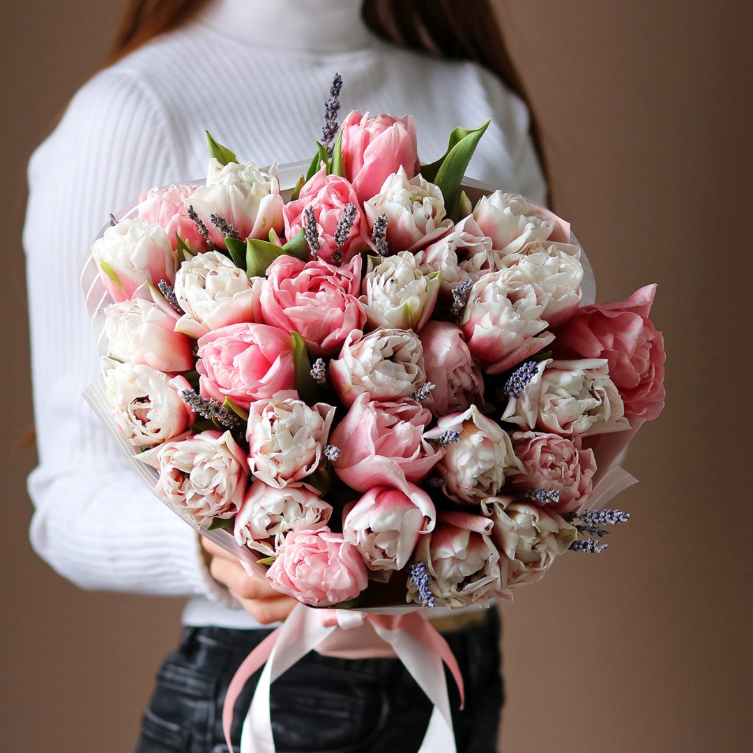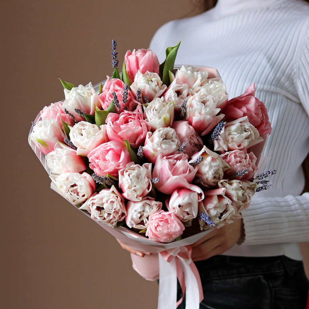 Букет из розовых махровых Тюльпанов и лаванды. Вы можете выбрать любое количество цветов указанное в перечне к данному букету.
