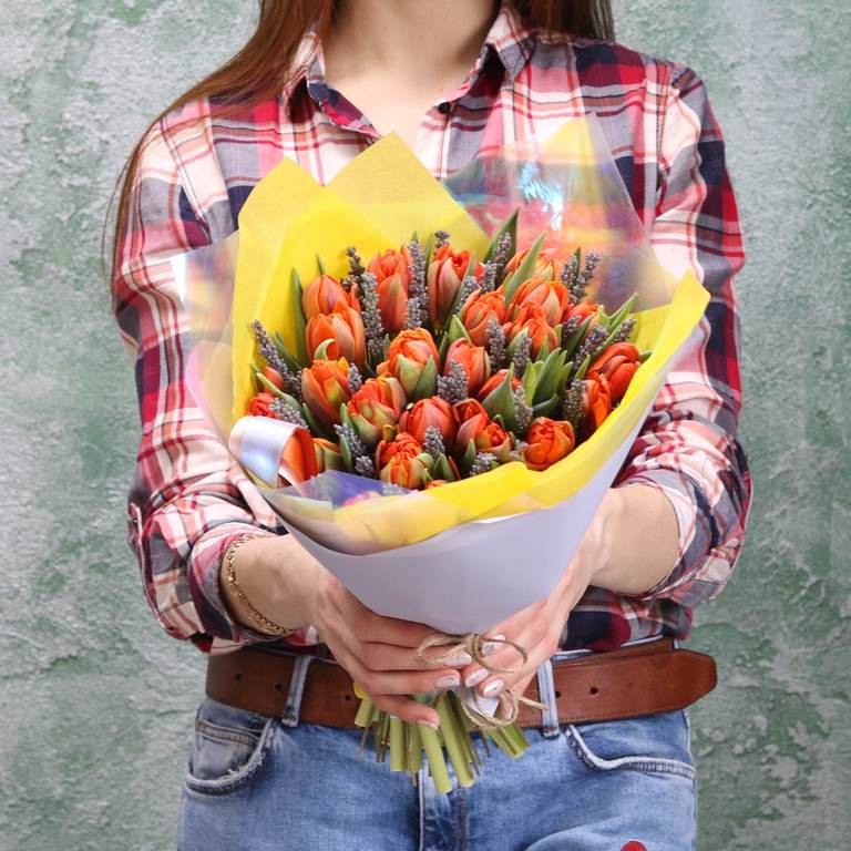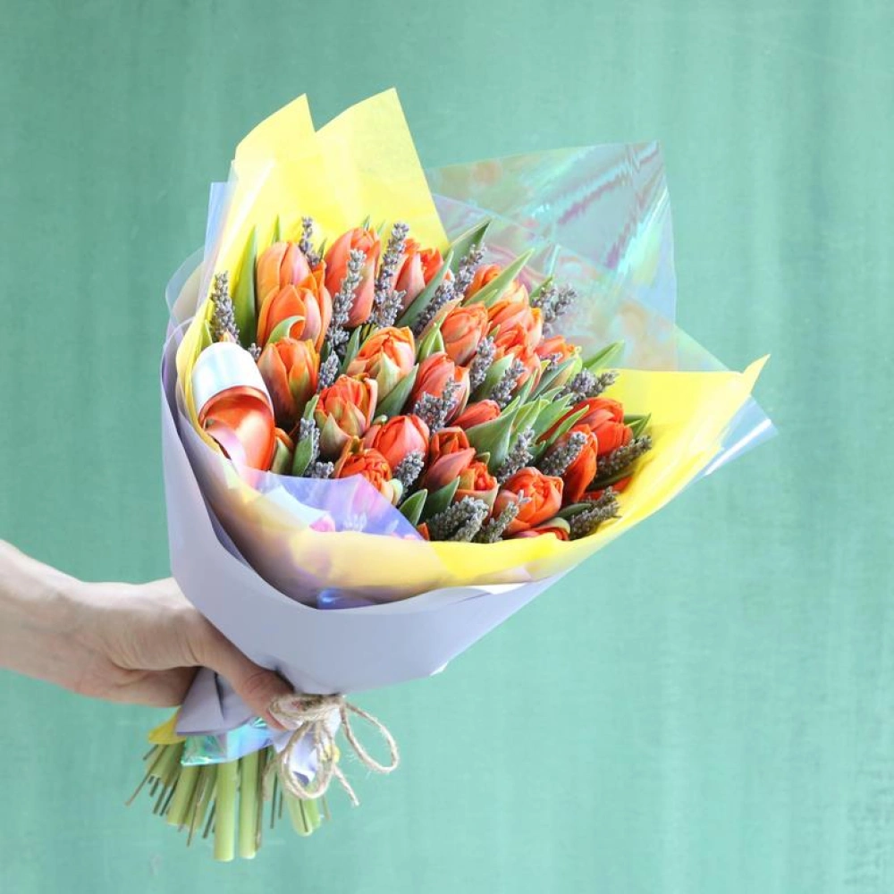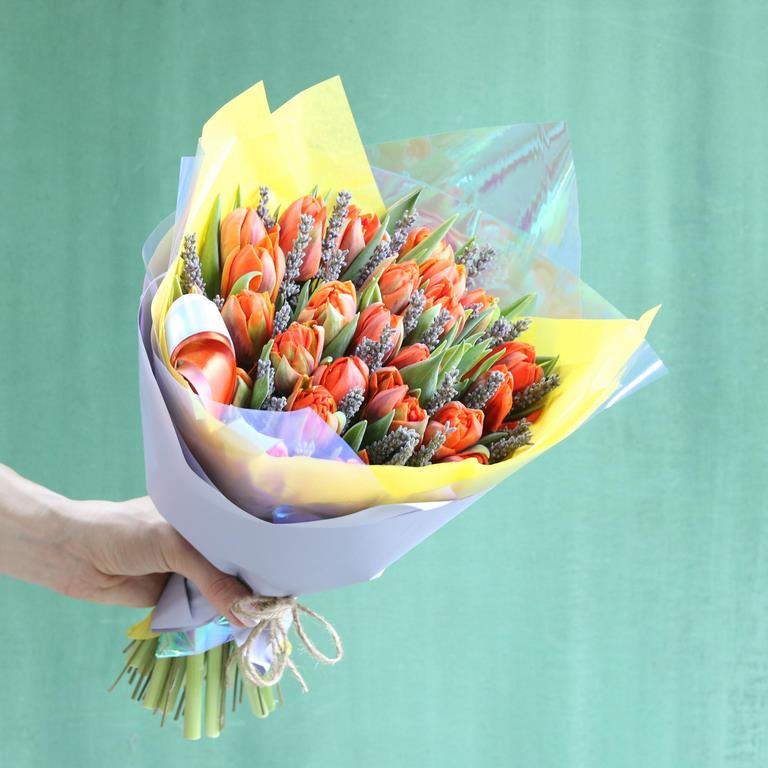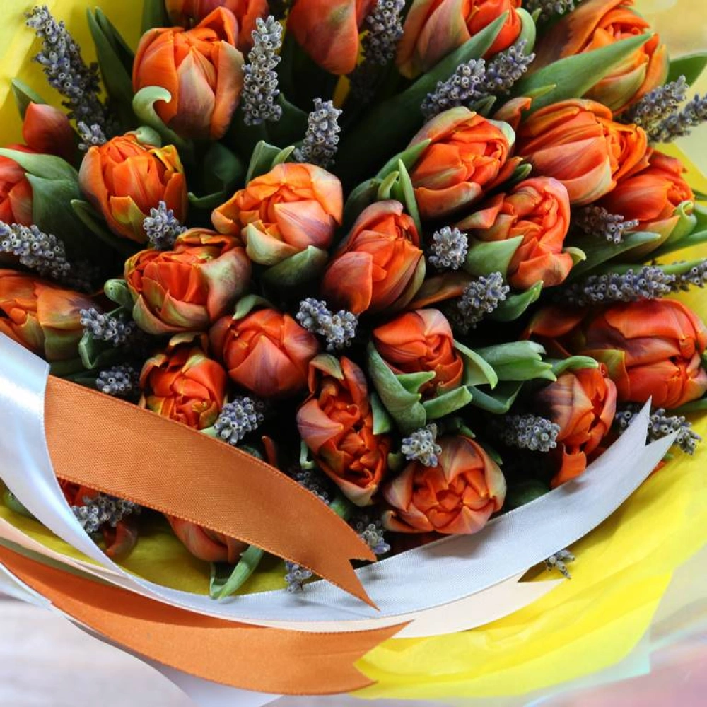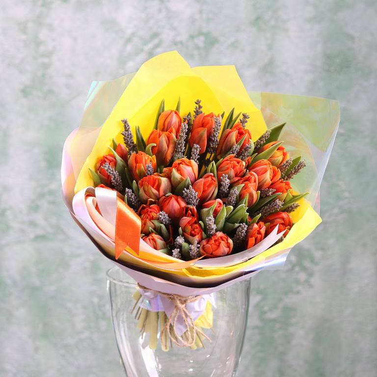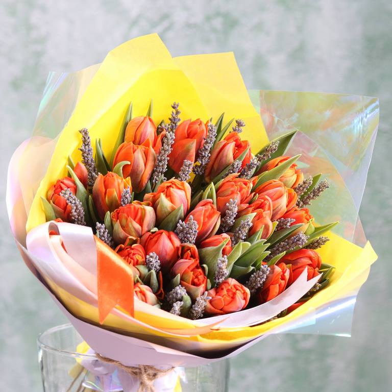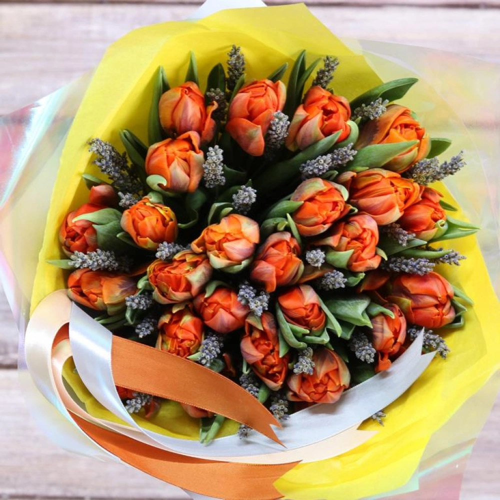 Букет из оранжевых махровых Тюльпанов и лаванды. Вы можете выбрать любое количество цветов указанное в перечне к данному букету.