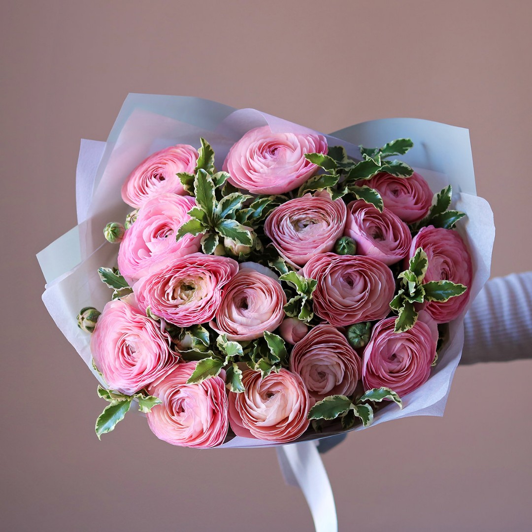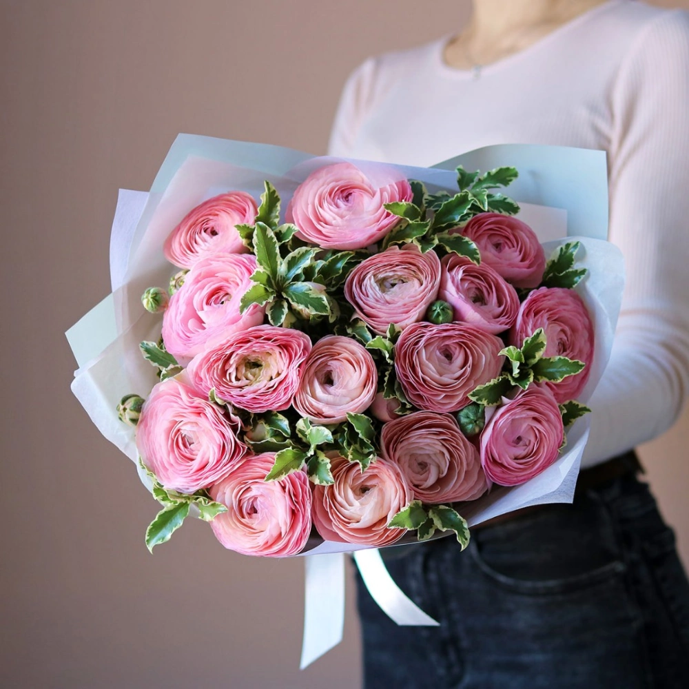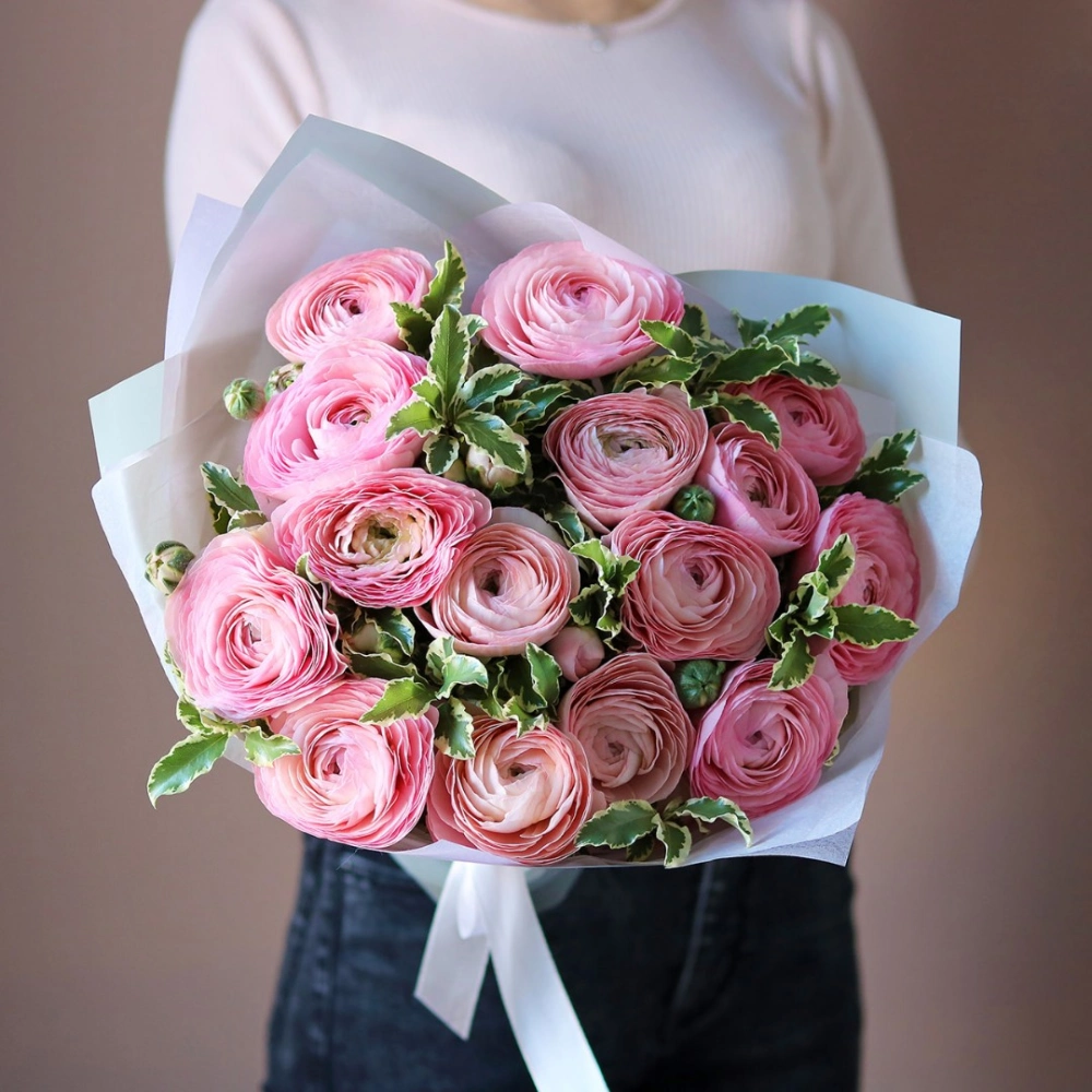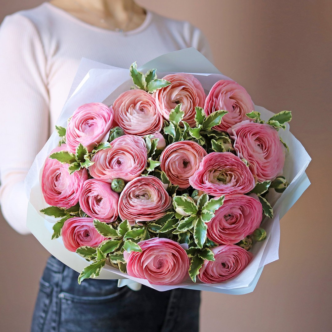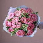Букет ранункулюсов ханой. На фотографии 15 ранункулюсов в букете. Нежно-розовые ранункулюсы ханой в букете. Вы можете выбрать любое количество цветов указанное в перечне к данному букету.
