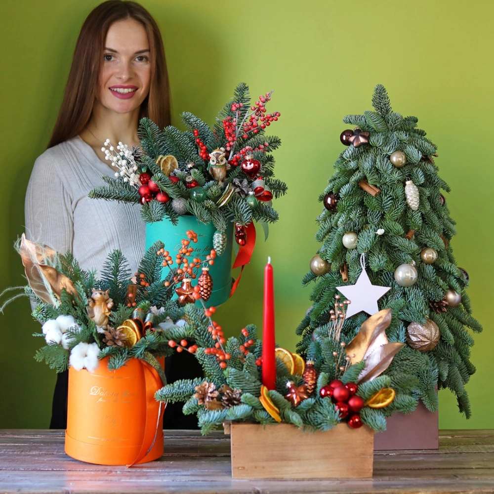 Новогодние композиции из натуральной хвои с авторским декором на заказ. Размер композиции можно выбрать в карточке товара.