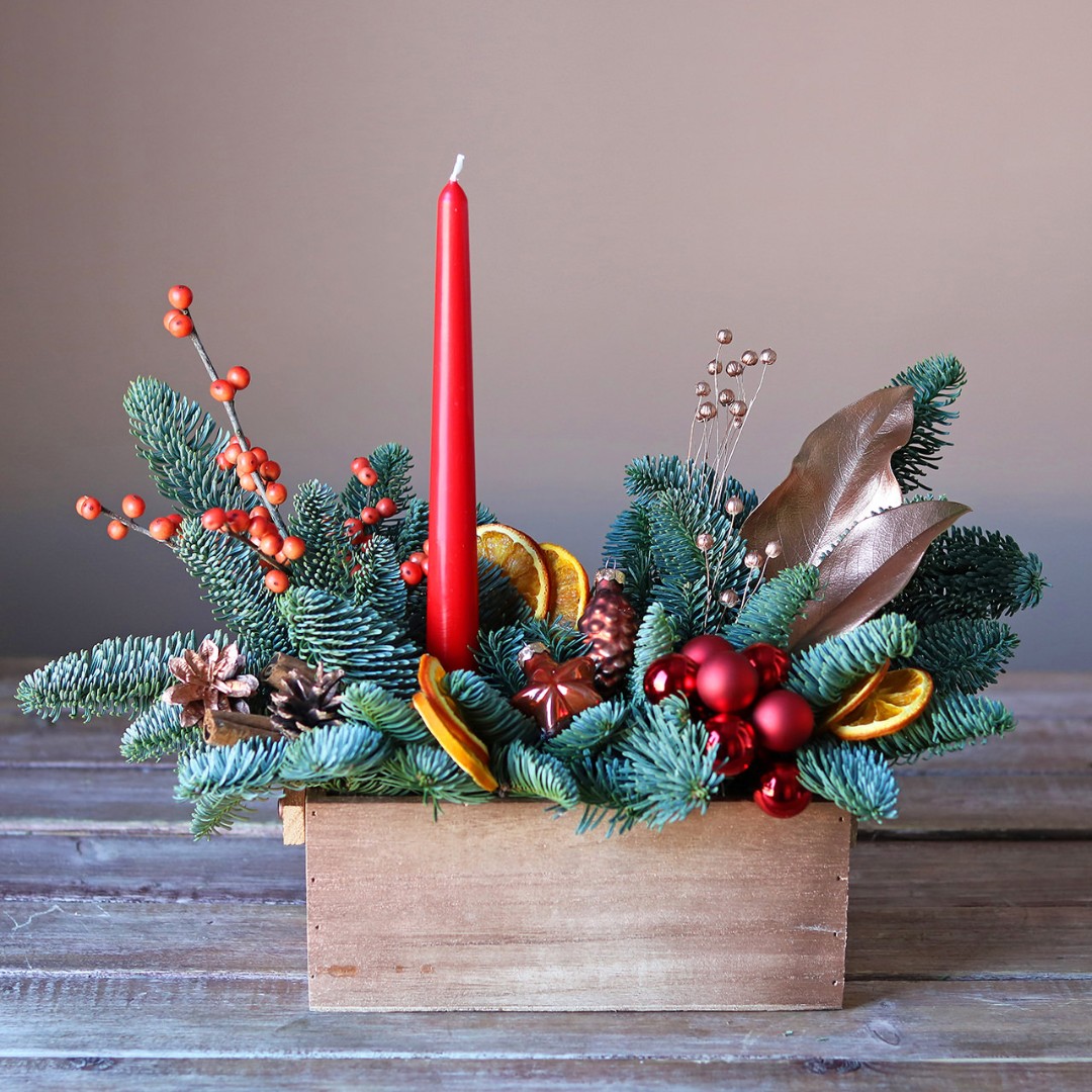 Деревянный ящик с новогодним декором - чудесный подарок для родных и друзей. Авторская новогодняя композиция из натуральной ели, выполненная в деревянном ящике прямоугольной формы. Этот подарок станет прекрасным украшением в домашнем интерьере и будет радовать получателя долгое время. Композиция выполнена из натуральной ели (лапник), собрана на специальной губке, которая пропитана водой, это позволяет сохранить свежий внешний вид на максимально долгий срок. Для украшения мы используем новогодний декор, натуральные материалы, свечи, гирлянды.