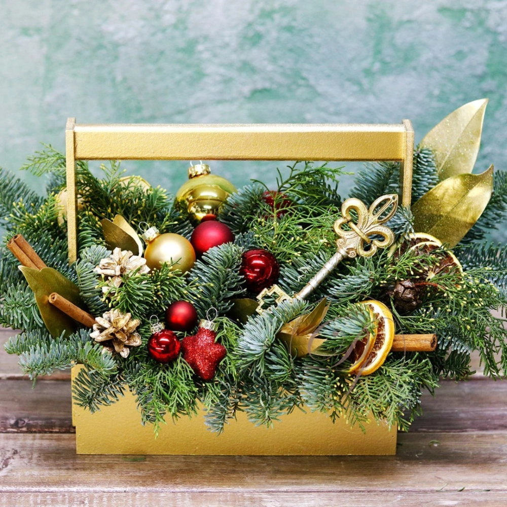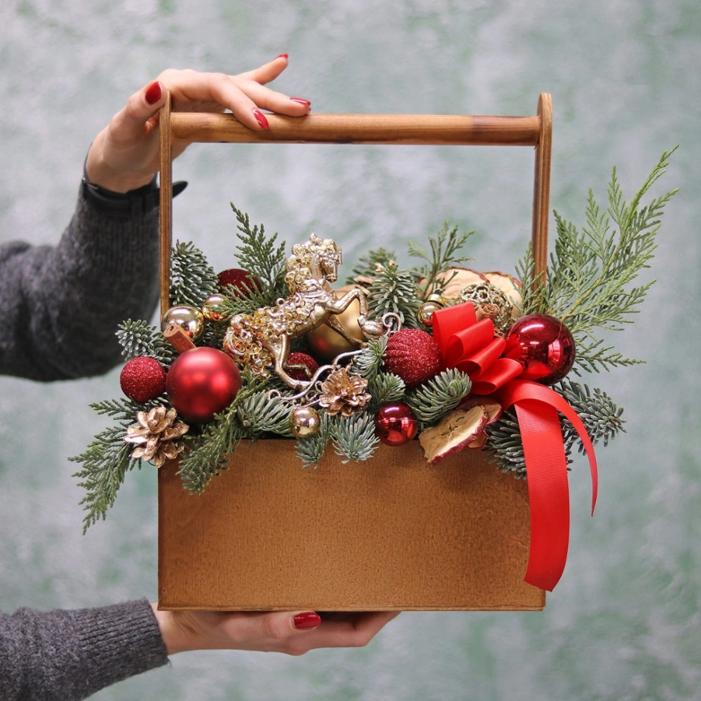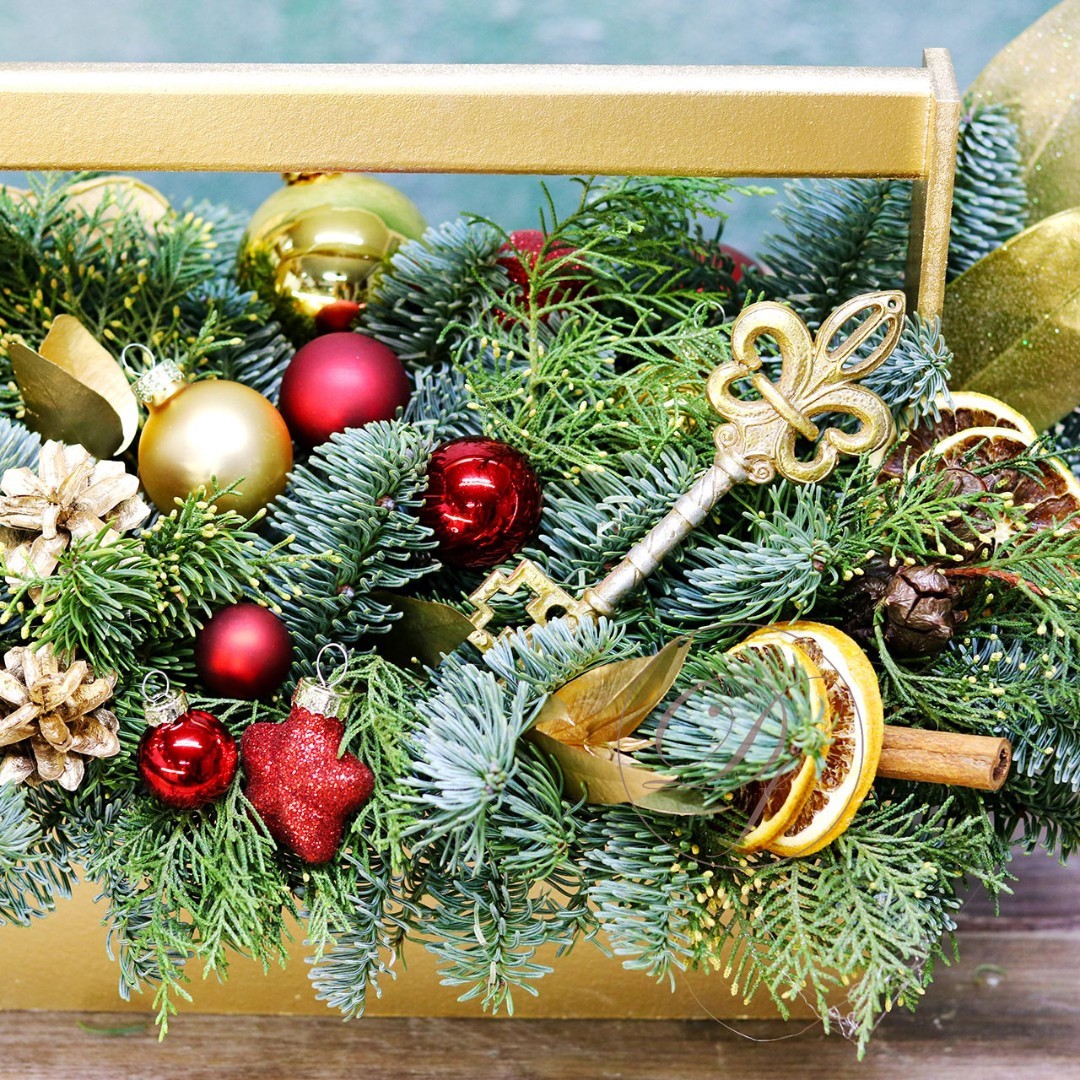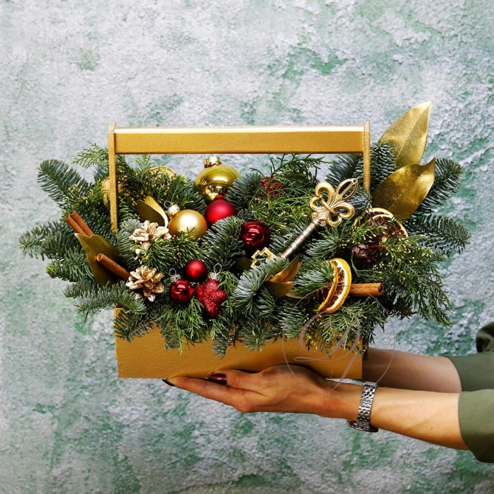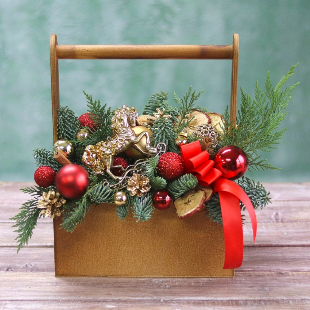 Оформить заказ на новогоднюю композицию лучше заранее, минимум за сутки, на изготовление и подбор декора требуется время. Композиция выполнена из натуральной ели (лапник), собрана на специальной губке, которая пропитана водой, это позволяет сохранить свежий внешний вид на максимально долгий срок.