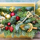 Авторская композиция из натуральной хвои так же хорошо подойдёт для подарка родным и близким. Для праздничного настроения, подарок можно сделать в канун нового года, или украсить ею праздничный стол.
