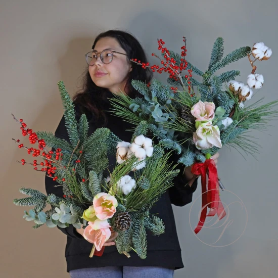 Новогодняя композиция из натуральной хвои с авторским декором на заказ. На фотографии размер S. Вы можете выбрать нужный размер в перечне представленных в карточке товара и рассказать нам о своих пожеланиях по дизайну. Композиция будет уникальной и особенной для вашего дома.