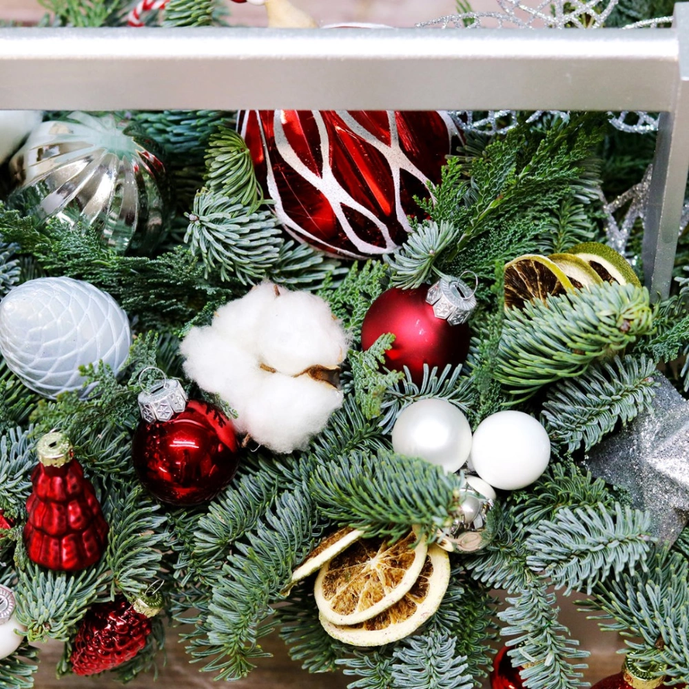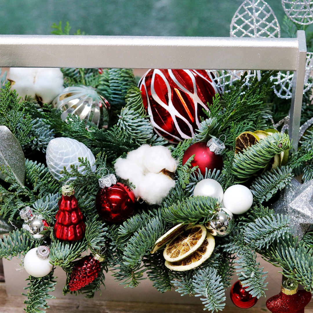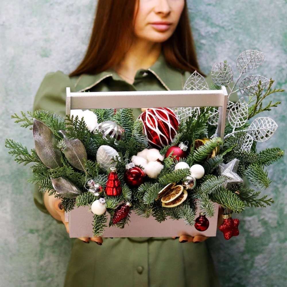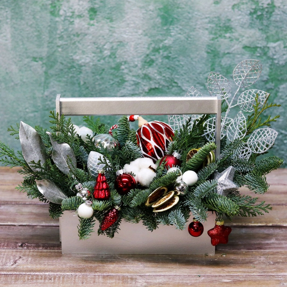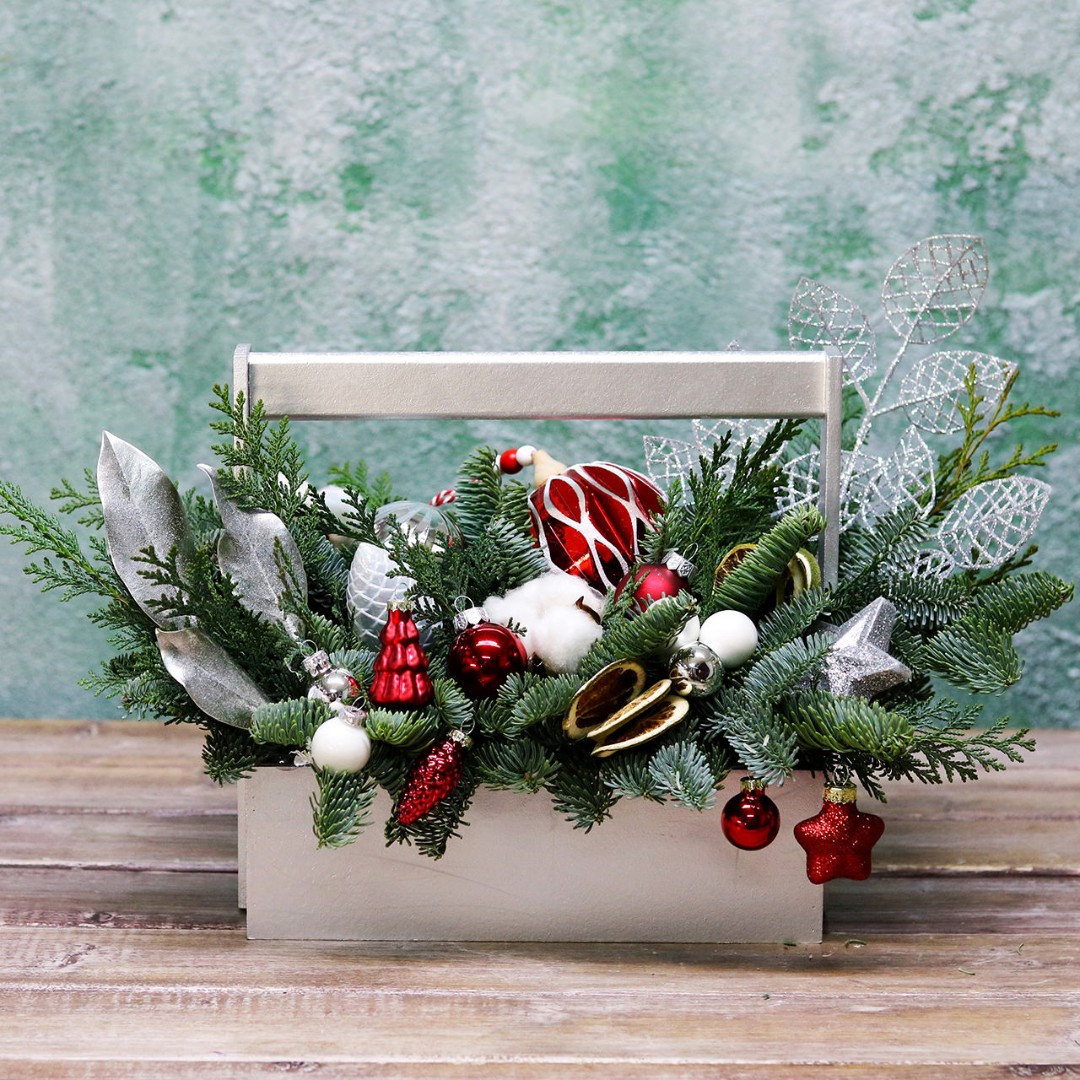 Деревянный ящик с новогодним декором - чудесный подарок для родных и друзей. Авторская новогодняя композиция из натуральной ели, выполненная в деревянном ящике прямоугольной формы. Этот подарок станет прекрасным украшением в домашнем интерьере и будет радовать получателя долгое время. Композиция выполнена на специальной флористической губке, она пропитана водой, это позволяет хвои максимально долго сохранять свою свежесть.