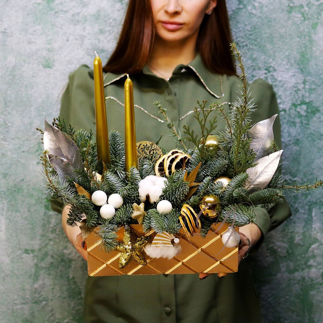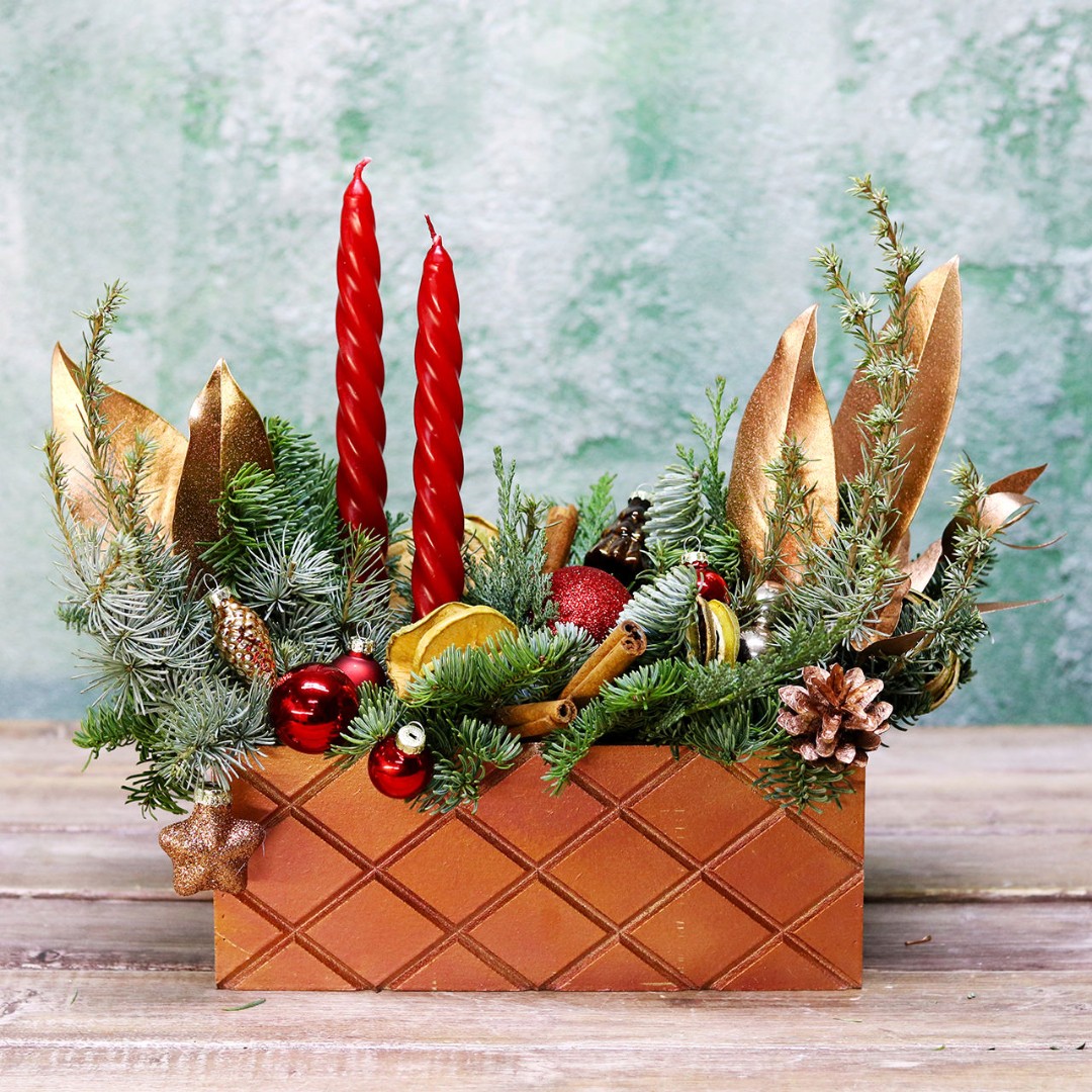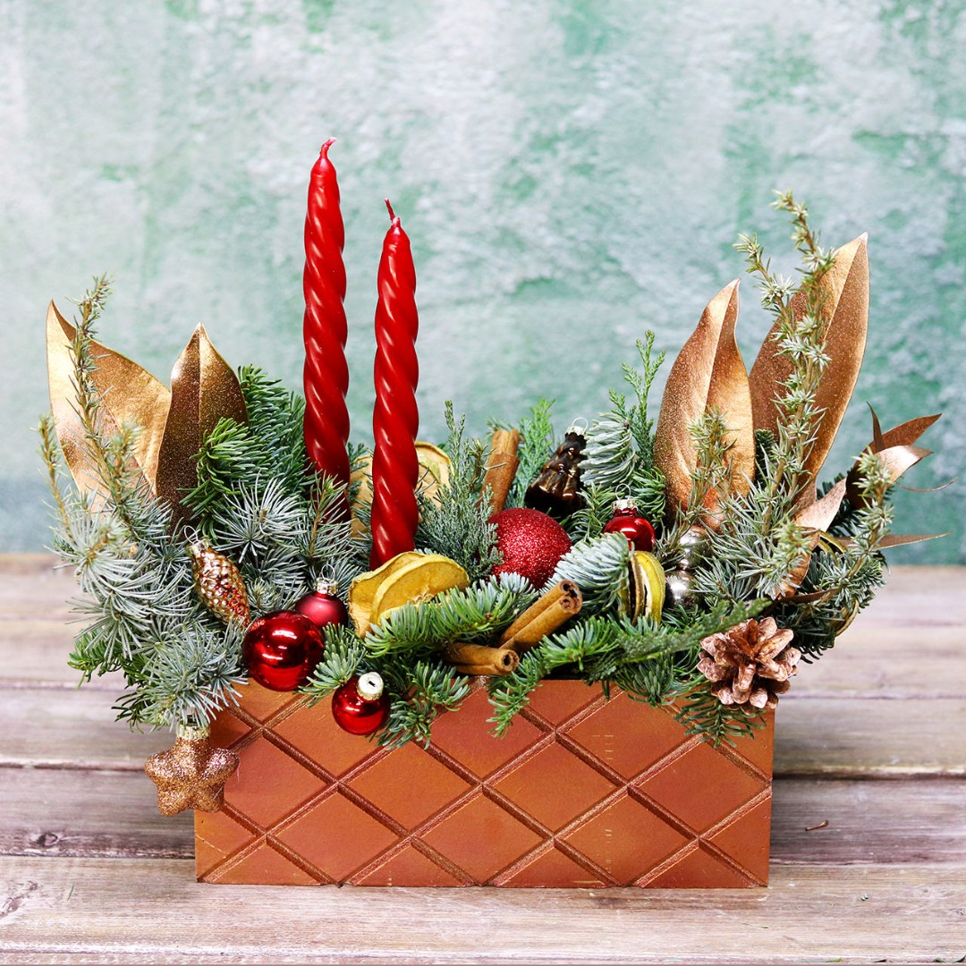 Деревянный ящик с новогодним декором - чудесный подарок для родных и друзей. Авторская новогодняя композиция из натуральной ели, выполненная в деревянном ящике прямоугольной формы. Этот подарок станет прекрасным украшением в домашнем интерьере и будет радовать получателя долгое время. Композиция выполнена на специальной флористической губке, она пропитана водой, это позволяет хвои максимально долго сохранять свою свежесть.