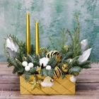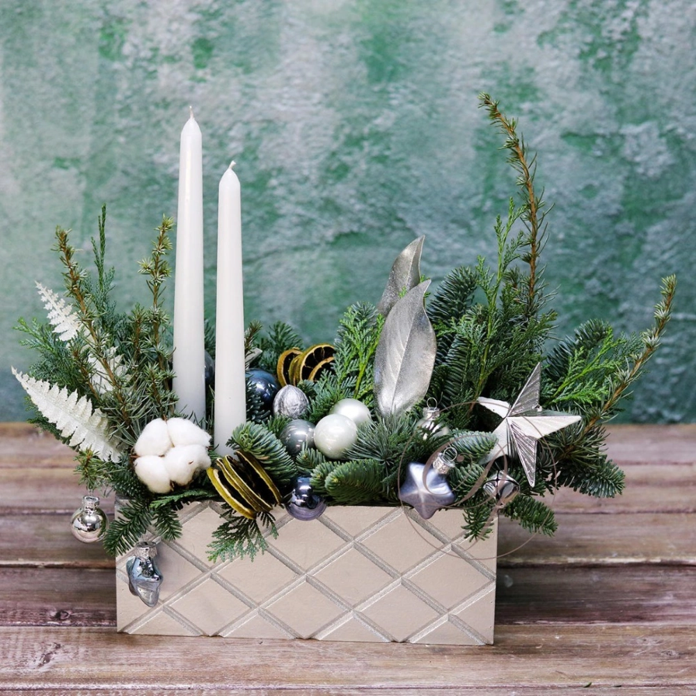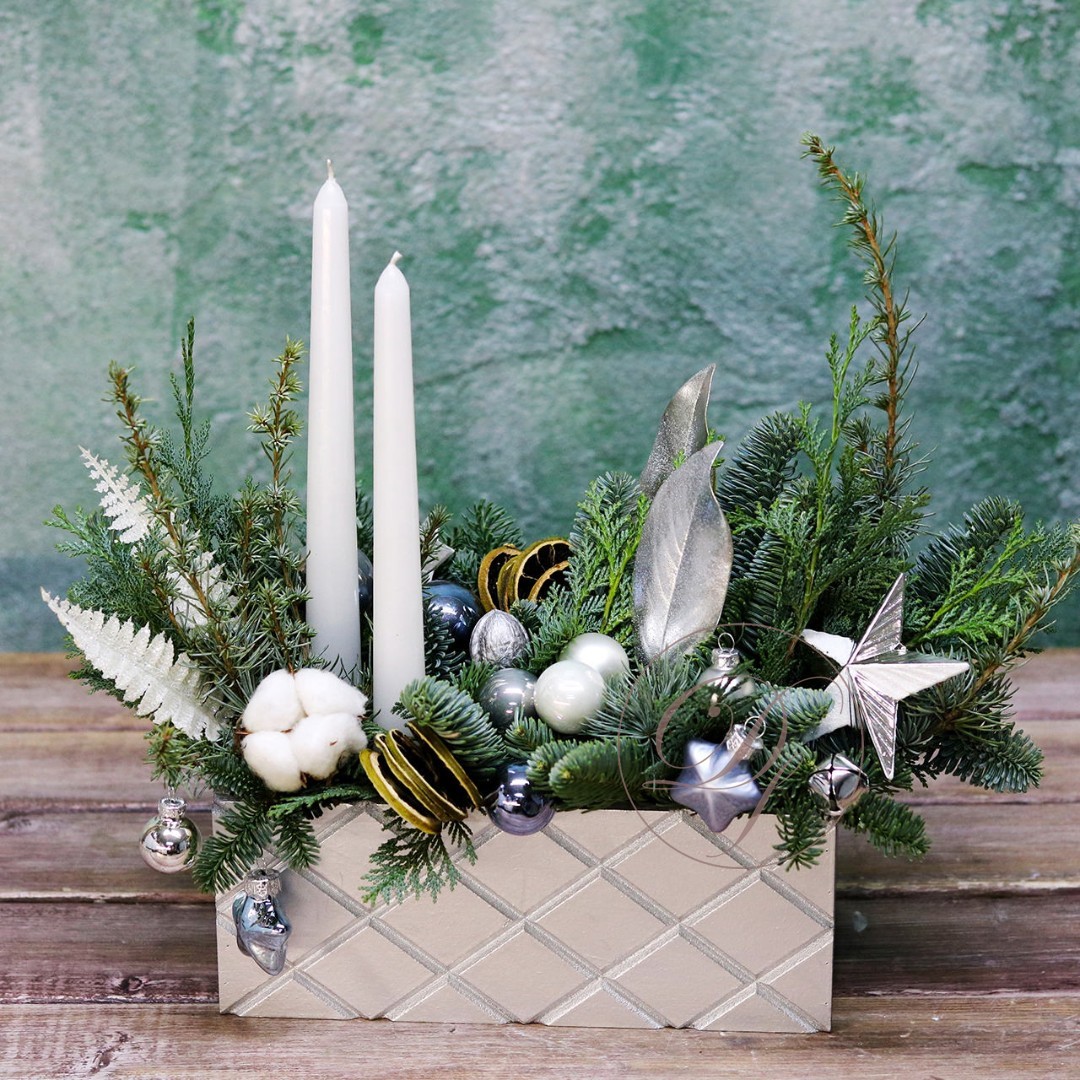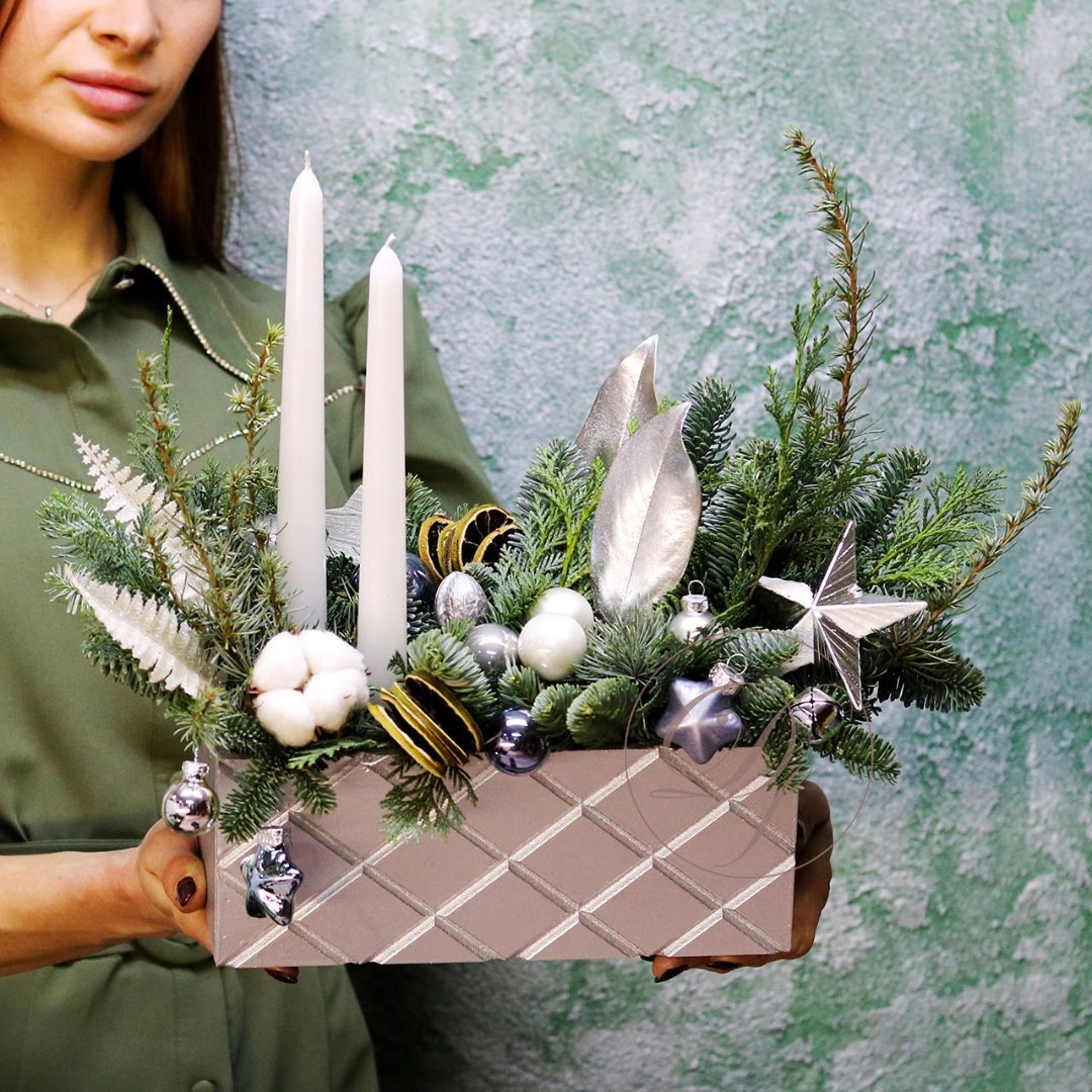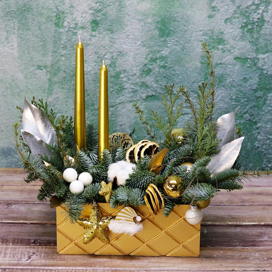 Деревянный ящик с новогодним декором - чудесный подарок для родных и друзей. Авторская новогодняя композиция из натуральной ели, выполненная в деревянном ящике прямоугольной формы. Этот подарок станет прекрасным украшением в домашнем интерьере и будет радовать получателя долгое время. Композиция выполнена на специальной флористической губке, она пропитана водой, это позволяет хвои максимально долго сохранять свою свежесть.
