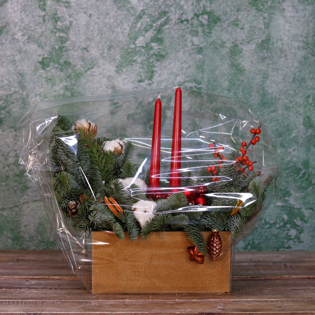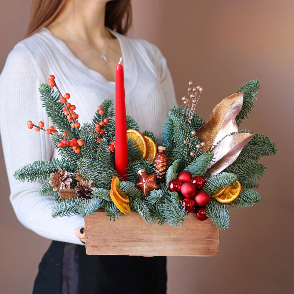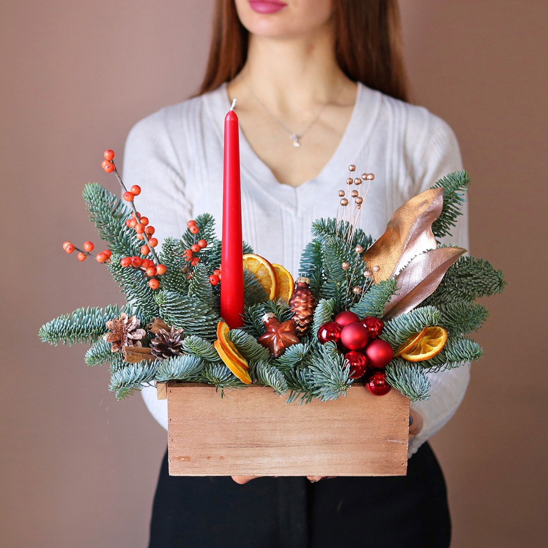 Деревянный ящик с новогодним декором - чудесный подарок для родных и друзей. Авторская новогодняя композиция из натуральной ели, выполненная в деревянном ящике прямоугольной формы. Этот подарок станет прекрасным украшением в домашнем интерьере и будет радовать получателя долгое время. Композиция выполнена на специальной флористической губке, она пропитана водой, это позволяет хвои максимально долго сохранять свою свежесть.