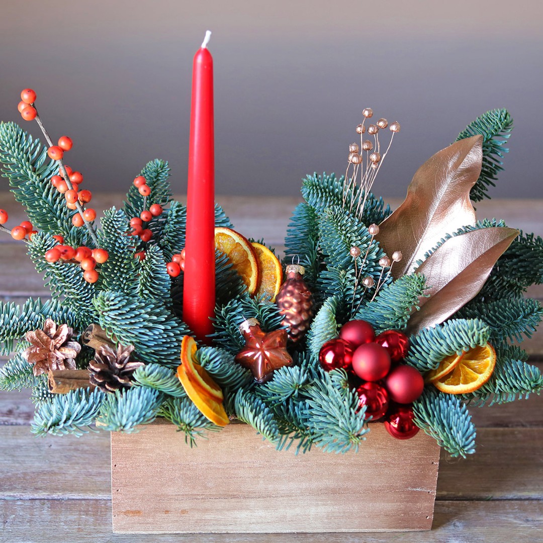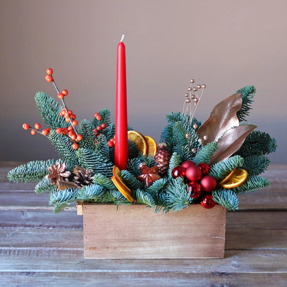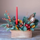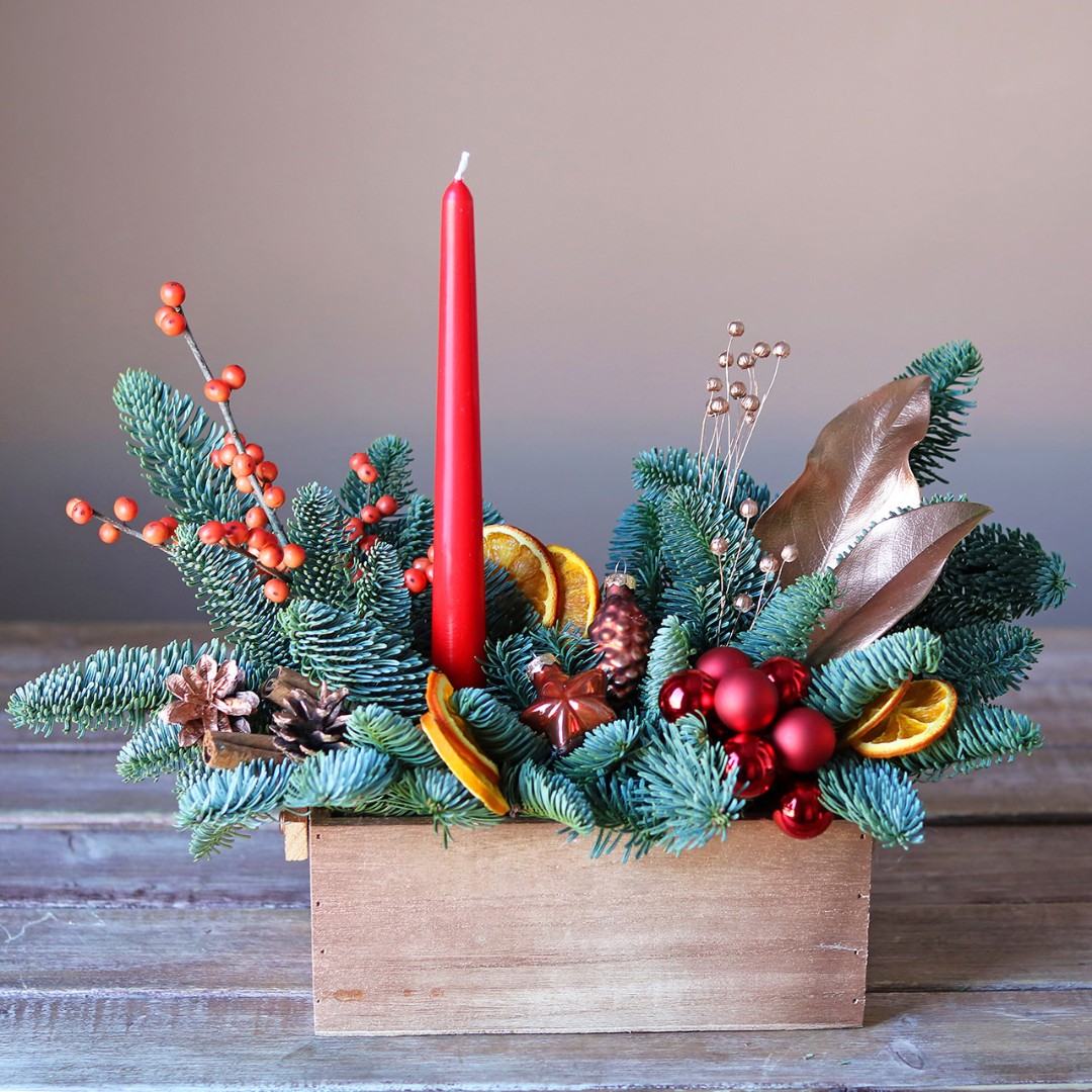 Деревянный ящик с новогодним декором - чудесный подарок для родных и друзей. Авторская новогодняя композиция из натуральной ели, выполненная в деревянном ящике прямоугольной формы. Этот подарок станет прекрасным украшением в домашнем интерьере и будет радовать получателя долгое время. Композиция выполнена на специальной флористической губке, она пропитана водой, это позволяет хвои максимально долго сохранять свою свежесть.