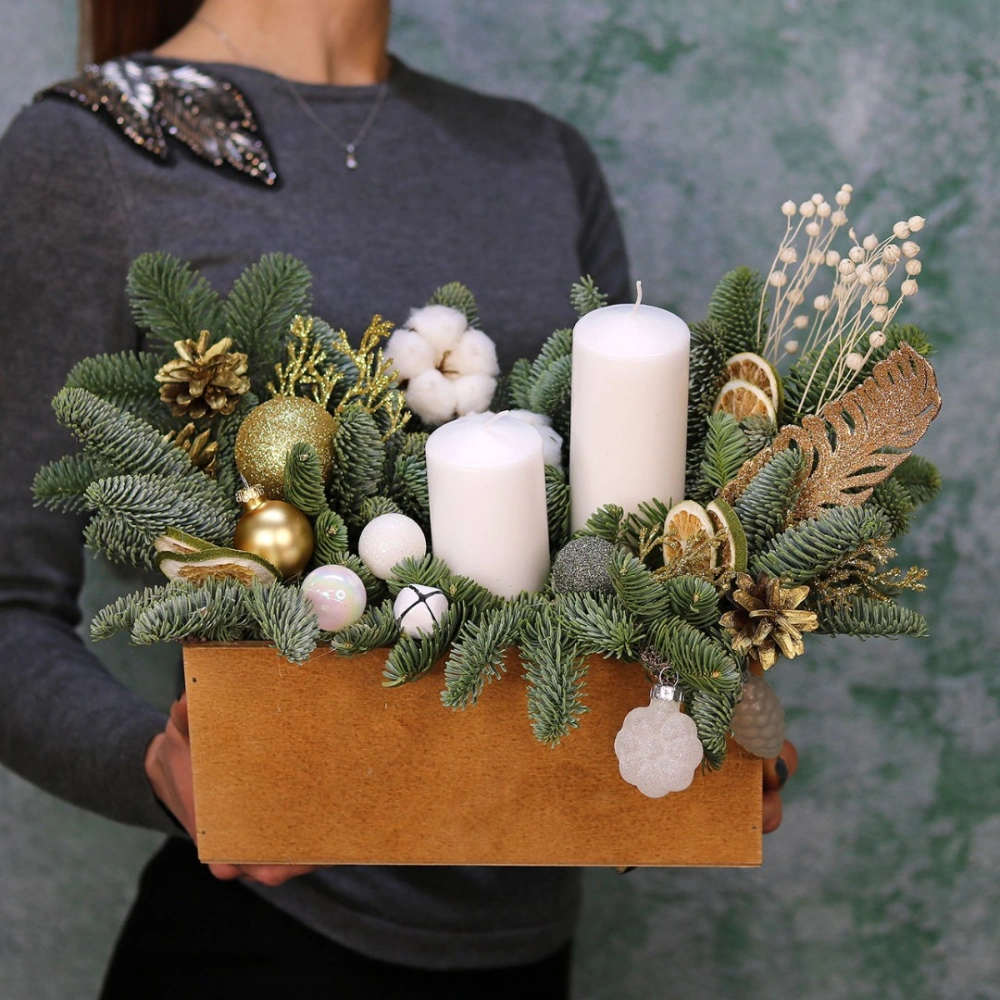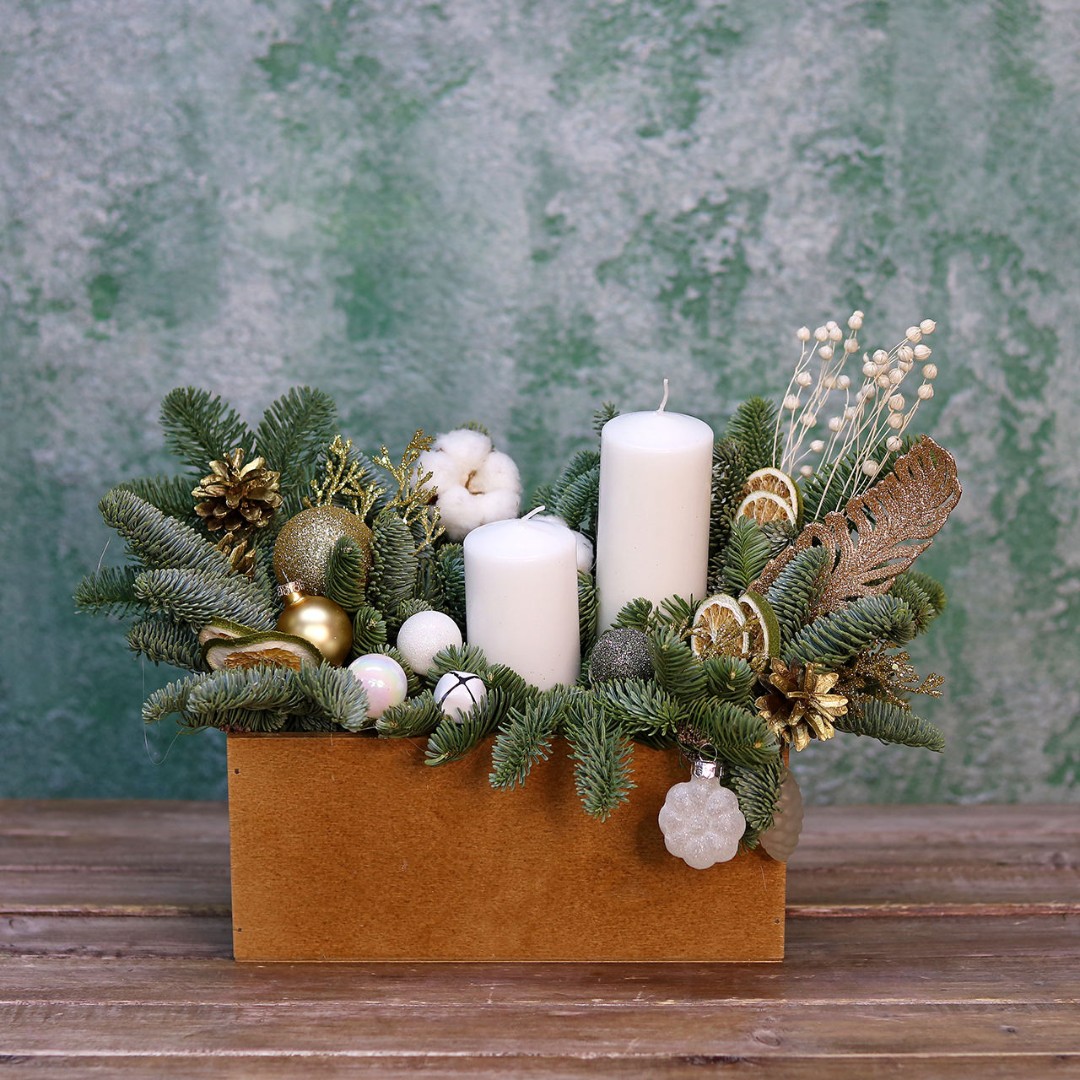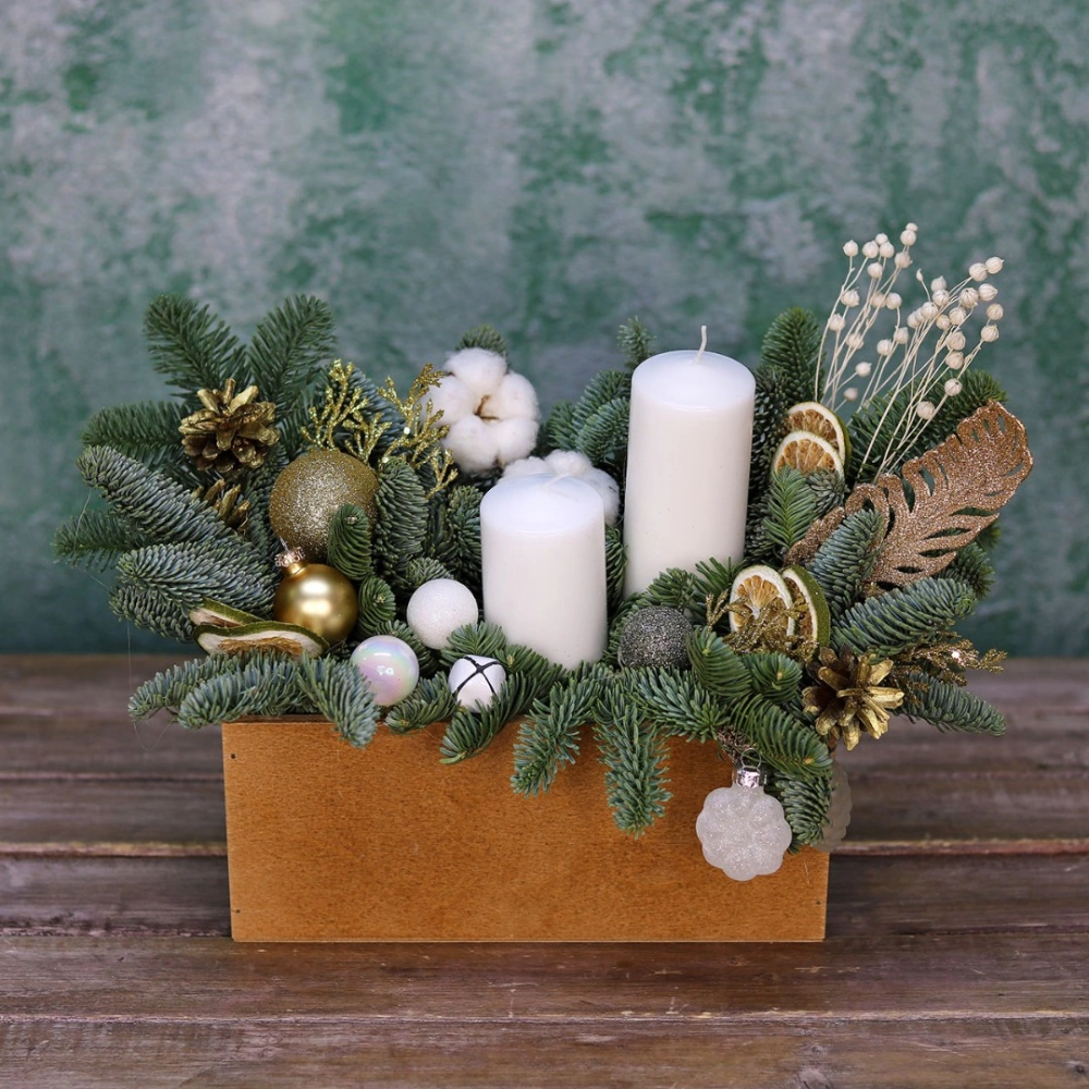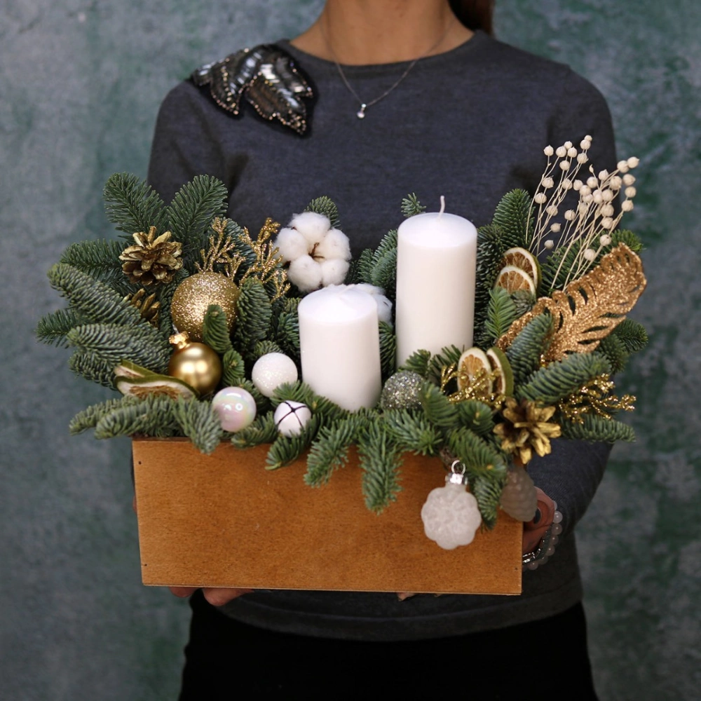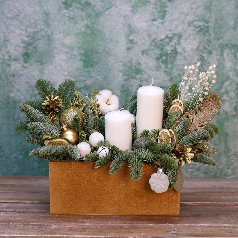 Новогодняя композиция из натуральной хвои со свечами и декором на заказ. На фотографии размер S. Размер композиции можно выбрать в карточке товара.