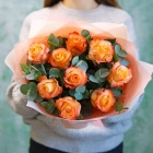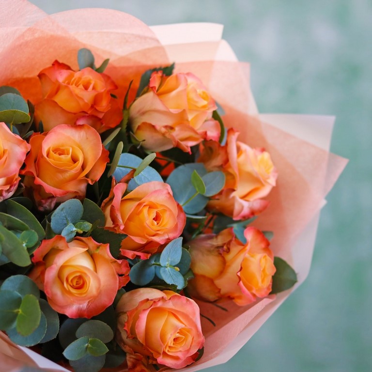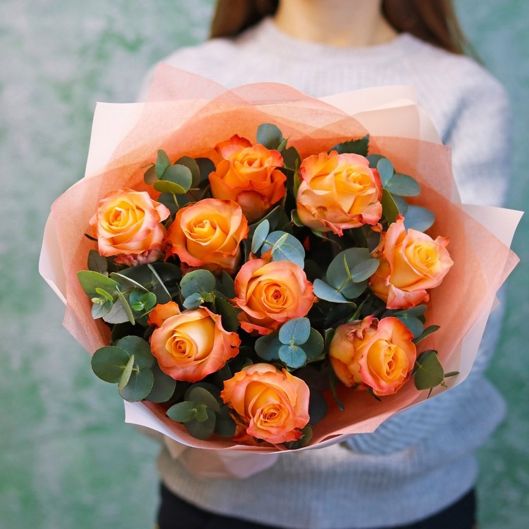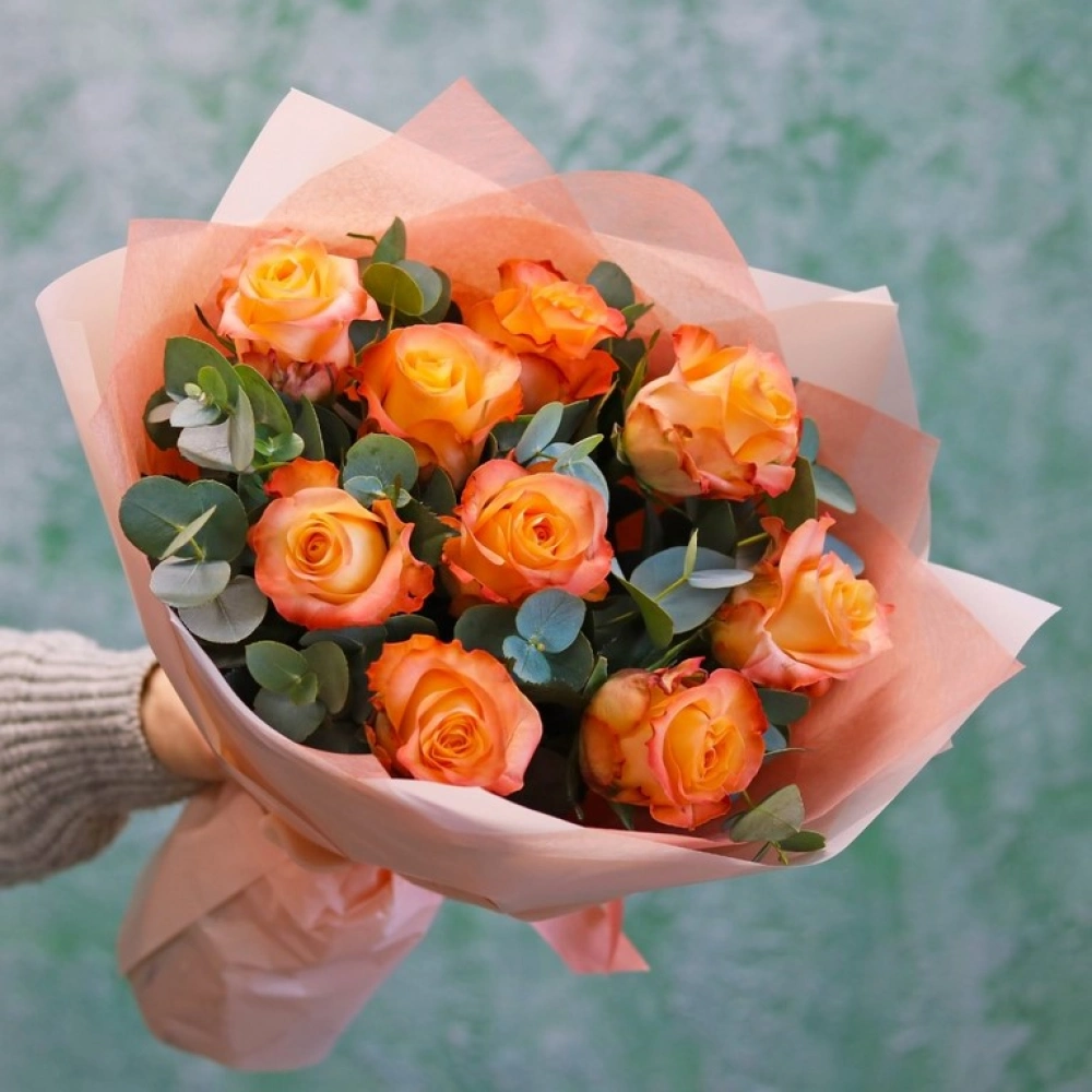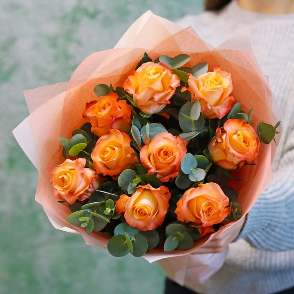 Букет из оранжевых роз с зеленью эвкалипта. Вы можете выбрать любое количество роз, указанное в перечне к данному букету.