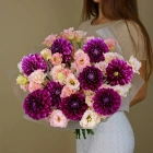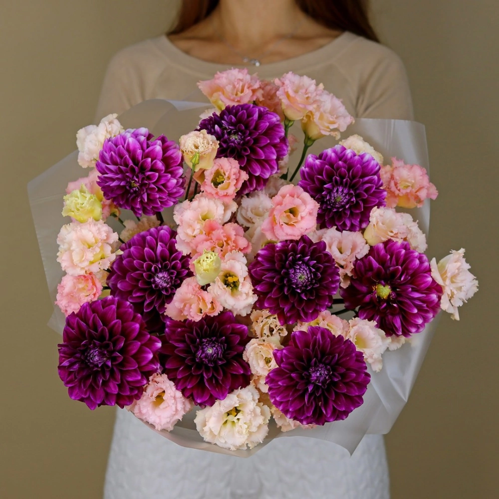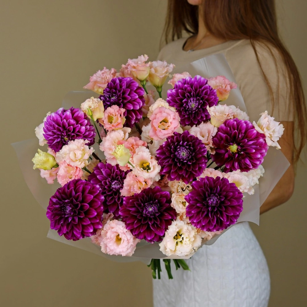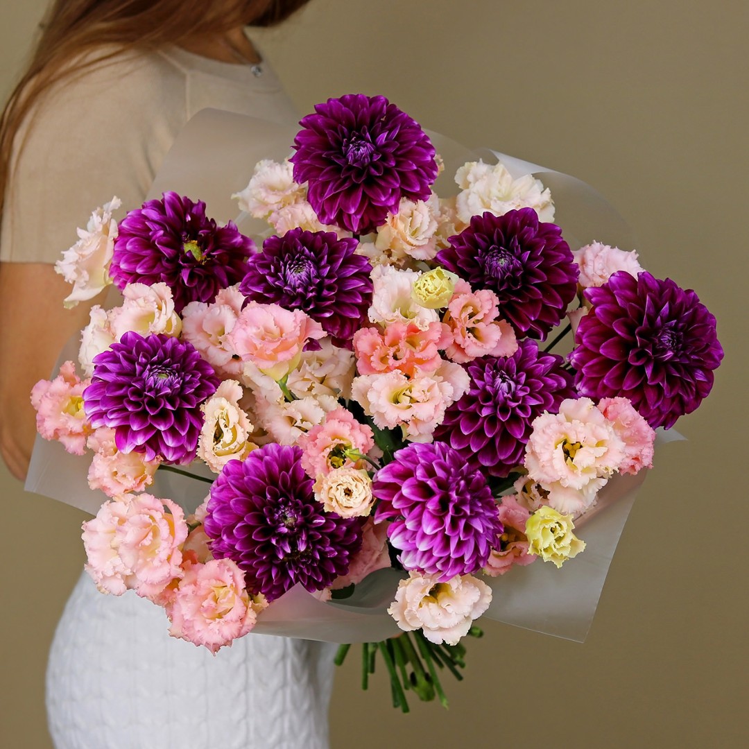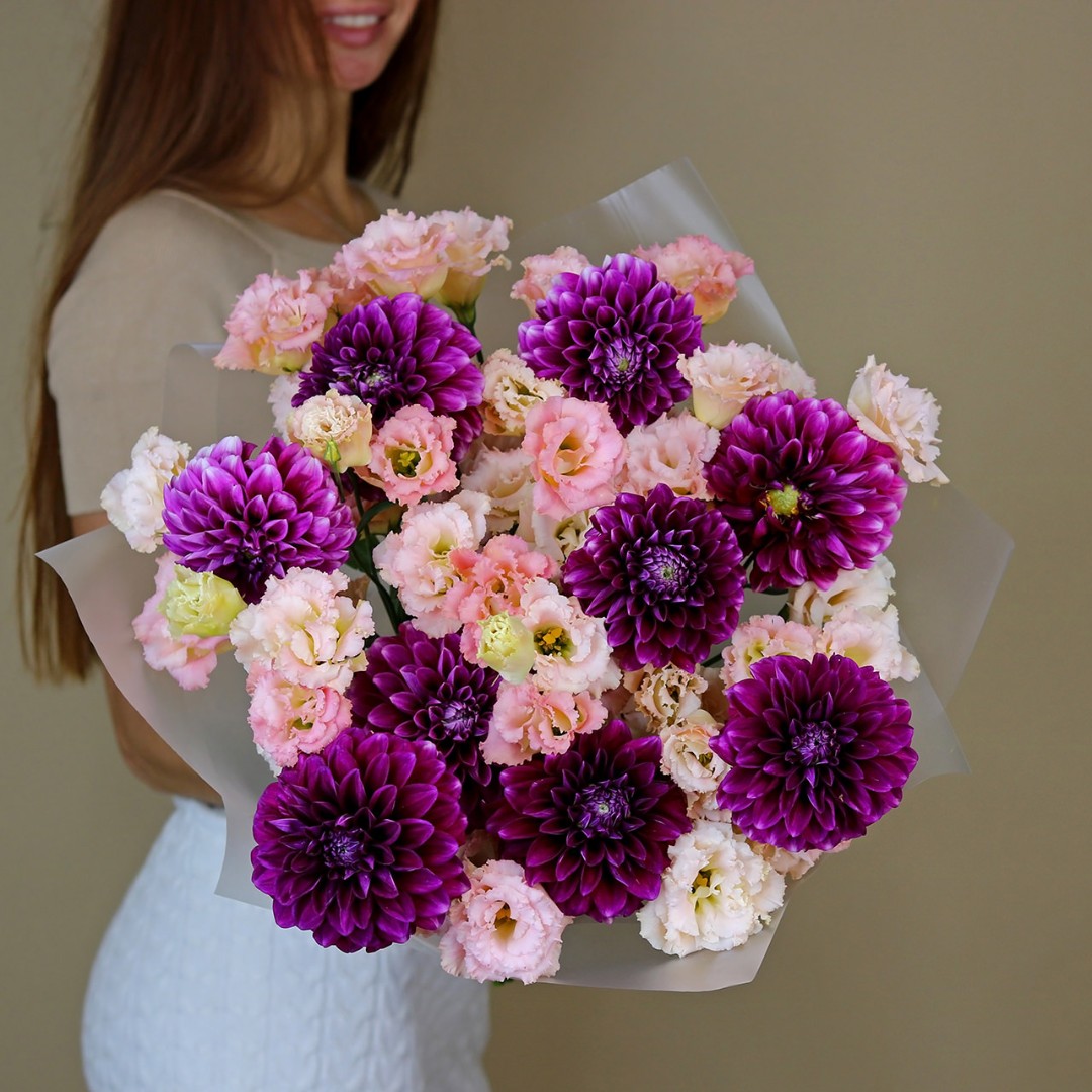 Букет из Георгин и эустомы. Вы можете выбрать любое количество цветов указанное в перечне к данному букету.