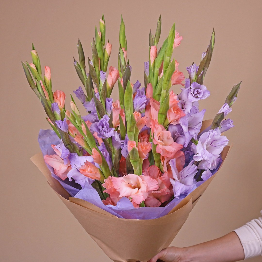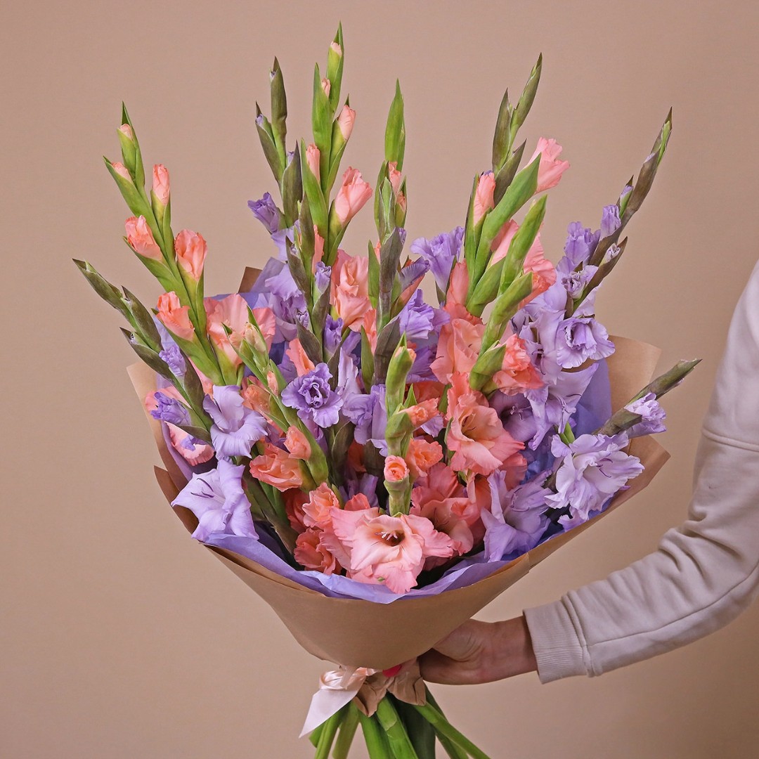Персиковые и лавандовые гладиолусы