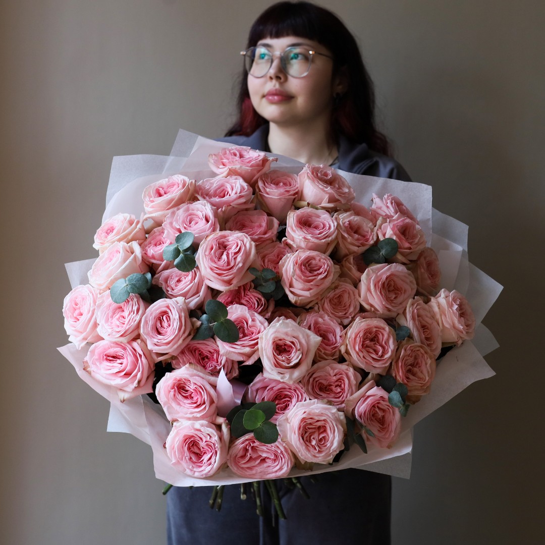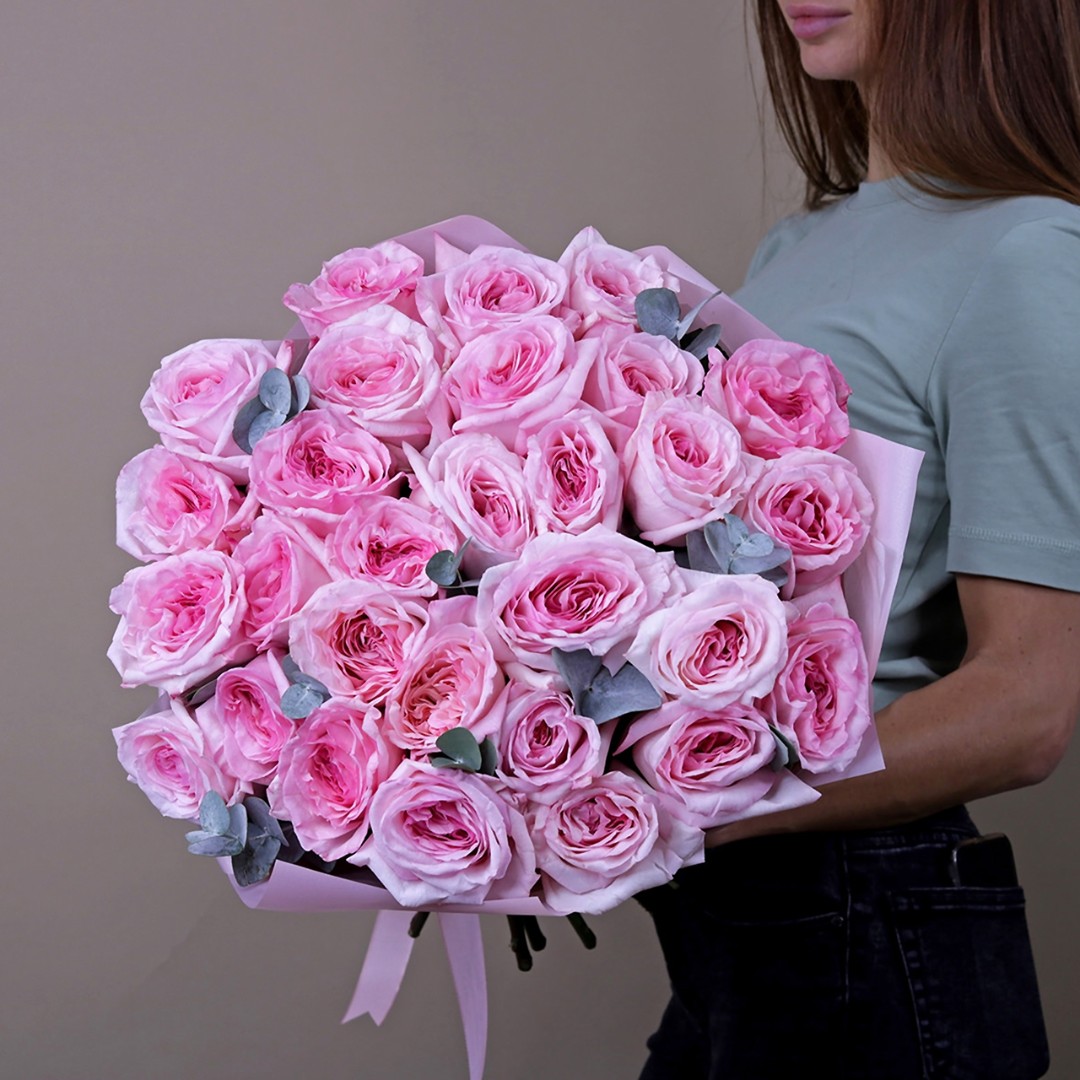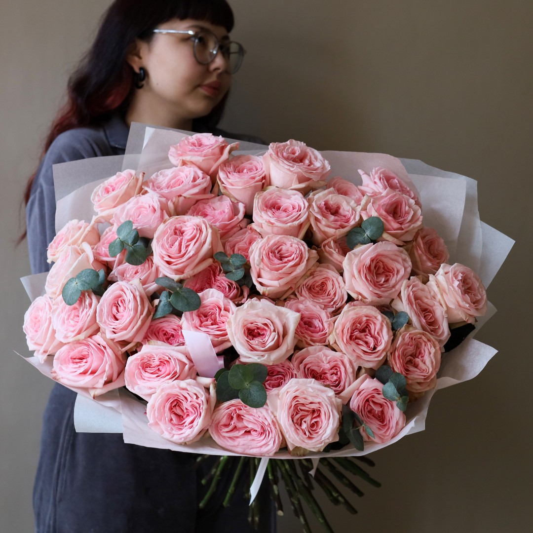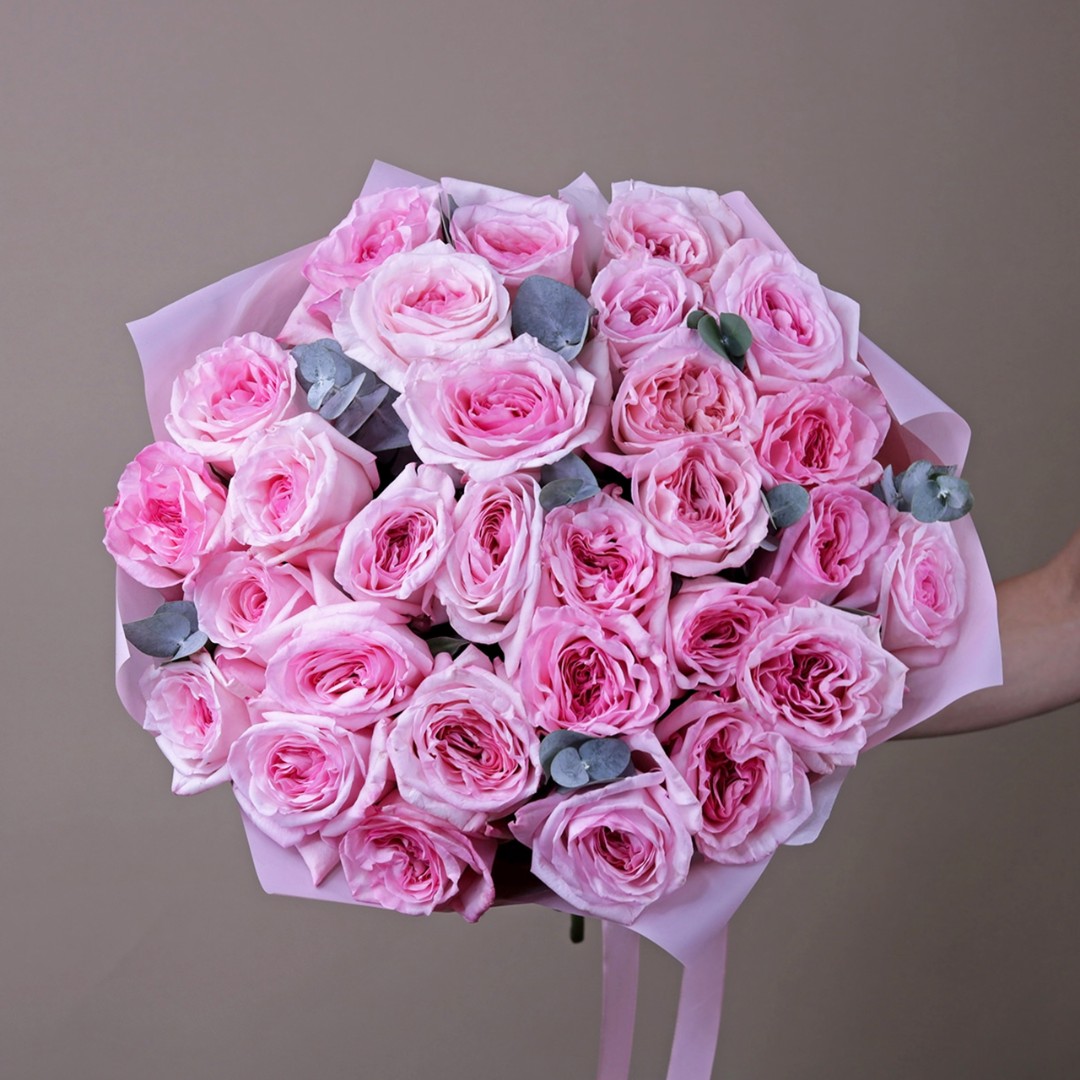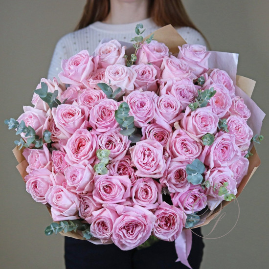 Букет из ароматных розовых пионовидных роз сорта Пинк Охара. На фотографии букет из 35 пионовидных роз. Вы можете выбрать любое количество цветов указанное в перечне к данному букету.