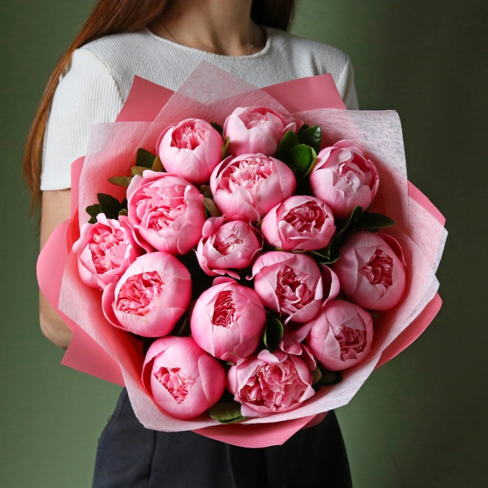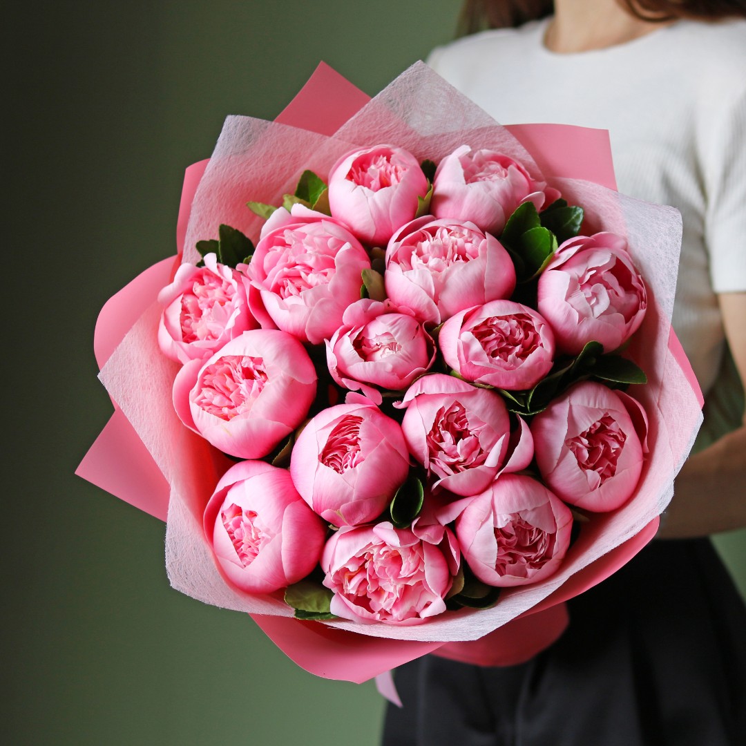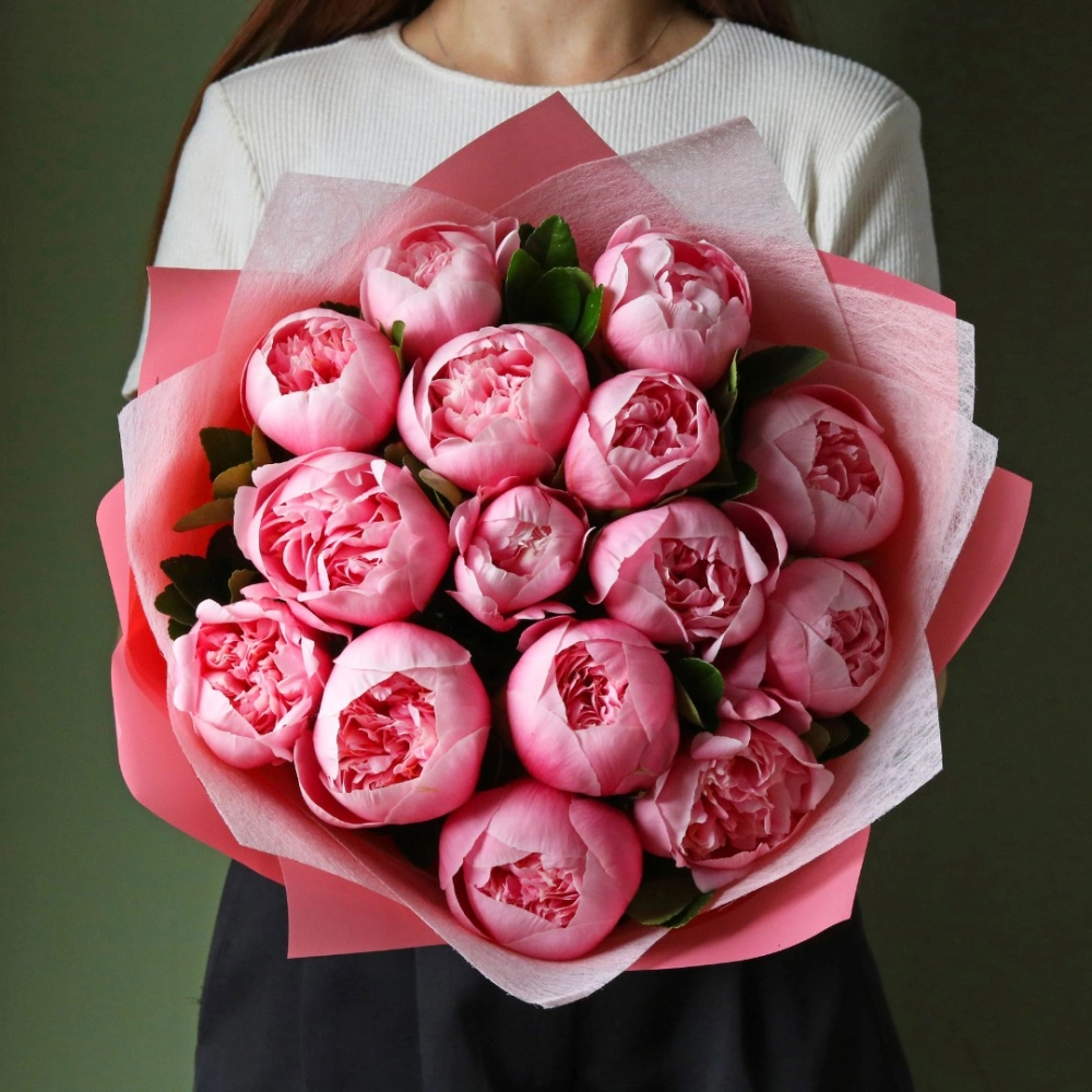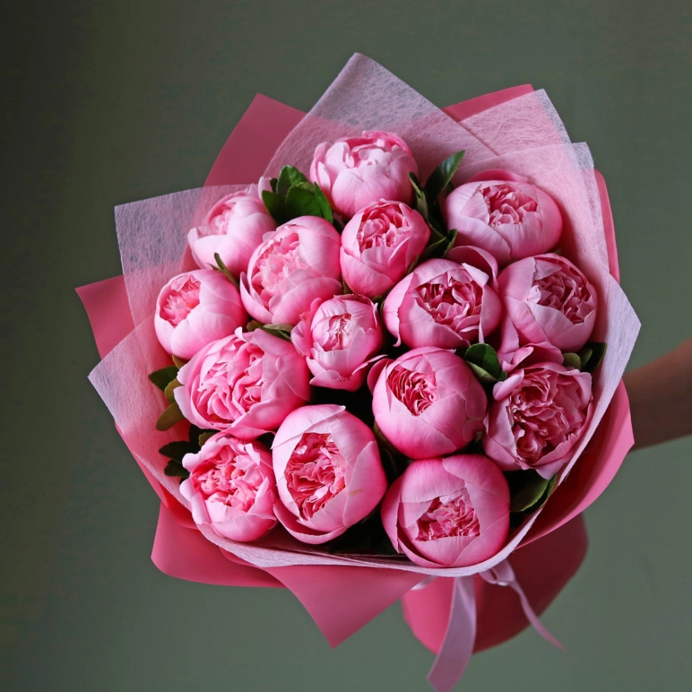 Букет розовых пионов Dakota flora. На фотографии букет из 15 пионов Салмон. Вы можете выбрать любое количество цветов указанное в перечне к данному букету.