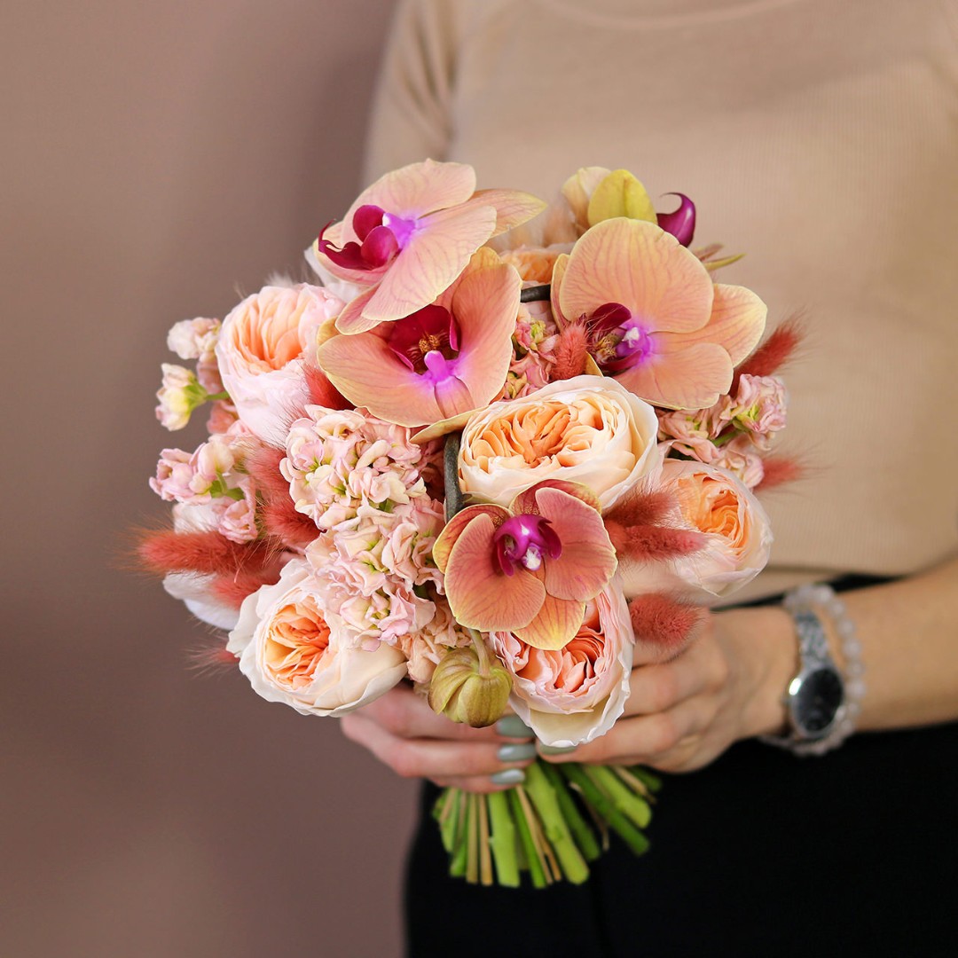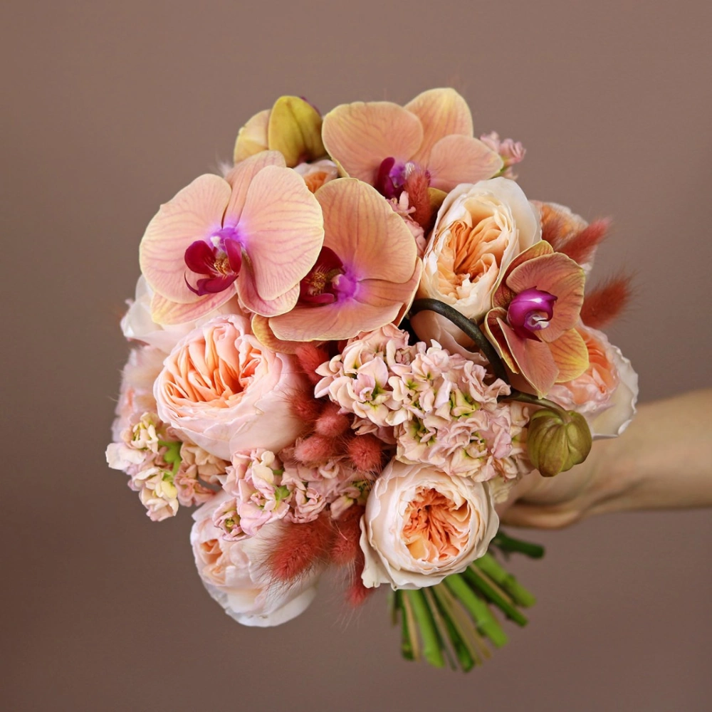 В составе букета: роза пионовидная Джульетта, орхидея, маттиола.
