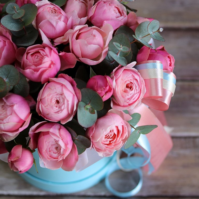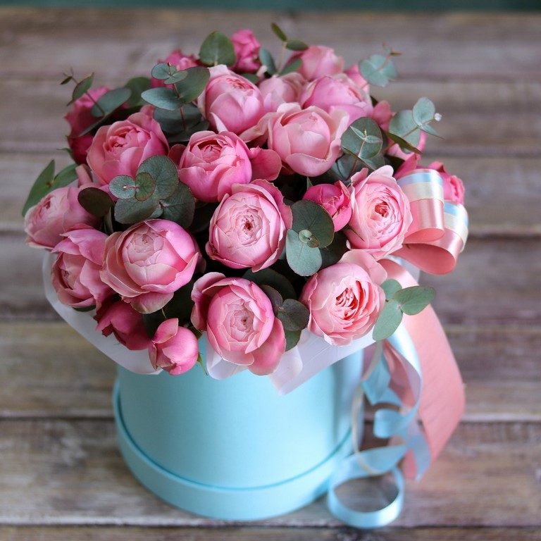 Цветы в коробках это композиции, составленные с использованием специальной губки Oasis (пиафлор) которая пропитана водой. Для того чтобы цветы дольше оставались свежими, добавляйте в нее немного воды каждый день.