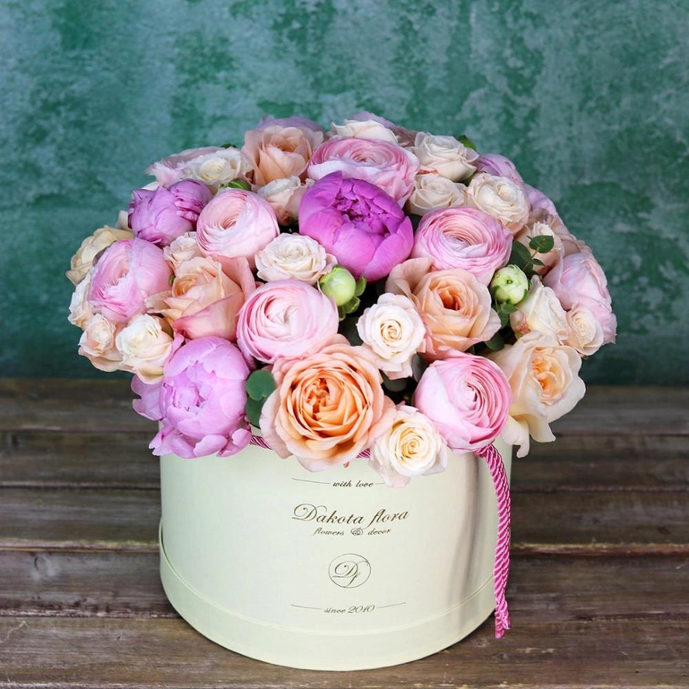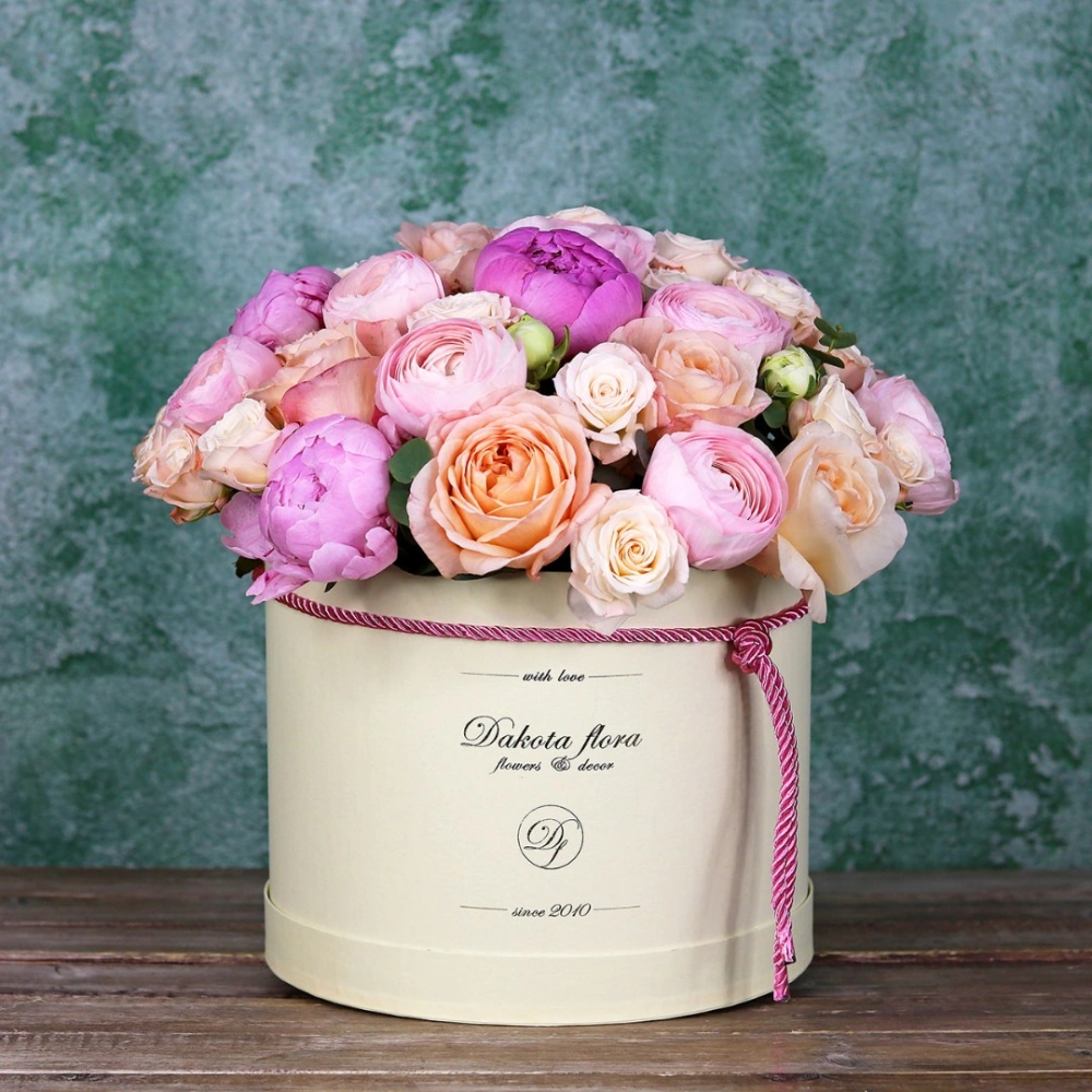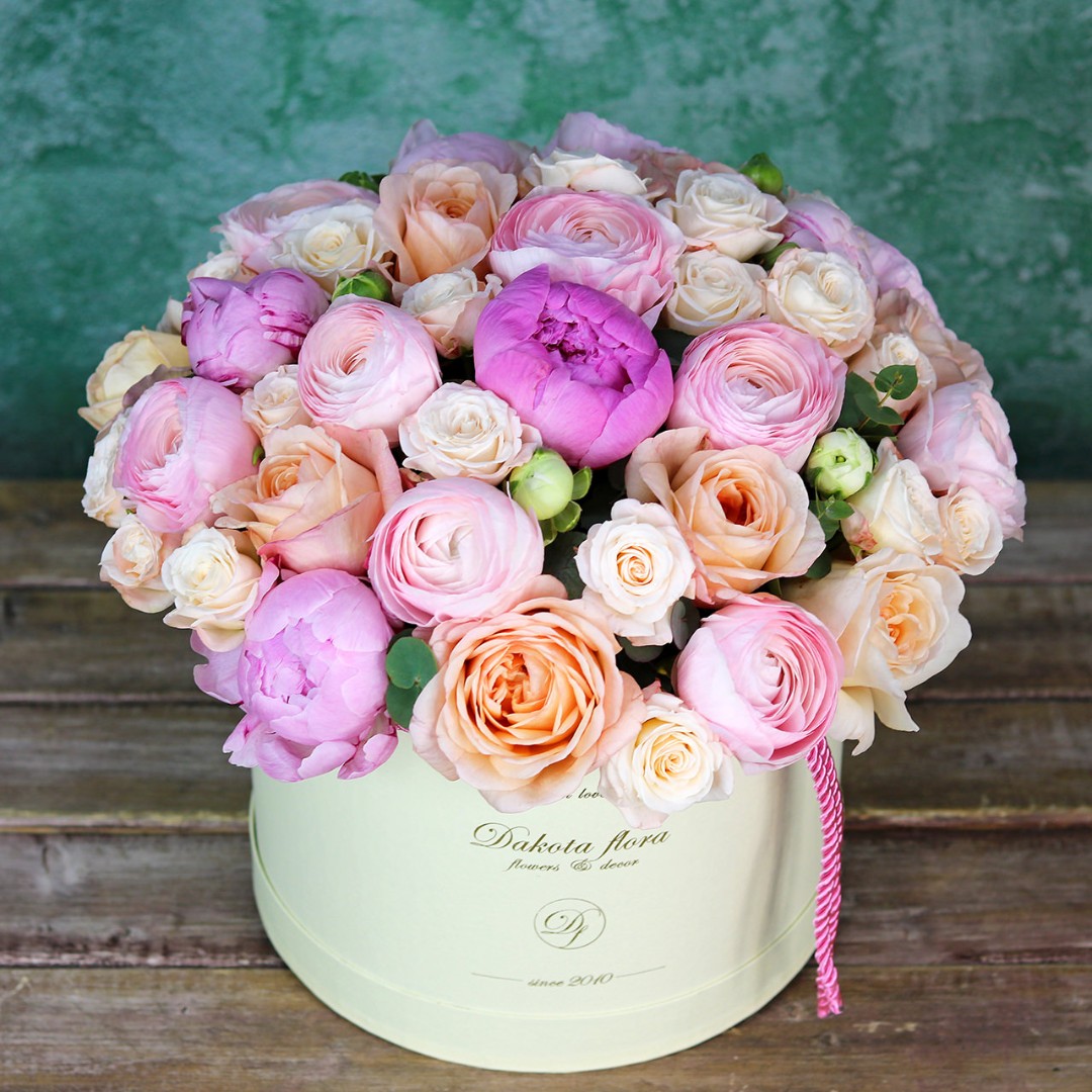 Цветы в коробках это композиции, составленные с использованием специальной губки Oasis (пиафлор) которая пропитана водой. Для того чтобы цветы дольше оставались свежими, добавляйте в нее немного воды каждый день.
