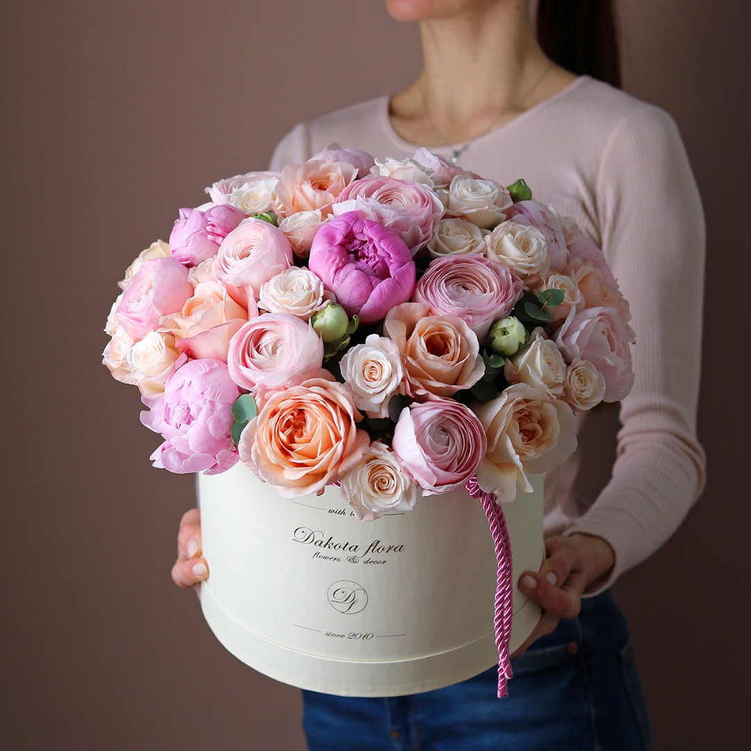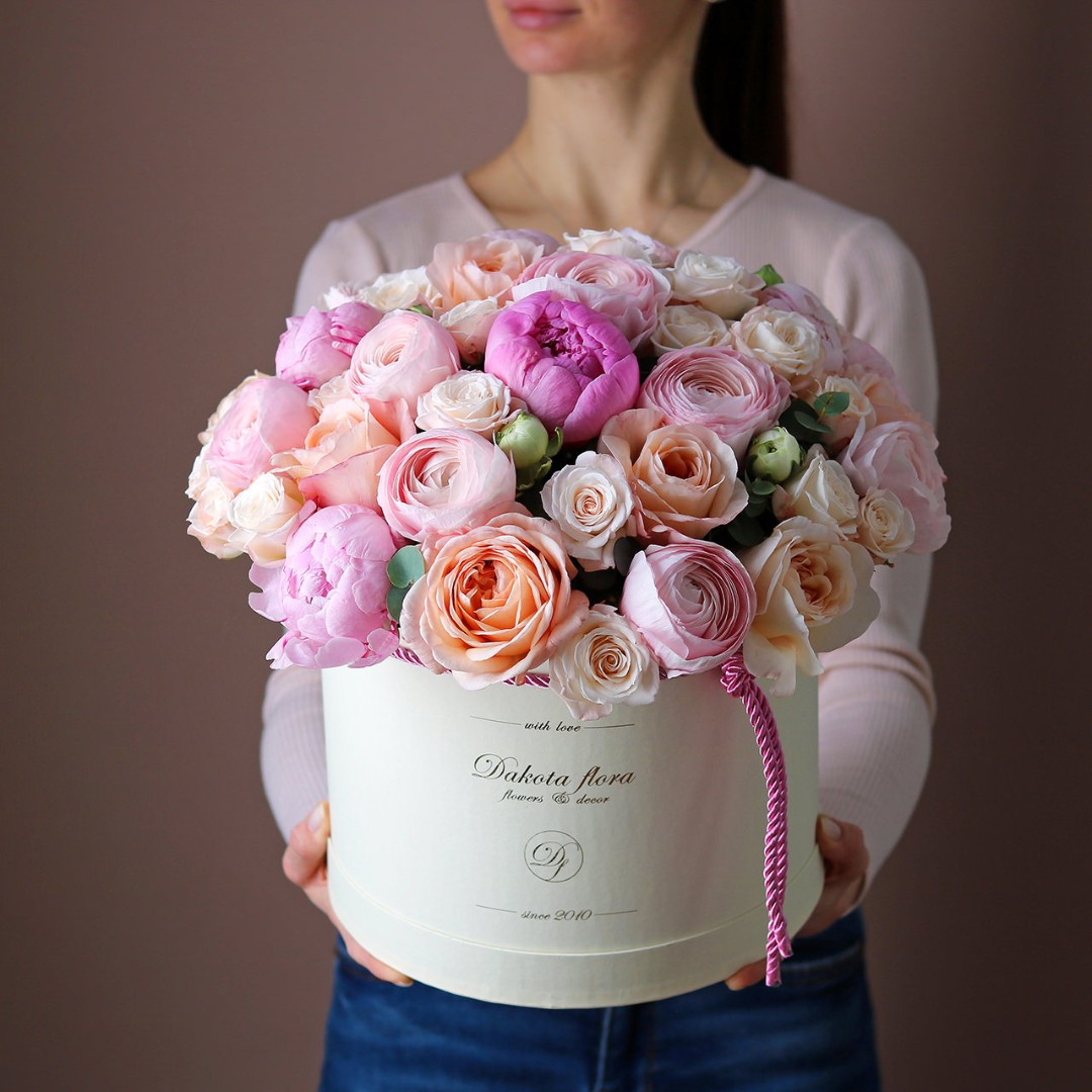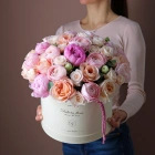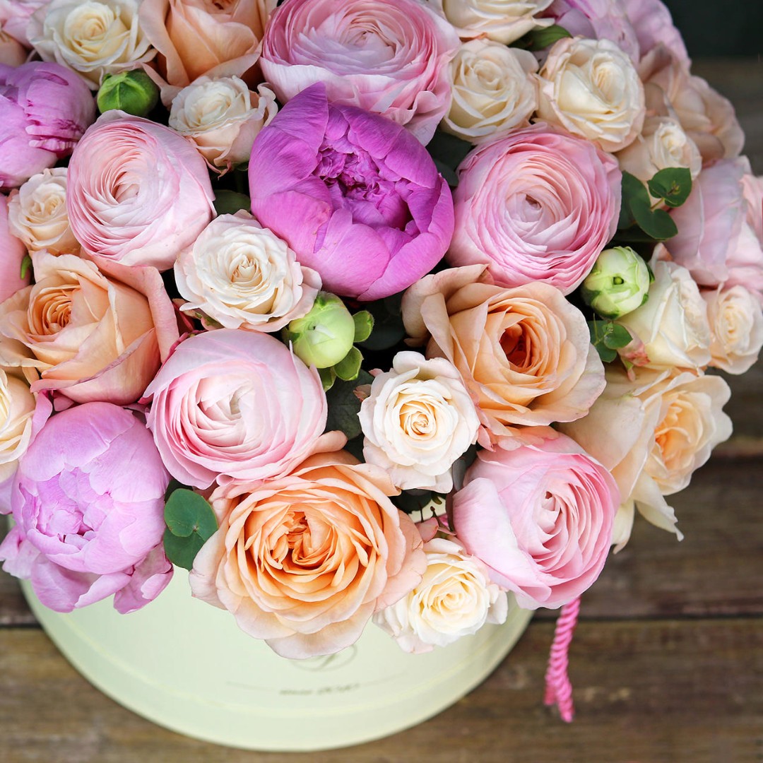 Цветы в коробках это композиции, составленные с использованием специальной губки Oasis (пиафлор) которая пропитана водой. Для того чтобы цветы дольше оставались свежими, добавляйте в нее немного воды каждый день.
