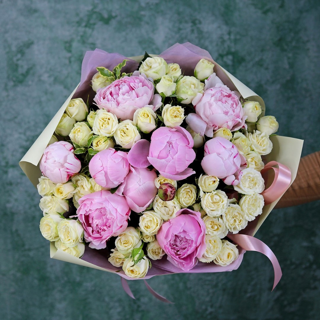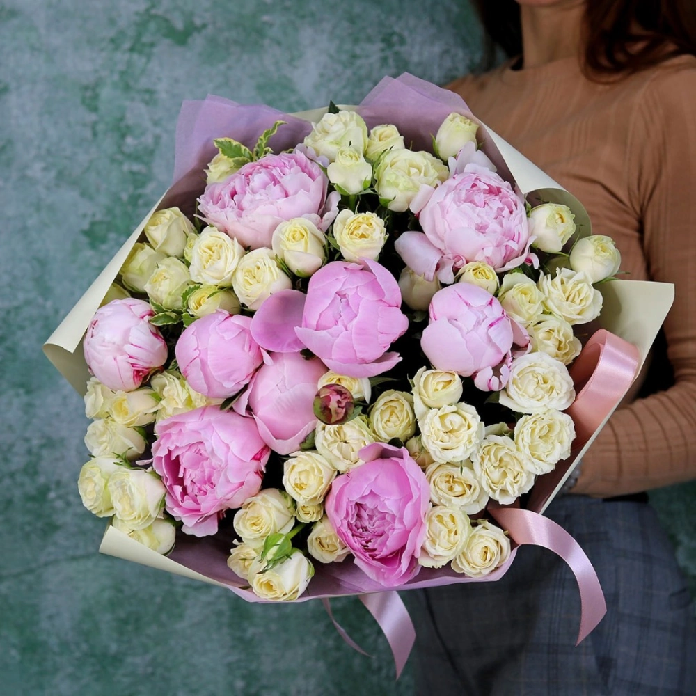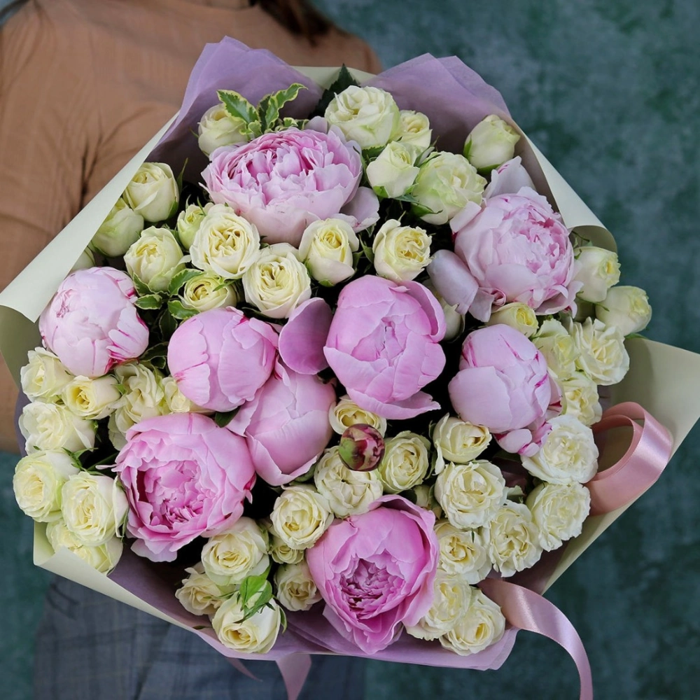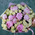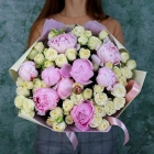 Букет из пионов сорт Гардения и кустовой розовой розы. На фотографии размер L.
