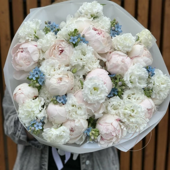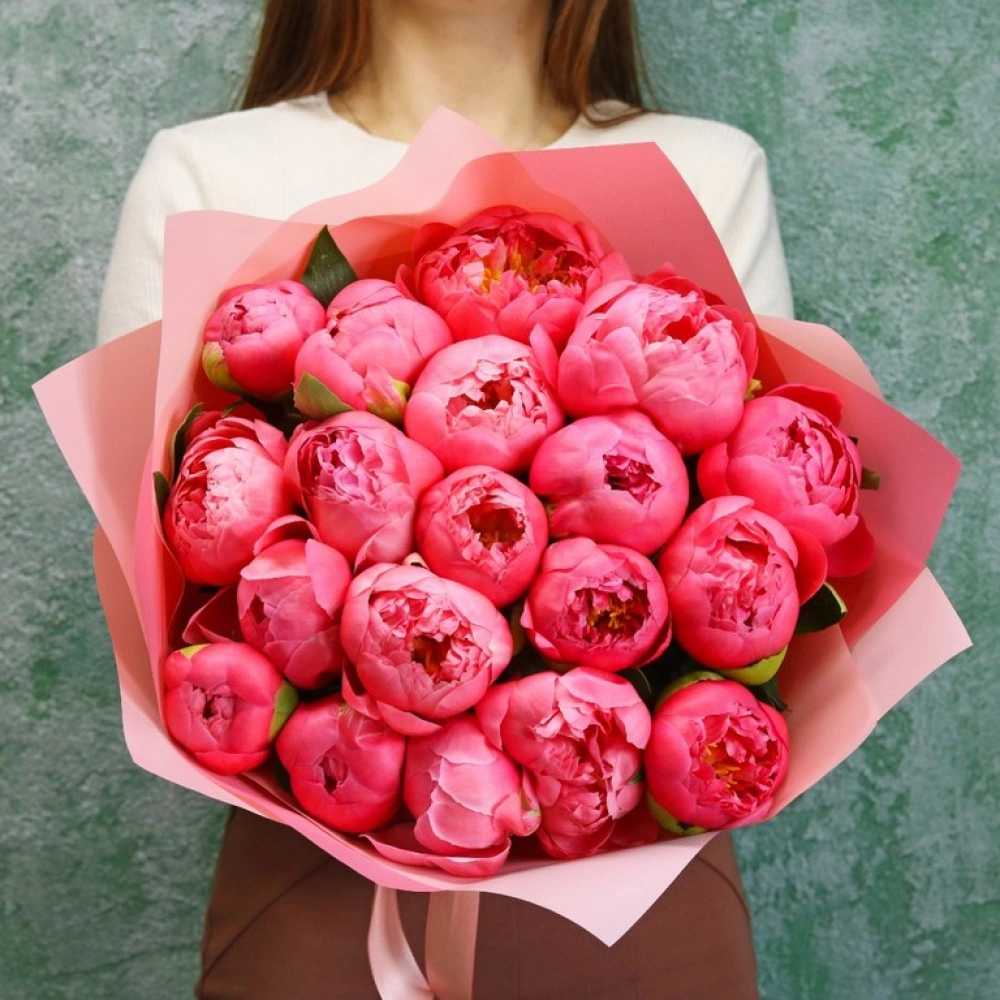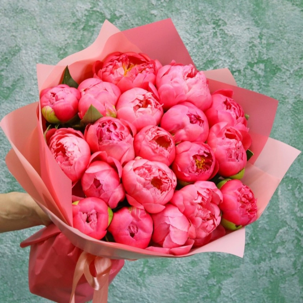 Пионы корал шарм букет Dakota flora. На фотографии букет из 19 пионов. Вы можете выбрать любое количество цветов указанное в перечне к данному букету.