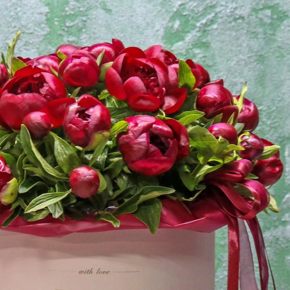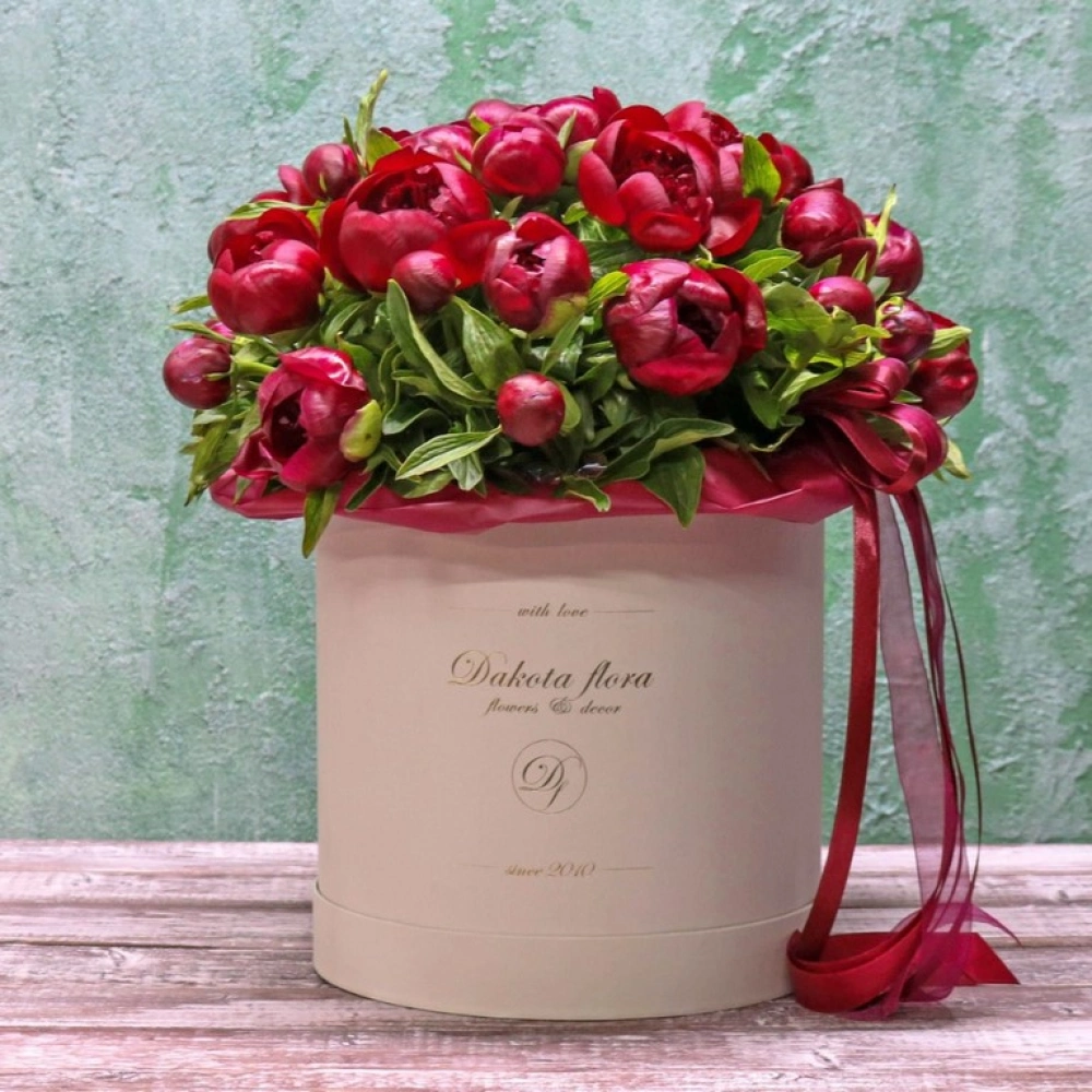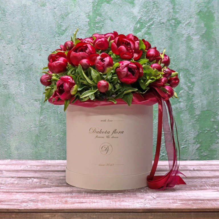 Пионы ред шарм в коробке Dakota flora. Пионы в коробке купить. Красные пионы в коробке. . Цветы в коробках это композиции, составленные с использованием специальной губки Oasis (пиафлор) которая пропитана водой. Для того чтобы цветы дольше оставались свежими, добавляйте в нее немного воды каждый день.