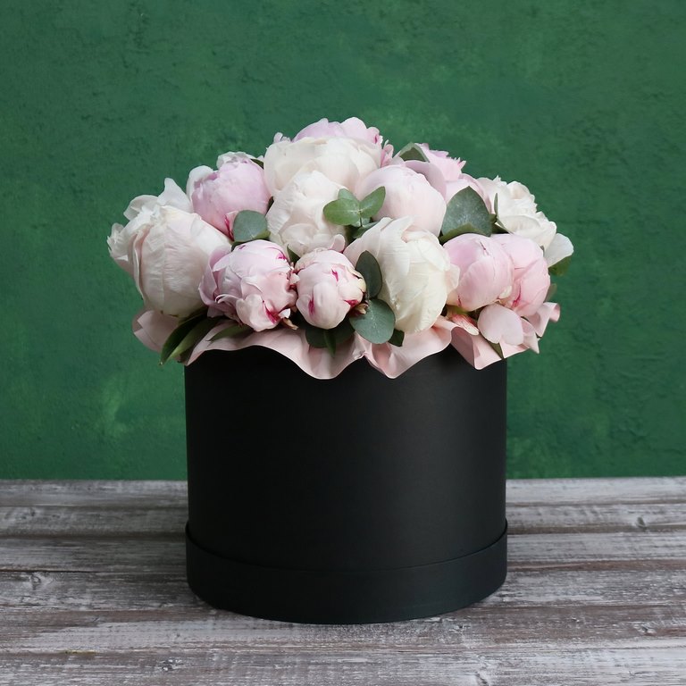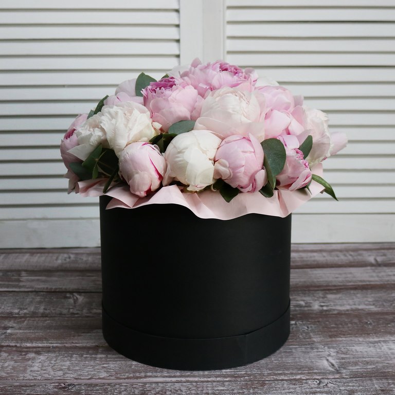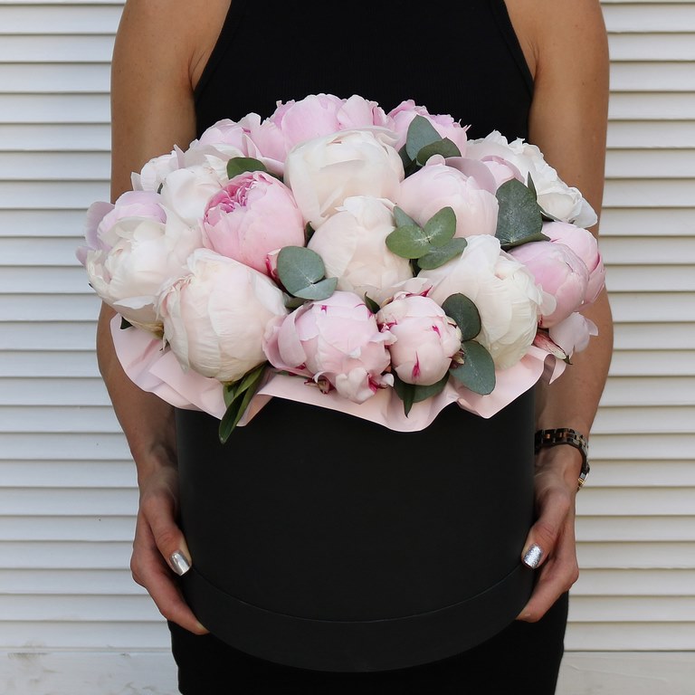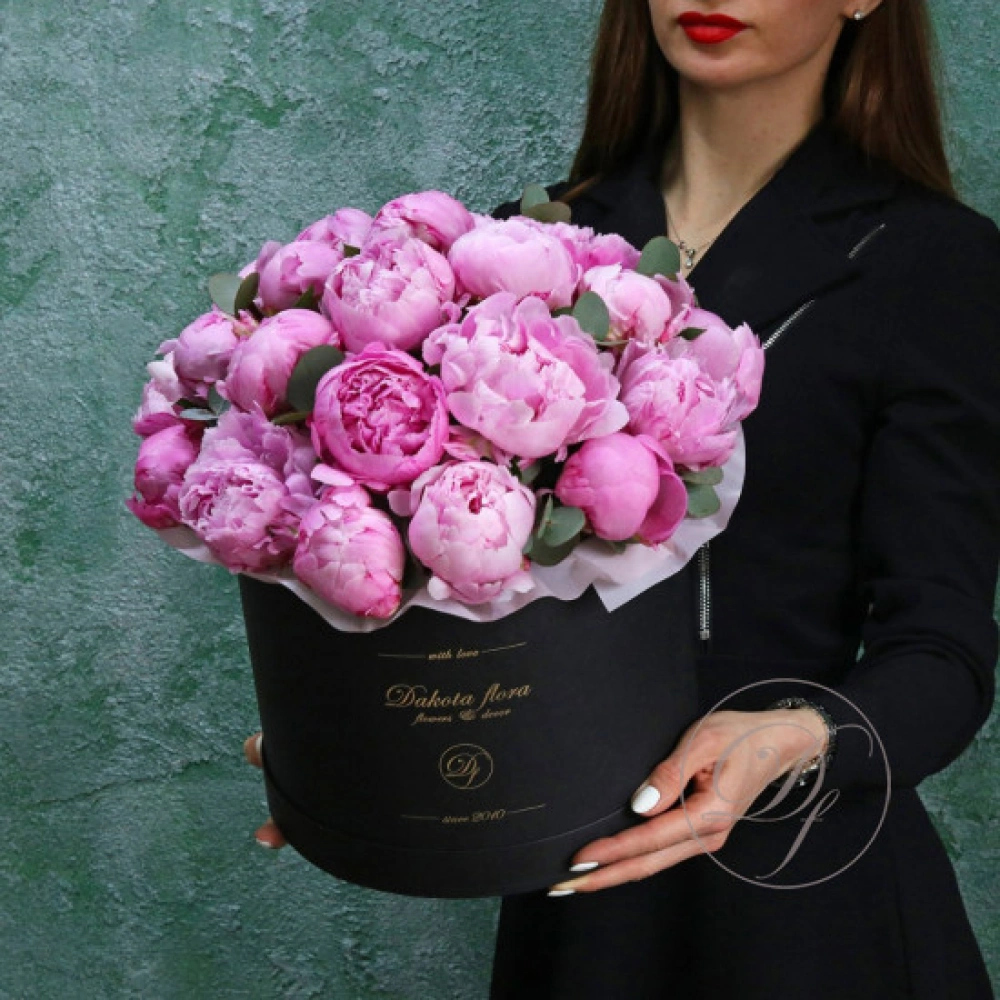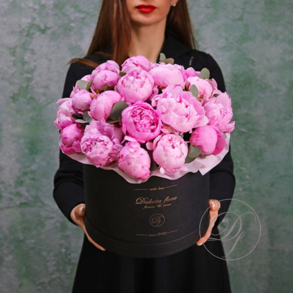 Пионы в коробке Dakota flora. На фотографии 25 пионов. Цветы в коробках это композиции, составленные с использованием специальной губки Oasis (пиафлор) которая пропитана водой. Для того чтобы цветы дольше оставались свежими, добавляйте в нее немного воды каждый день.