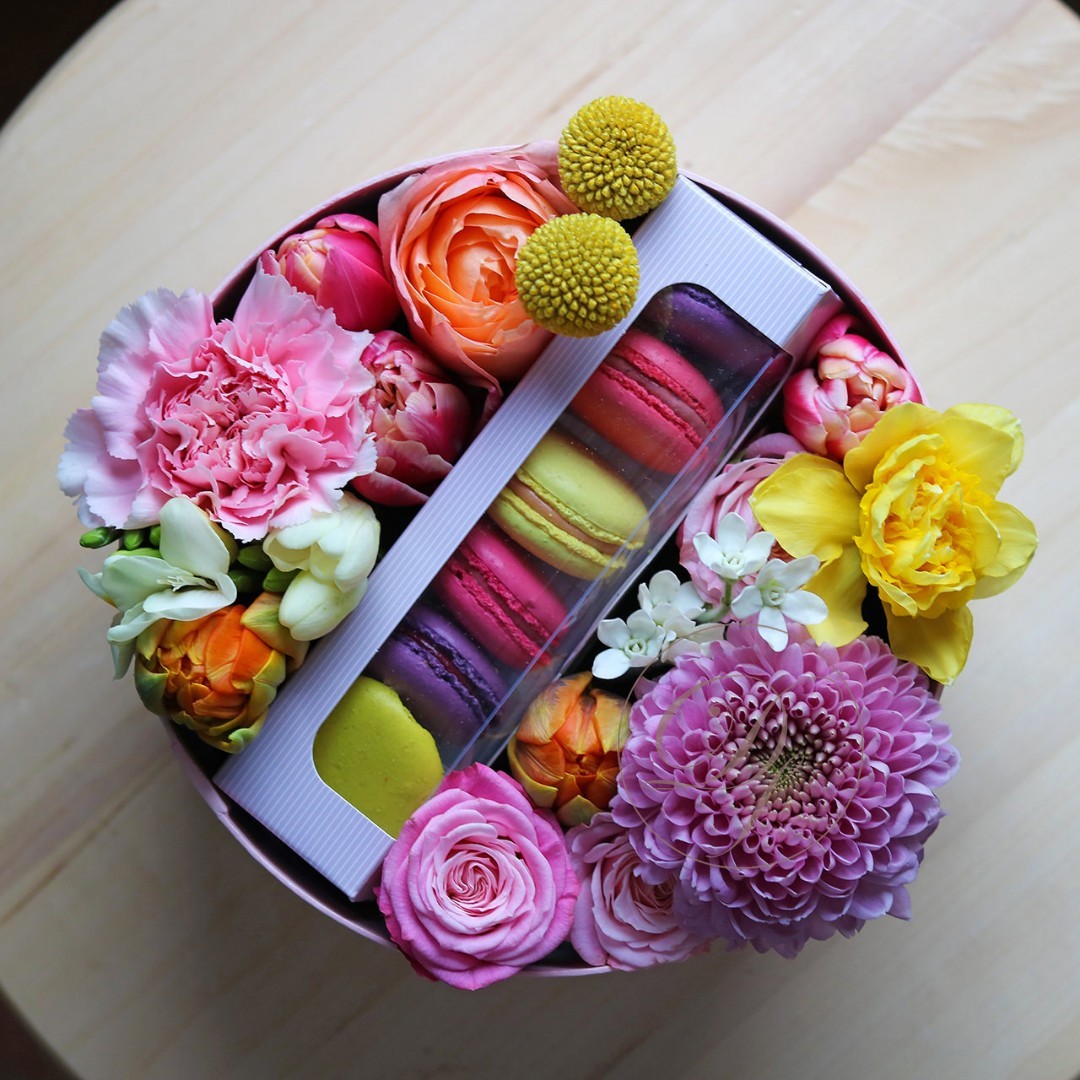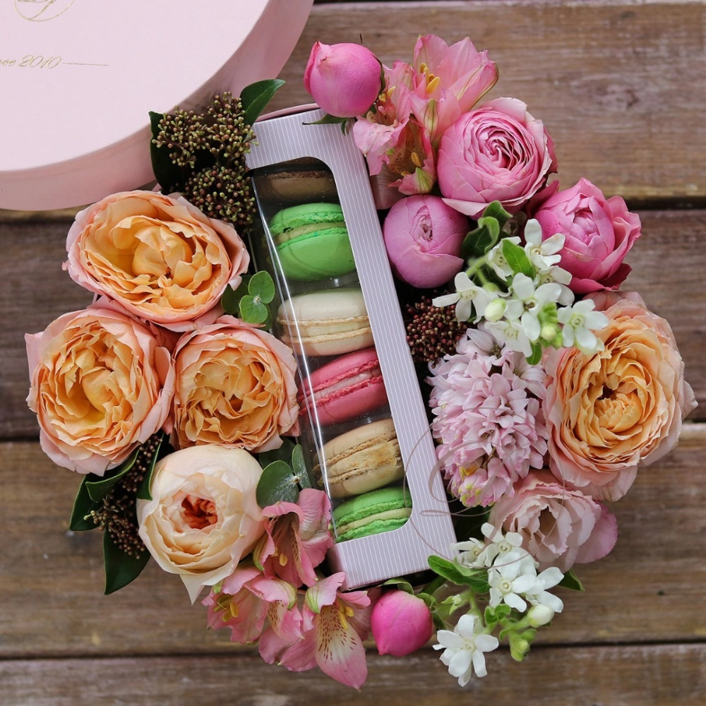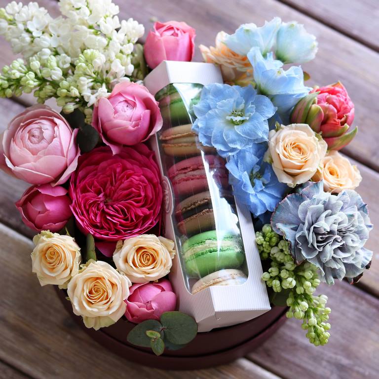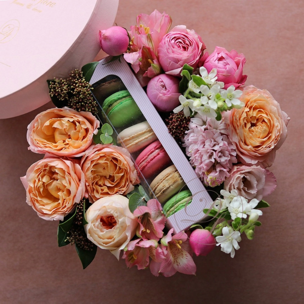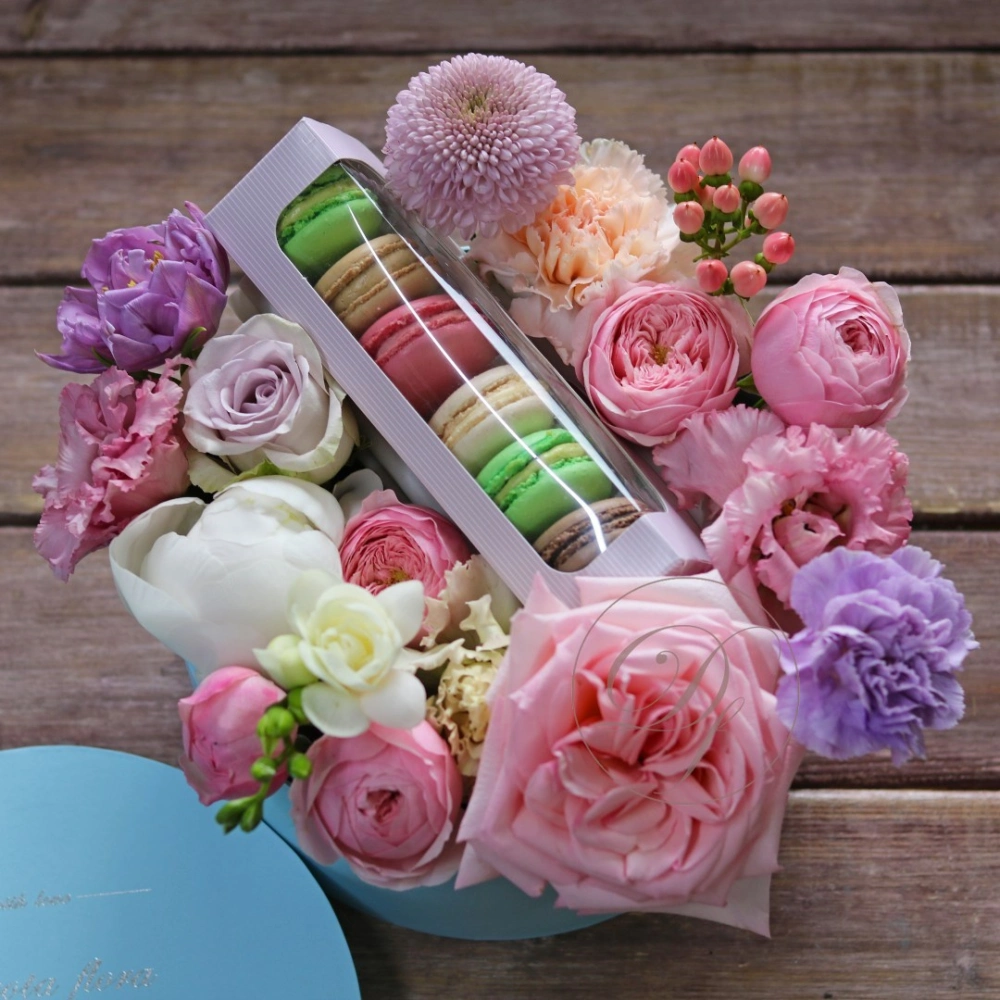 Авторские цветочные композиции в элегантных коробках различных форм, цветов, размеров, с добавлением сладостей в виде: баночки меда peroni, французских пирожных macarons, имбирных пряников и свежих ягод.